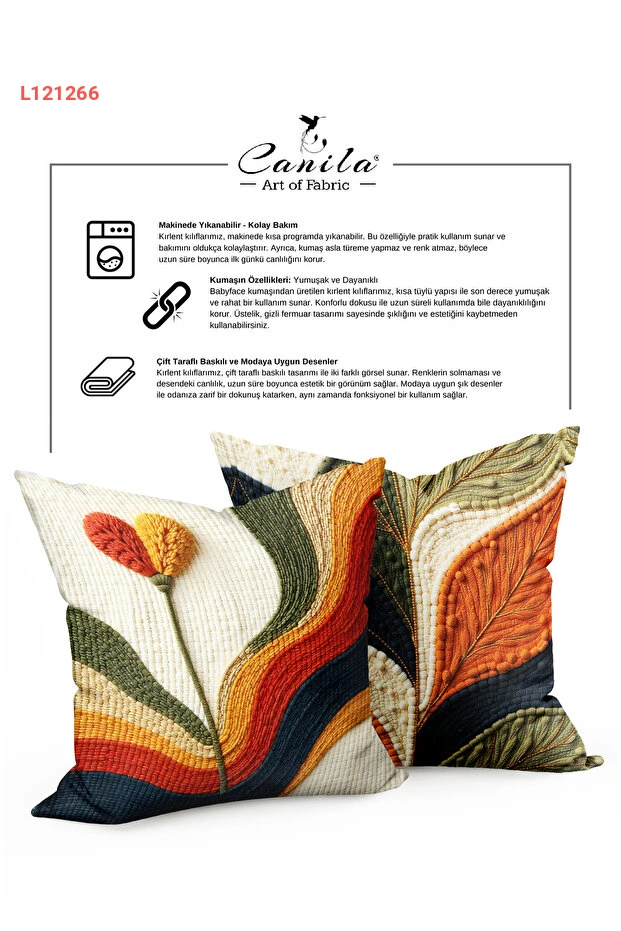 استمتع بأناقة وراحة مع مجموعة CANİLA الملونة من أغطية الوسائد المزخرفة بالتطريز الرقمي! يأتي هذا السيت المزدوج ذو الجهتين بتصميمات عصرية تضفي لمسة من الحيوية على أي مكان، مما يجعله مثالياً لتزيين غرف المعيشة أو النوم. اجعل كل زاوية تتألق بالألوان والأنماط الفريدة التي تعكس ذوقك الرفيع.