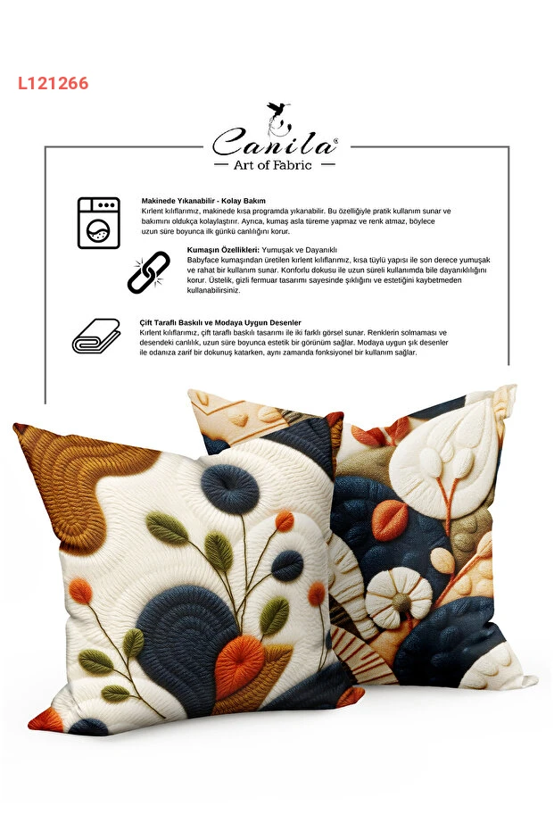 استمتع بجماليات فريدة مع كيس المخدة CANİLA بتصميمه المعاصر بالأزرق الداكن والأبيض المزخرف. يتميز بطبعة رقمية عالية الجودة على كلا الوجهين، مما يجعله مثاليًا لإضفاء لمسة أنيقة على أي غرفة. يأتيك في مجموعة من اثنين، ليجمع بين الراحة والجمال في آن واحد!