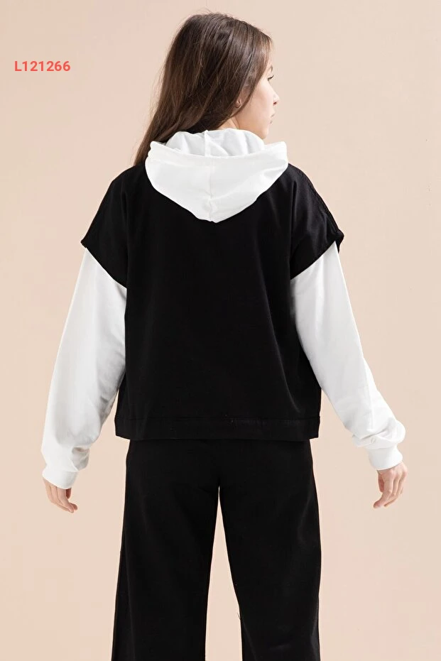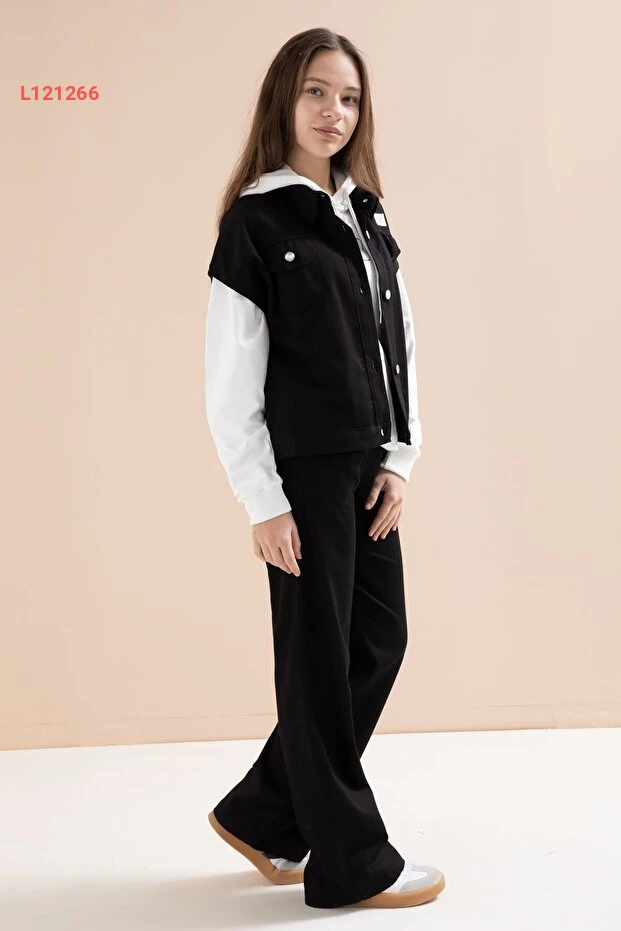طقم بناتي مكون من 3 قطع: سترة بدون أكمام مع بنطلون واسع وقبعة - لون أسود