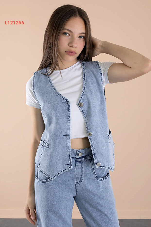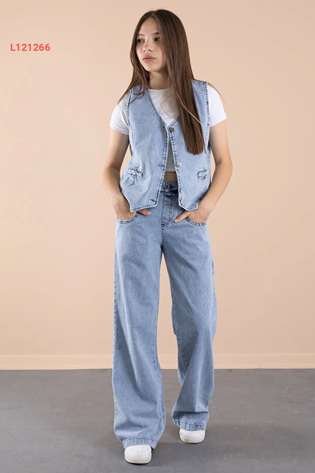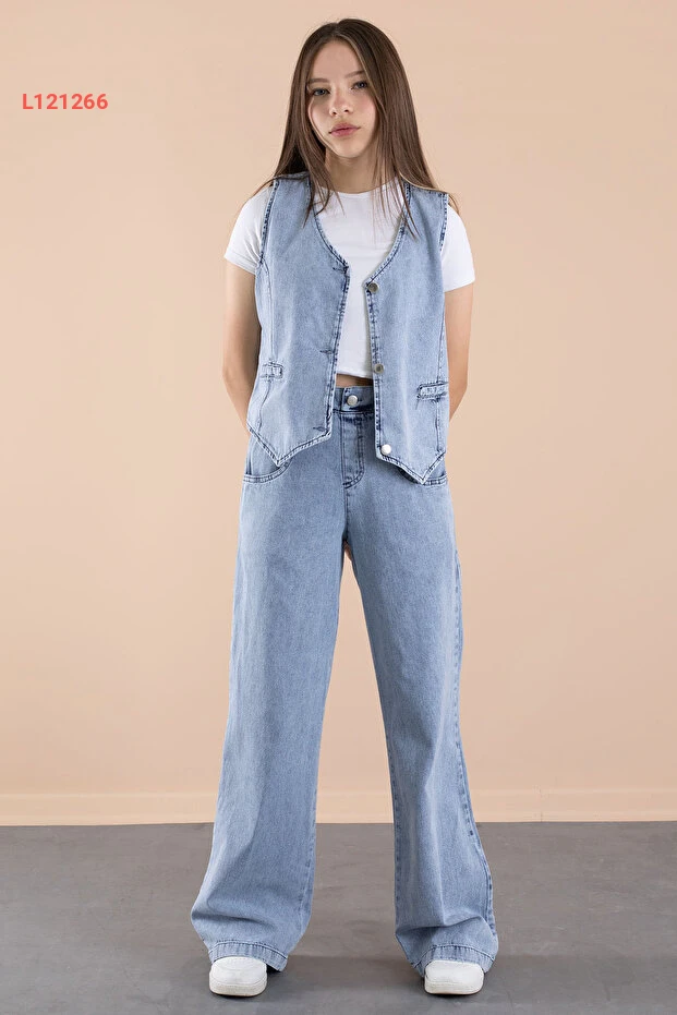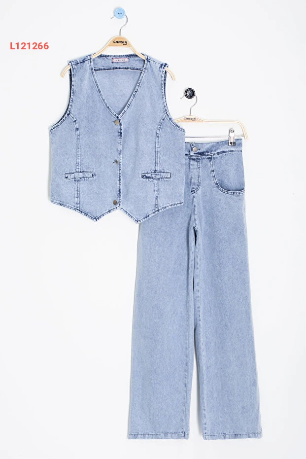 طقم فتيات بنطلون واسع مع سترة جينز مزودة بأزرار زرقاء