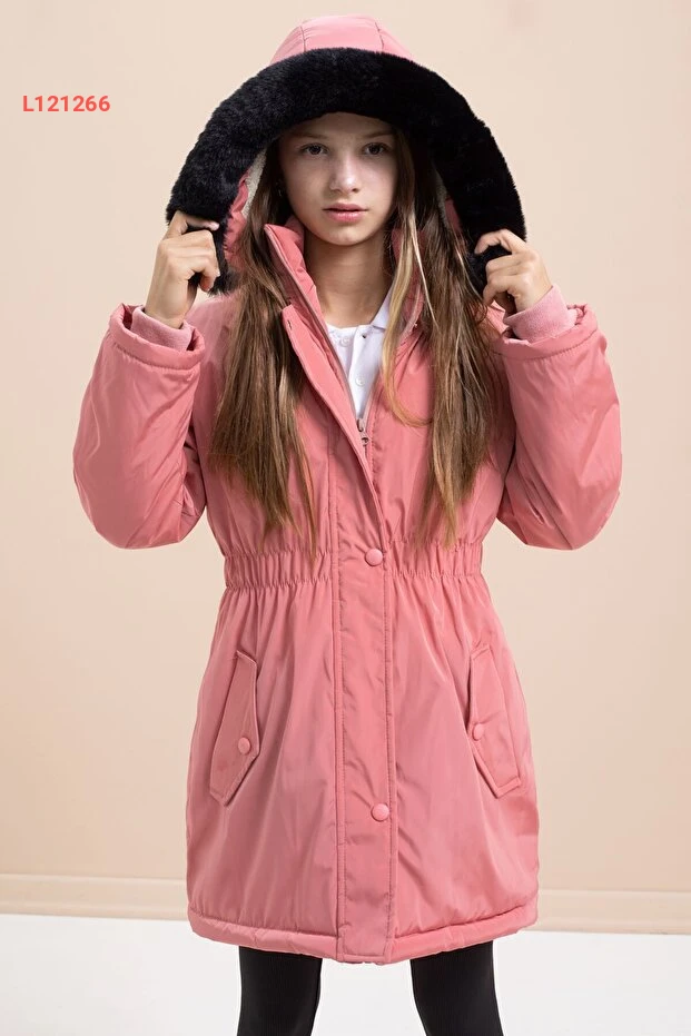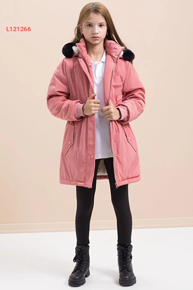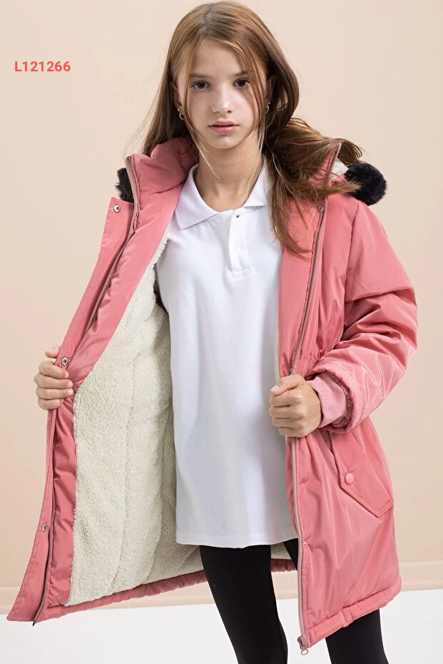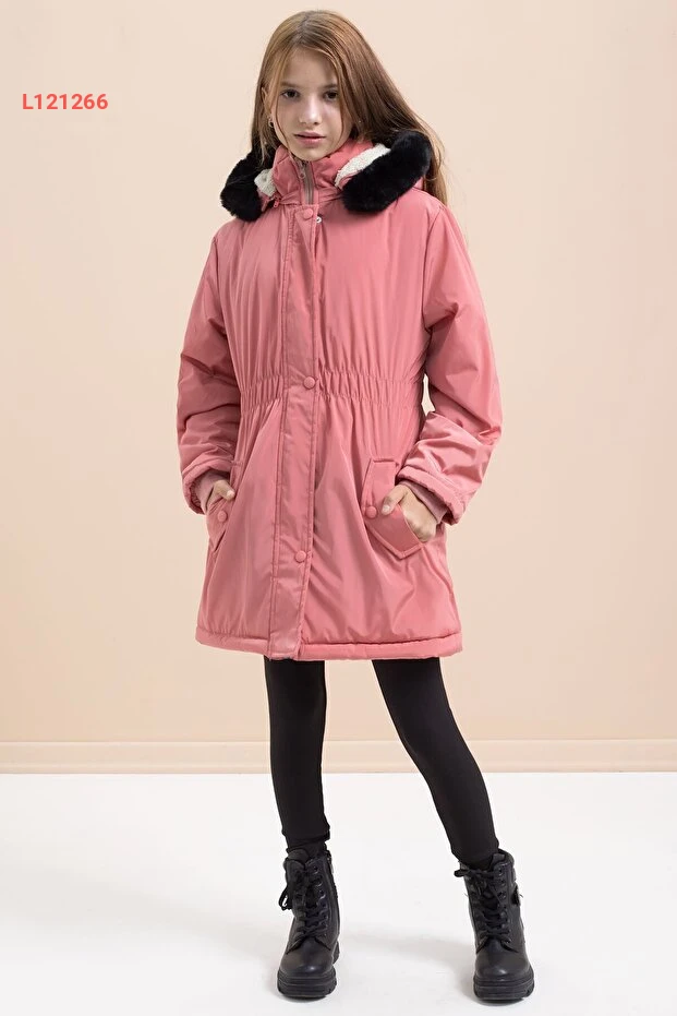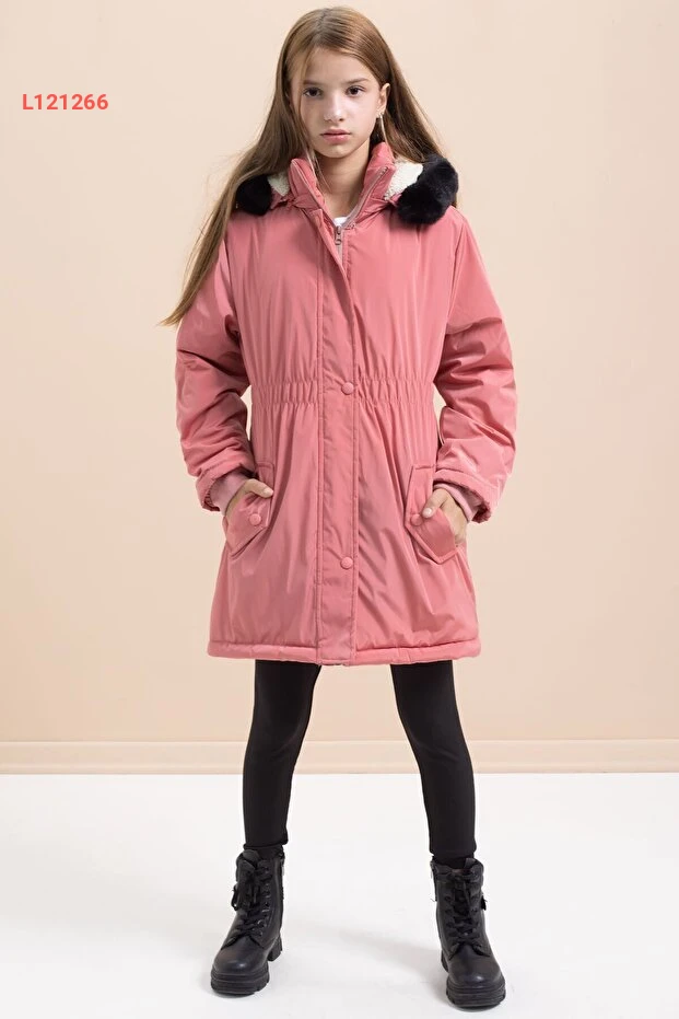 معطف فتيات كاجوال بقبعة و جيوب مرنة من قنسين بزخرفة وردية و بطانة فرو 21309