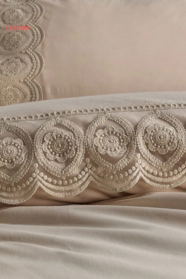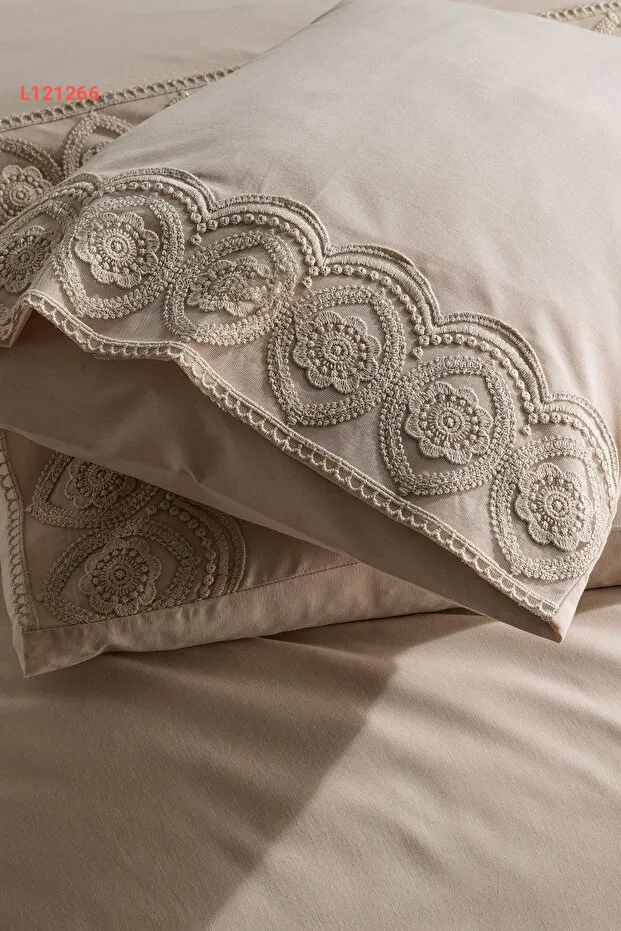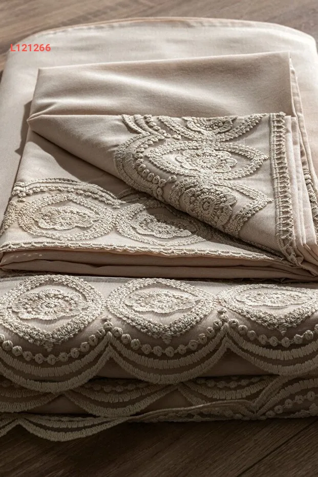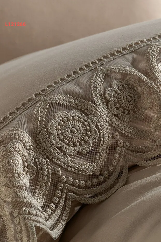 استمتع بالفخامة والأناقة مع مجموعة أغطية السرير "Ceylin" المزينة بدانتيل فرنسي رائع. يأتي هذا الطقم بلون الكابتشينو الأنيق، ما يجعله خيارًا مثاليًا لإضافة لمسة جذابة إلى غرفة نومك. مصنوع من خامات عالية الجودة، يضمن لك راحة فريدة وأناقة دائمة في كل ليلة من لياليك.