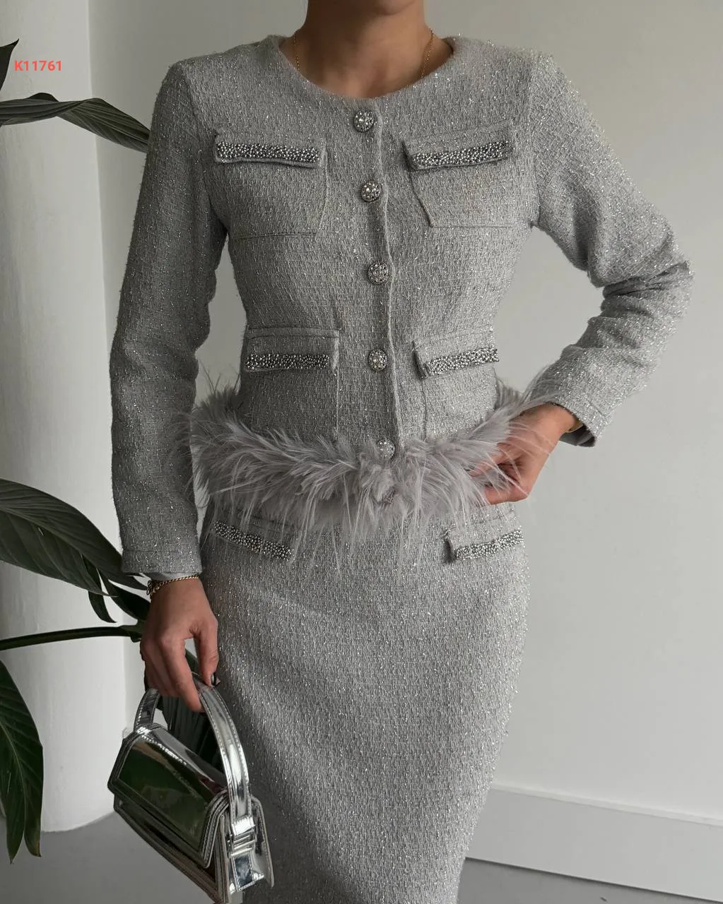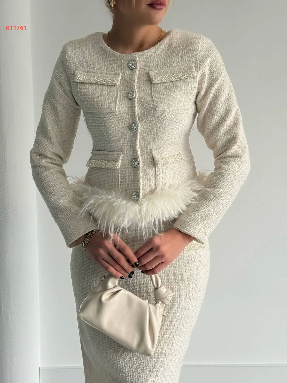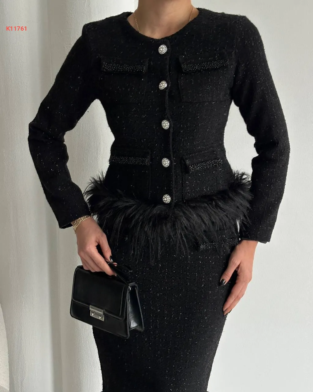 طقم تنورة شانيل طويل مع فرو