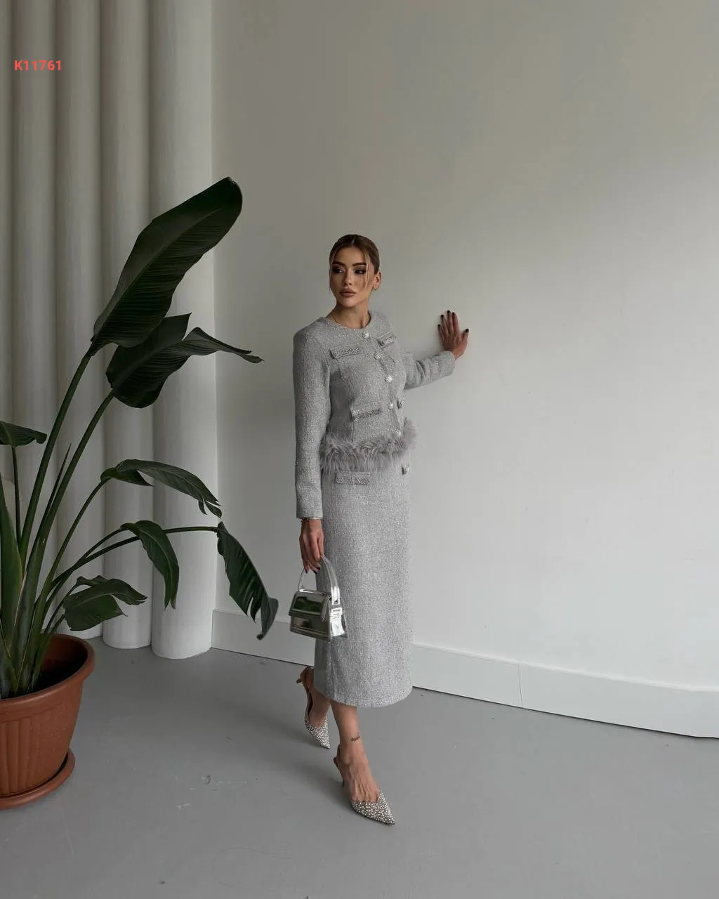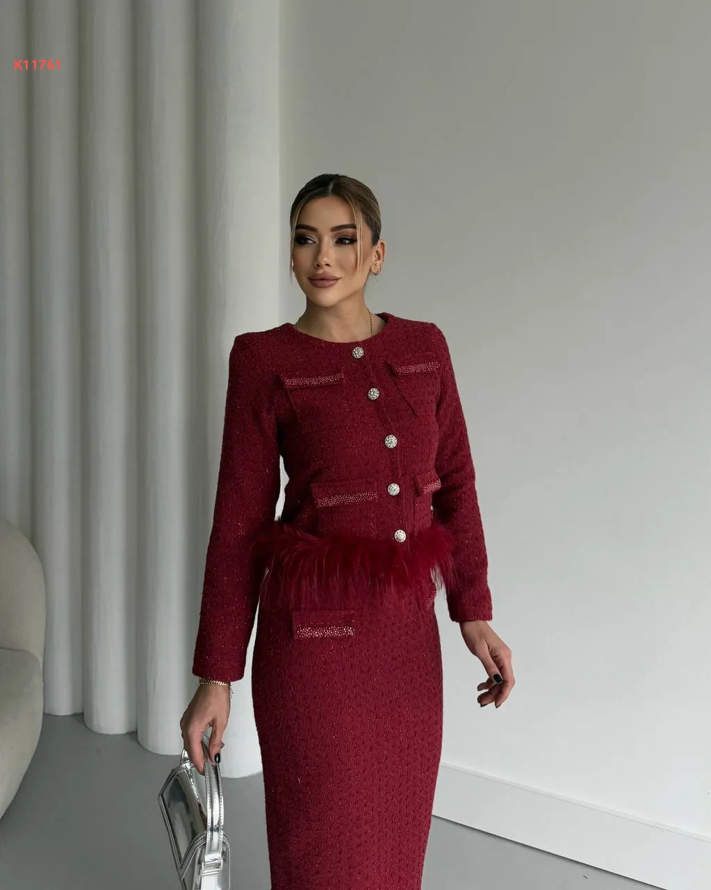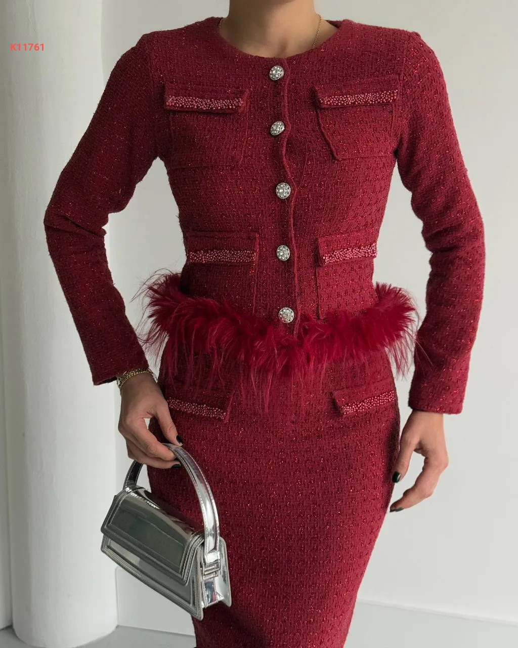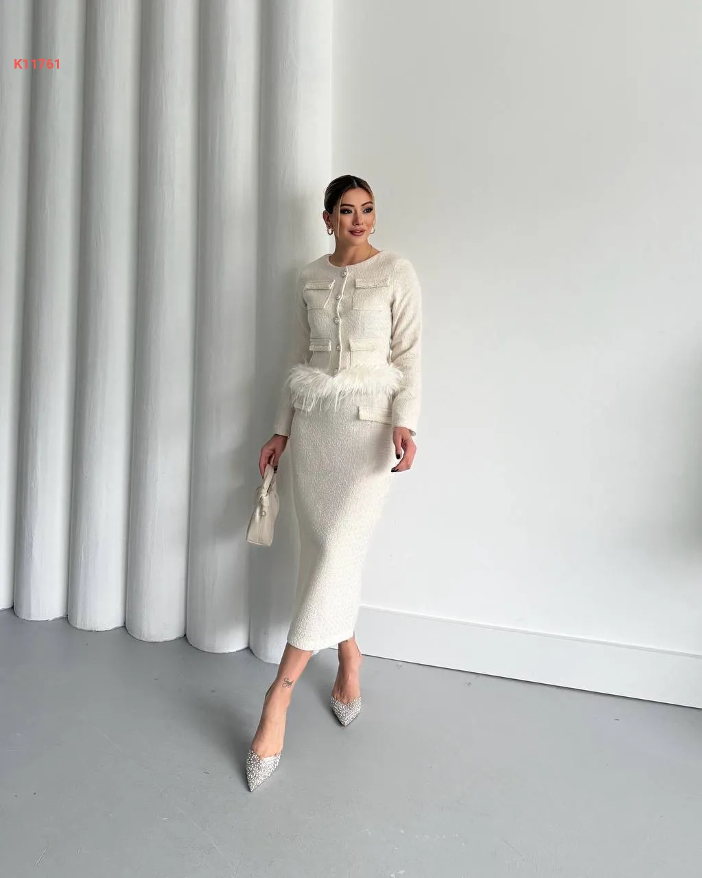 طقم تنورة شانيل طويل مع فرو