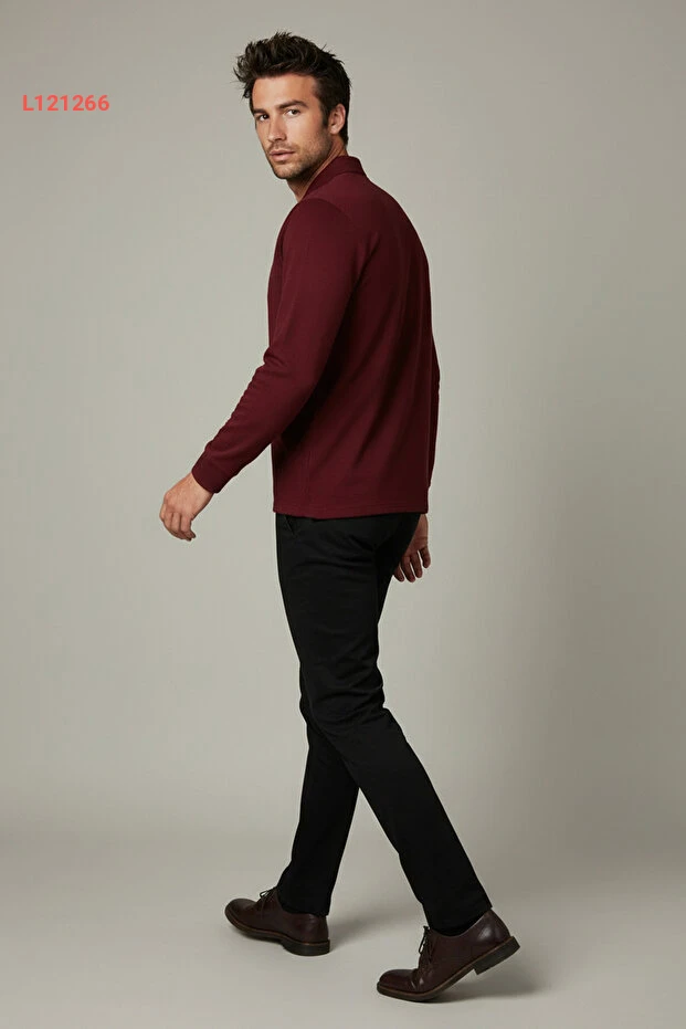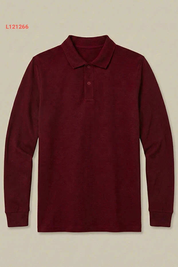 تيشيرت بولو طويل الأكمام من 100% قطن باللون الماروني - مثالي للمدرسة واليوميات