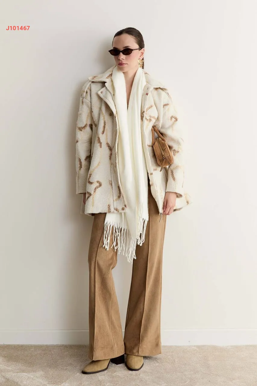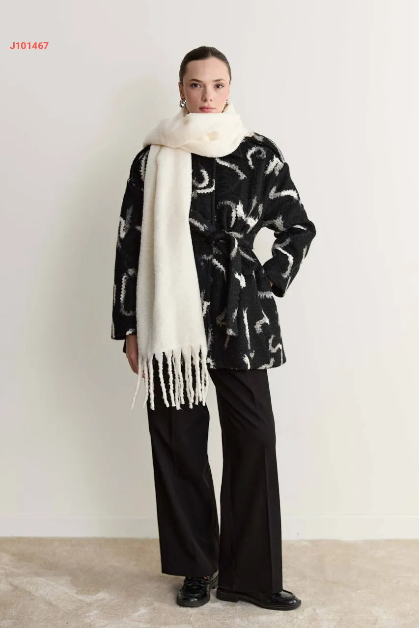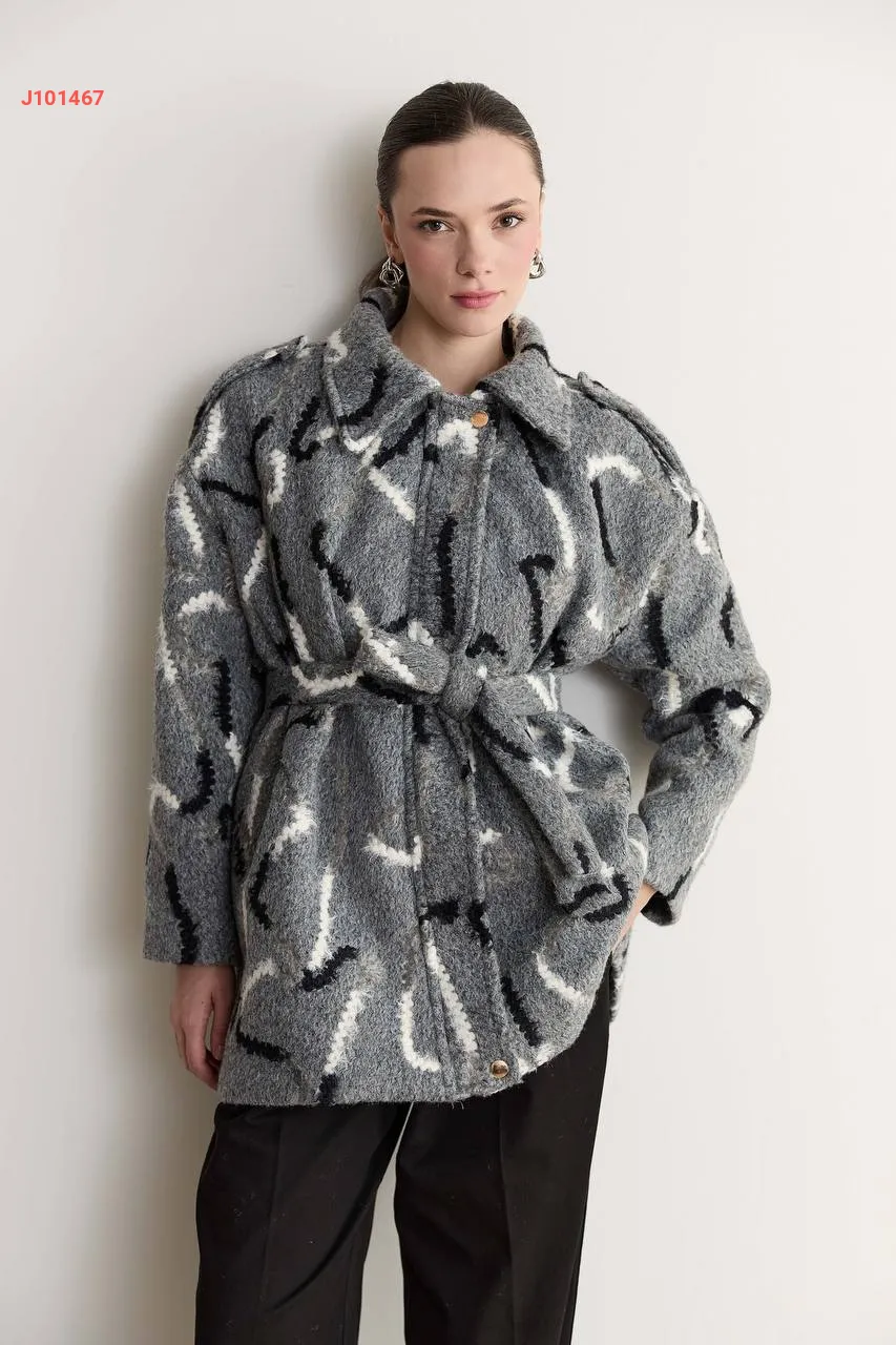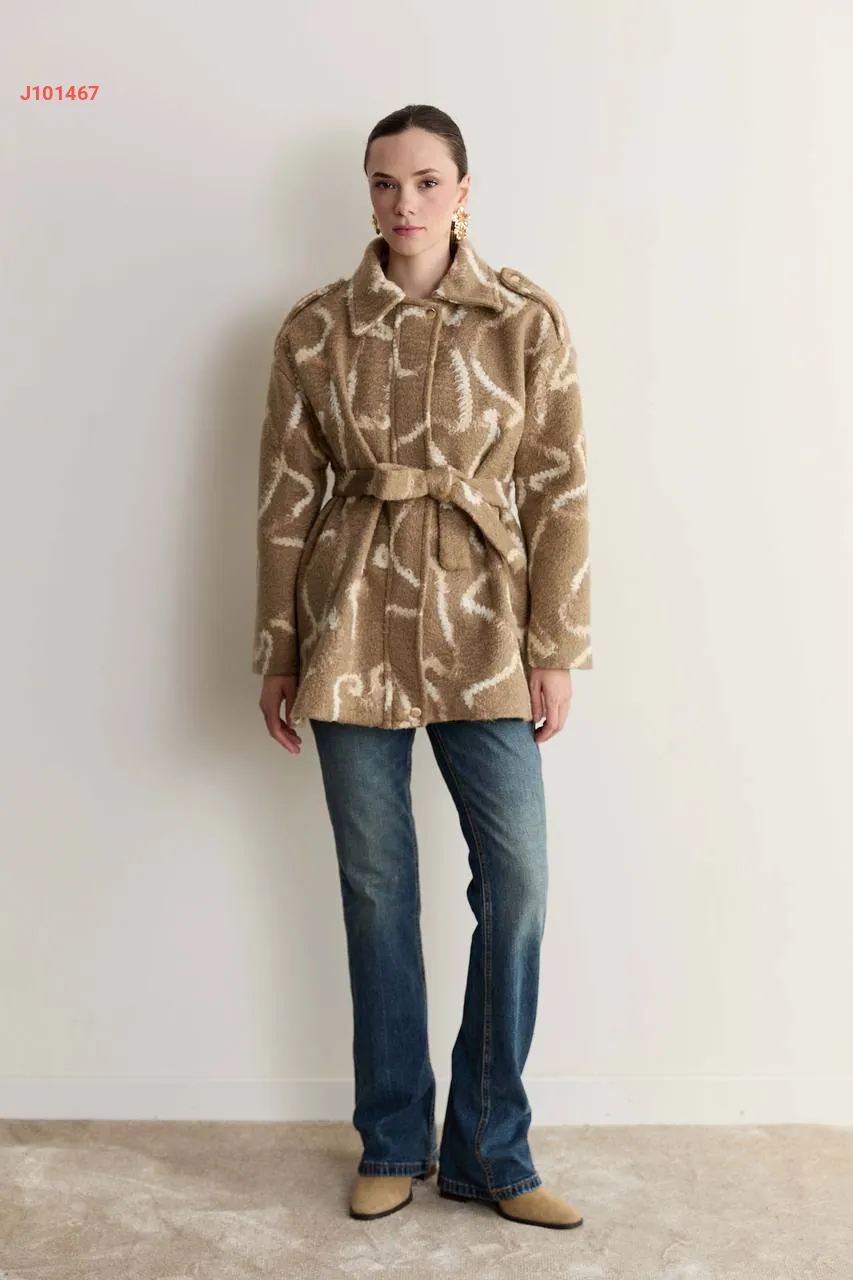 جاكيت قصير منقوش ، سحاب مخفي،مع حزام