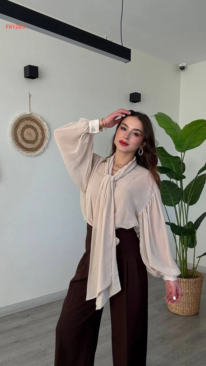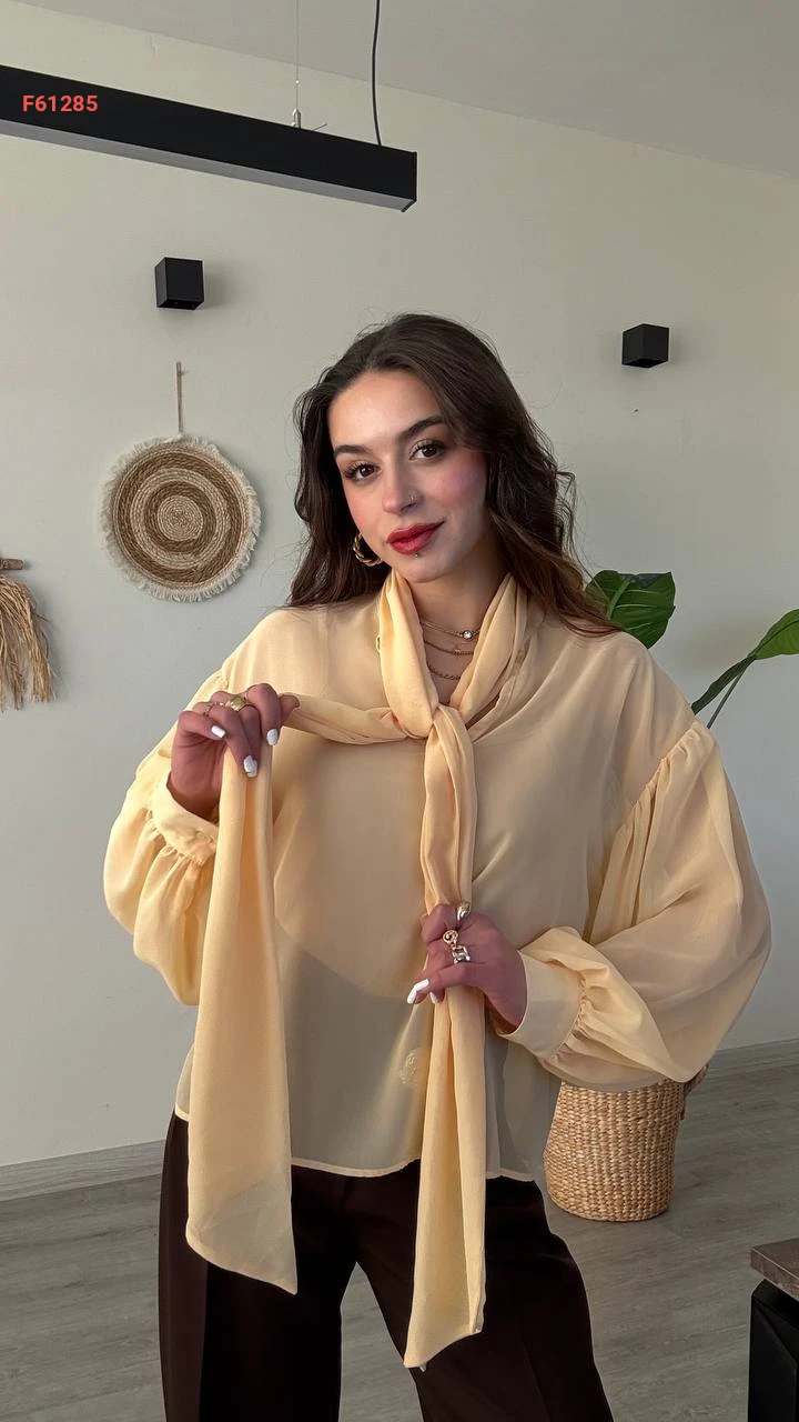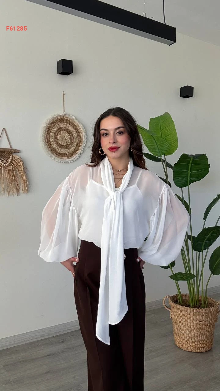 بلوزة شيفون بأكمام بالونية وربطة عنق