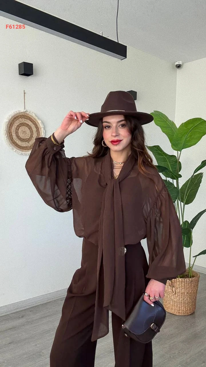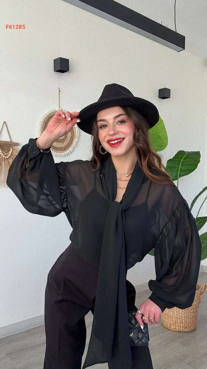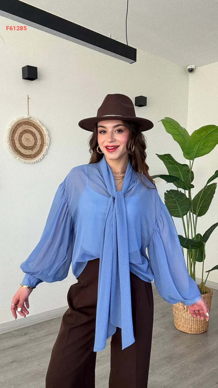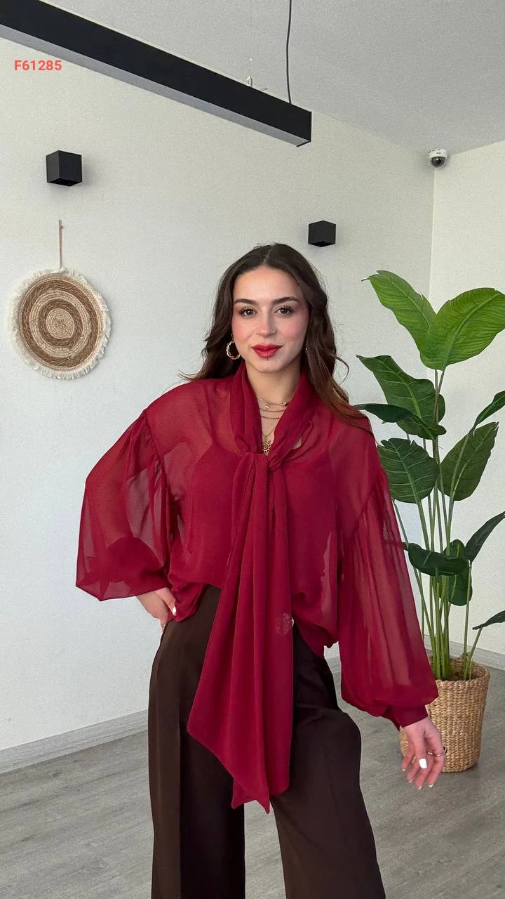 بلوزة شيفون بأكمام بالونية وربطة عنق