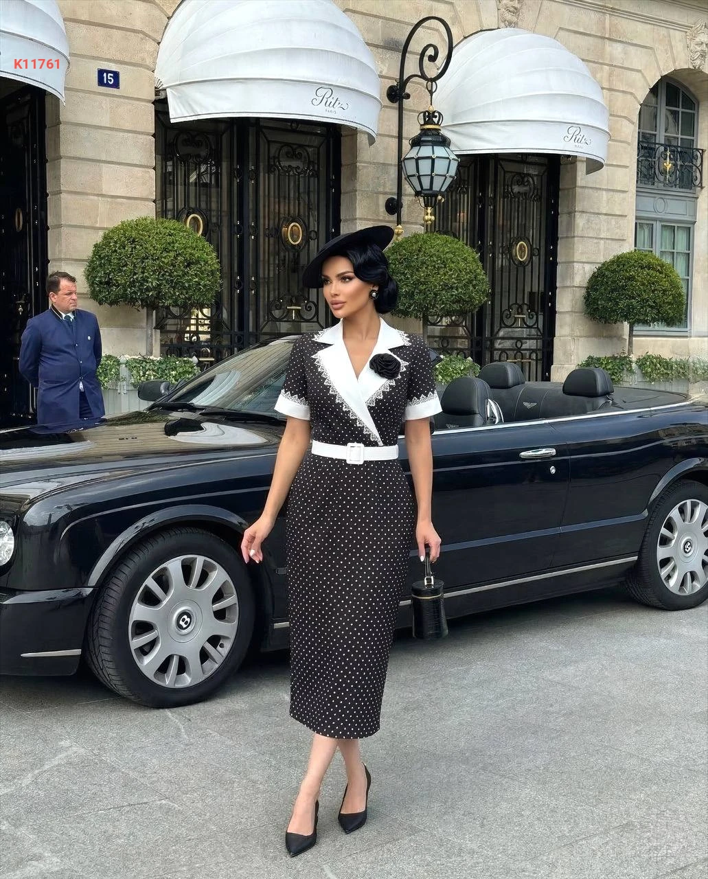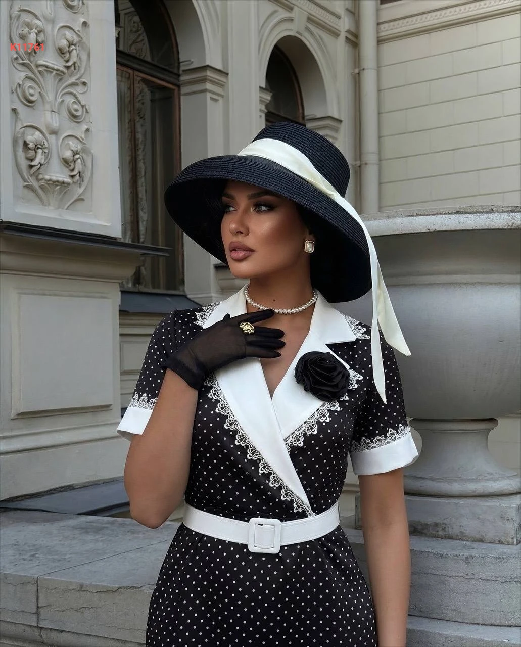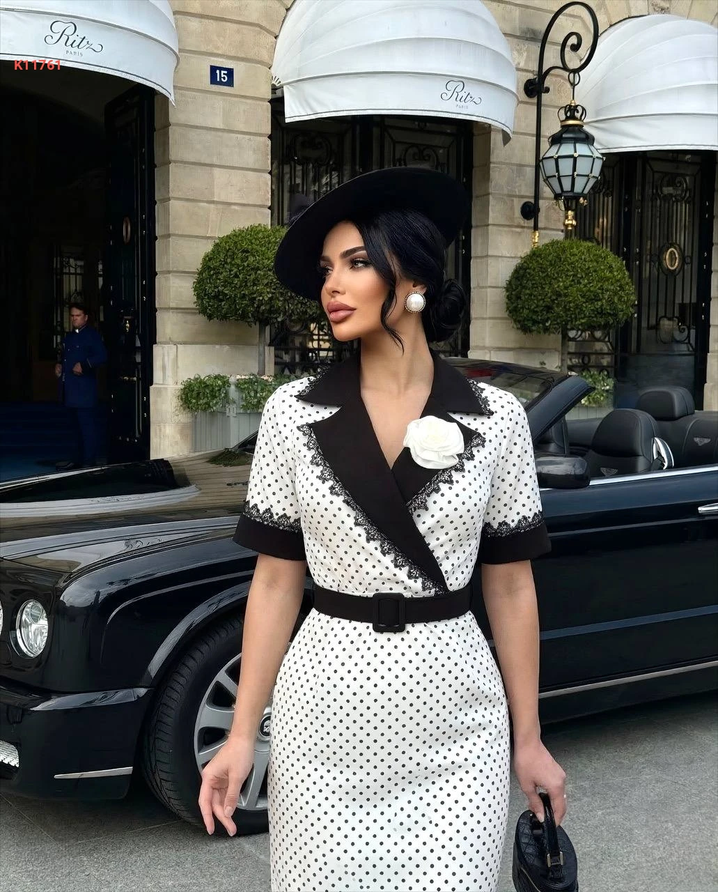 فستان كلاسيك منقط بياقة مطرزة دانتيل