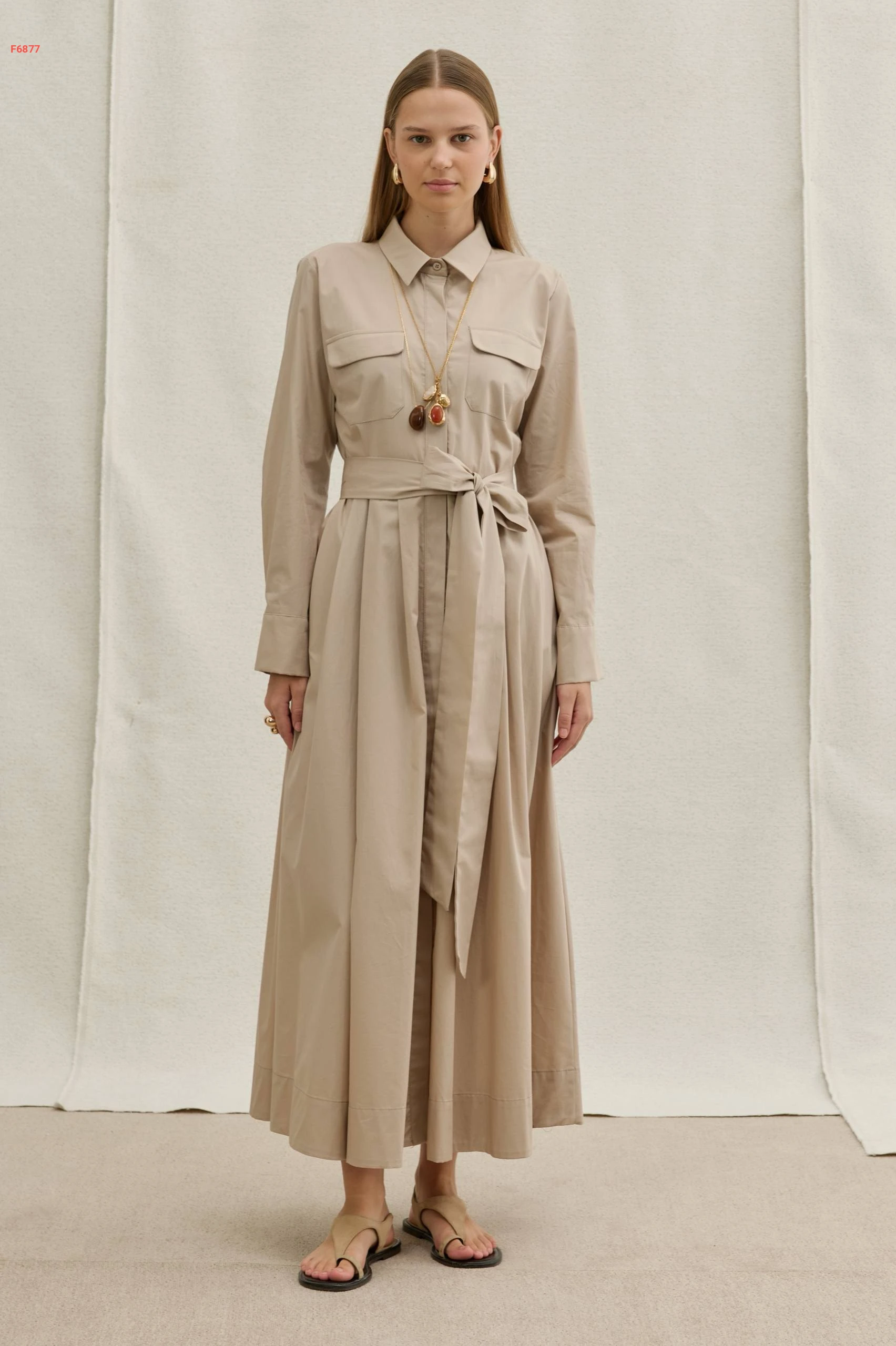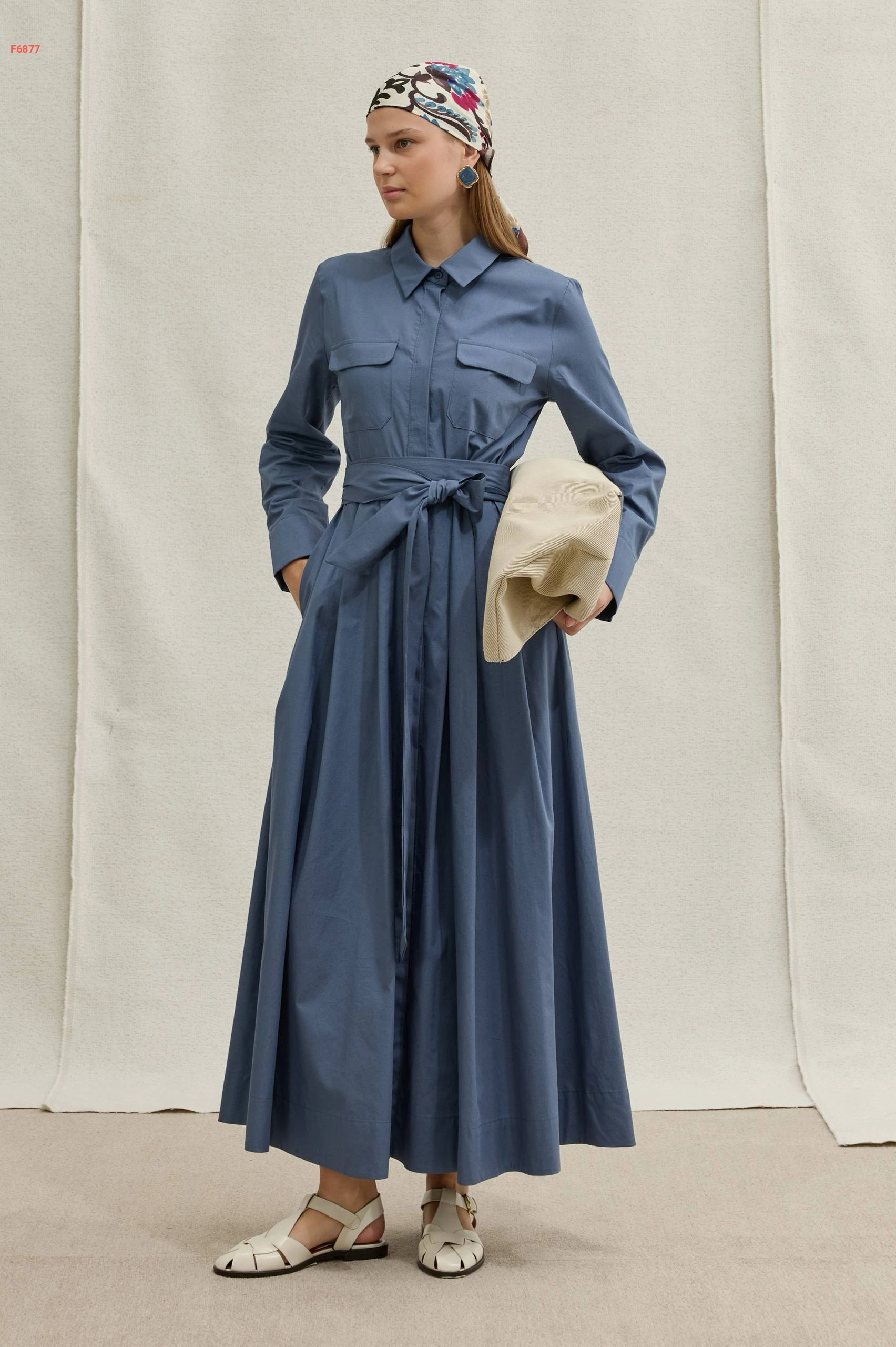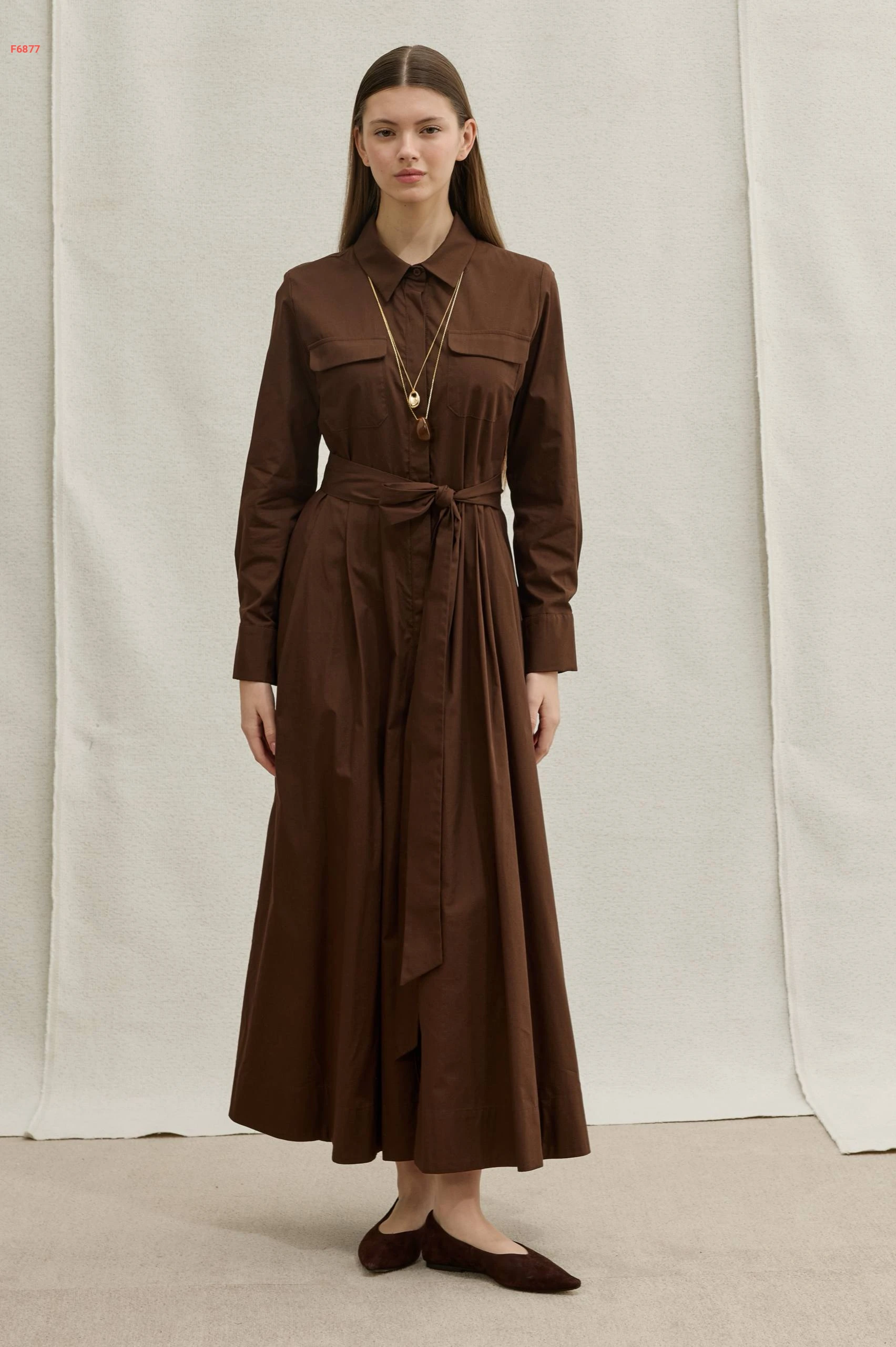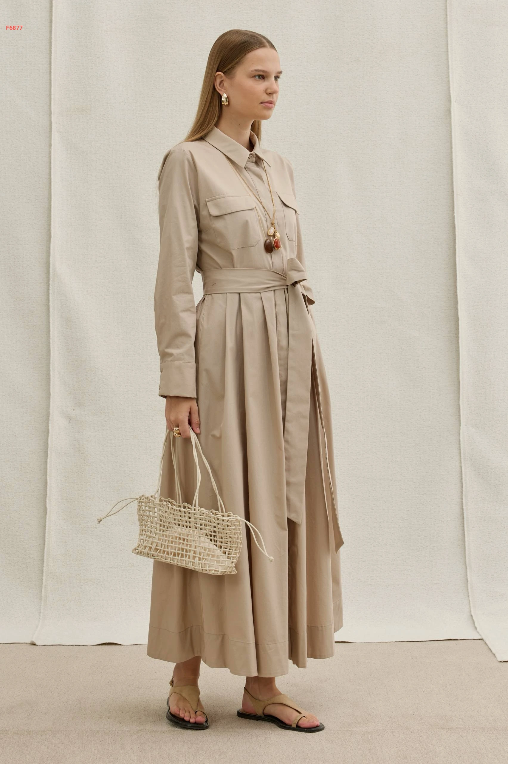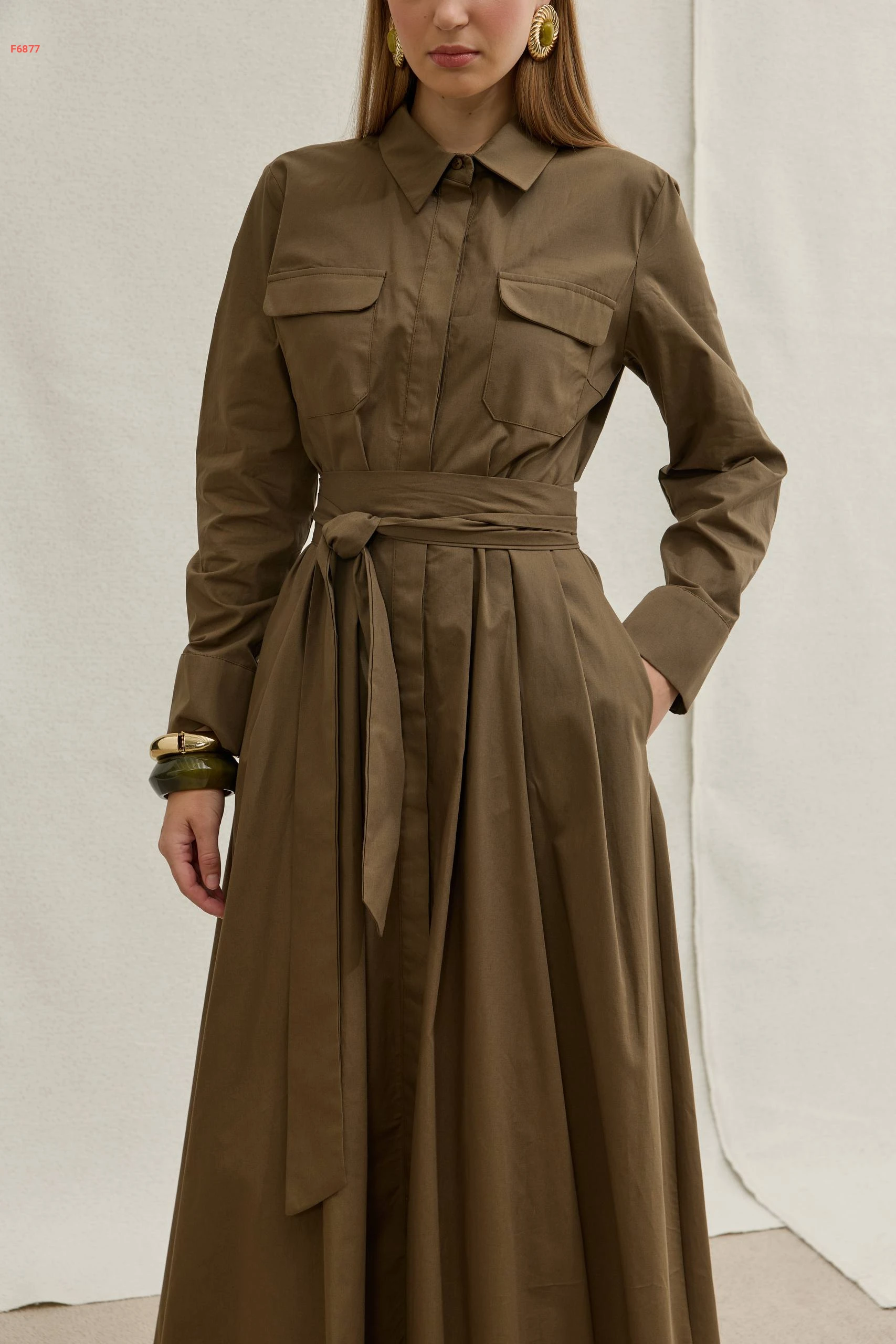 فستان "ماكسي" كلاسيكي بتصميم القميص، يتميز بأكمام طويلة وجيوب أمامية مع حزام قماشي يحدد الخصر
