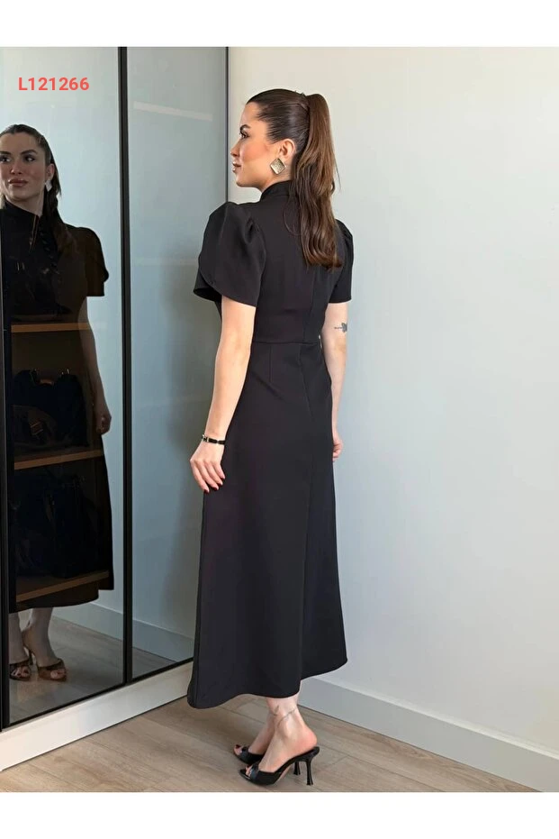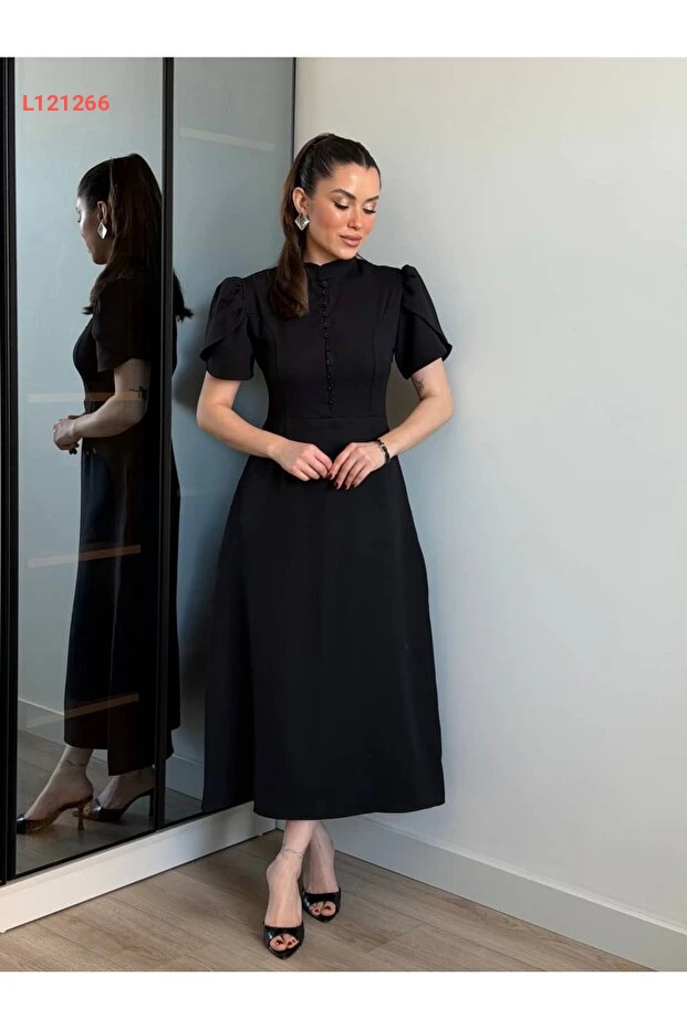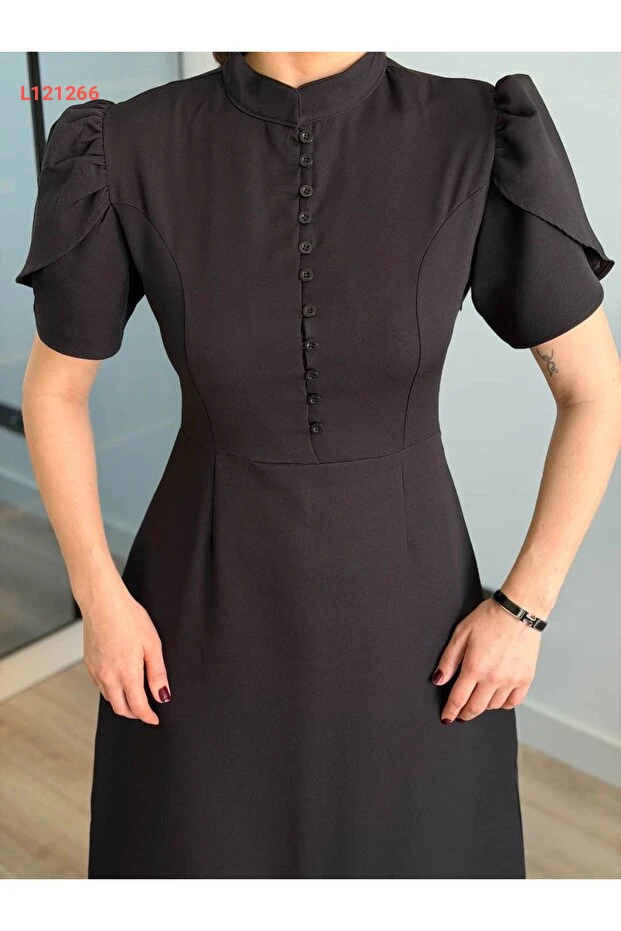 فستان بالنساخة العصرية بأكمام بالون وزرّات بأسلوب جذاب