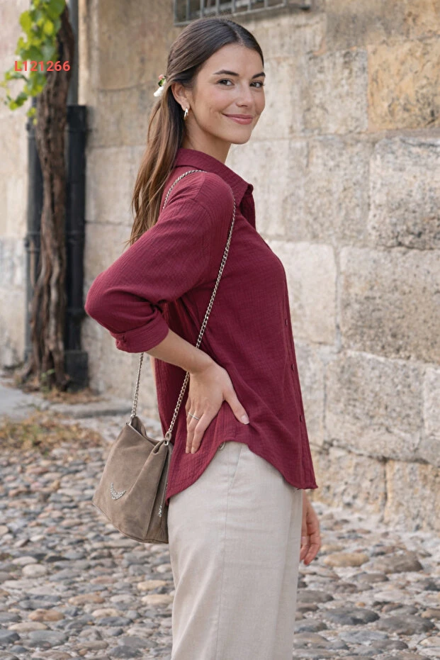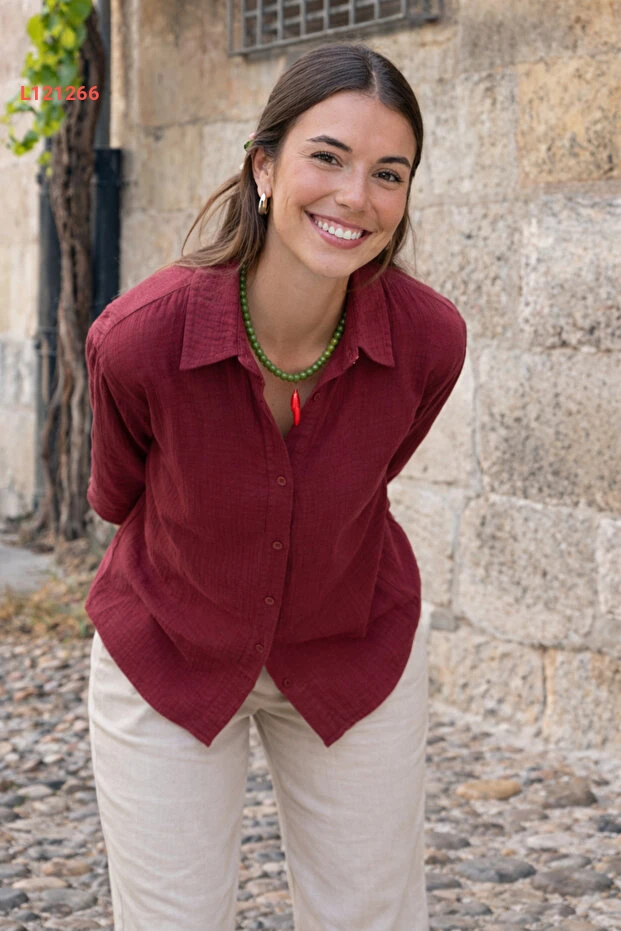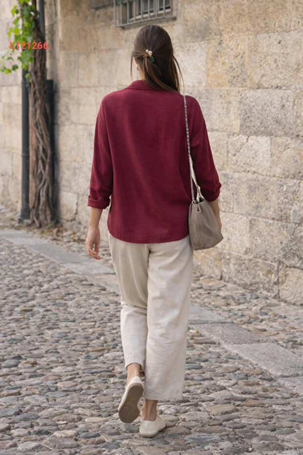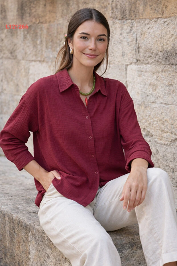 قمصان بوردو نسائية طويلة الأكمام مصنوعة من القطن بتصميم فضفاض