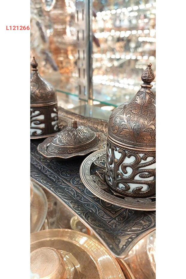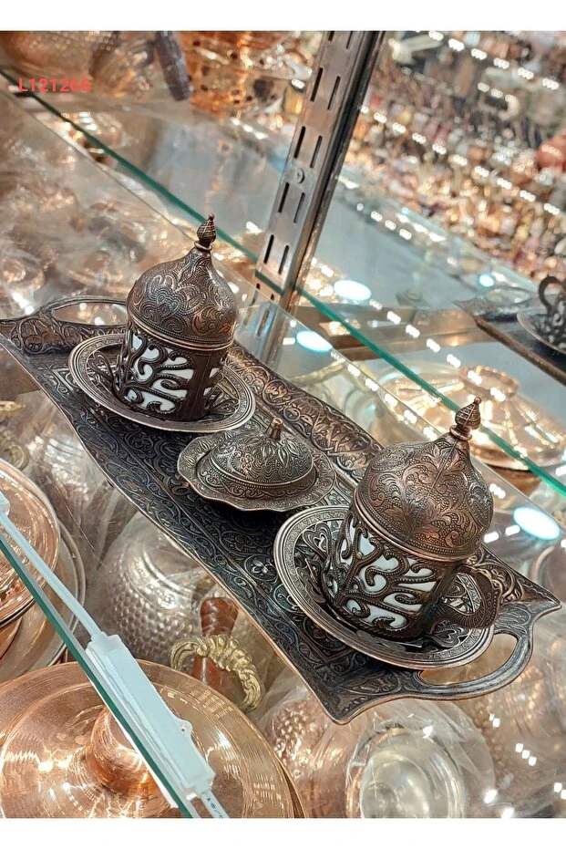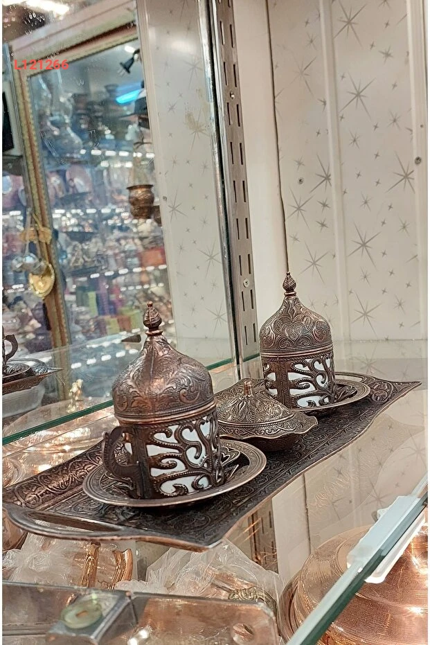 طقم فناجين تركي من النحاس للزوجين بتصميم عثماني فضي