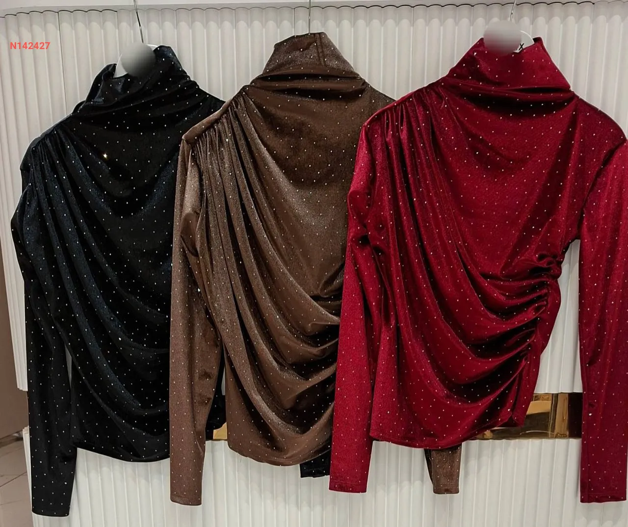 بلوزة مخمل مجمعة بتفاصيل حجرية