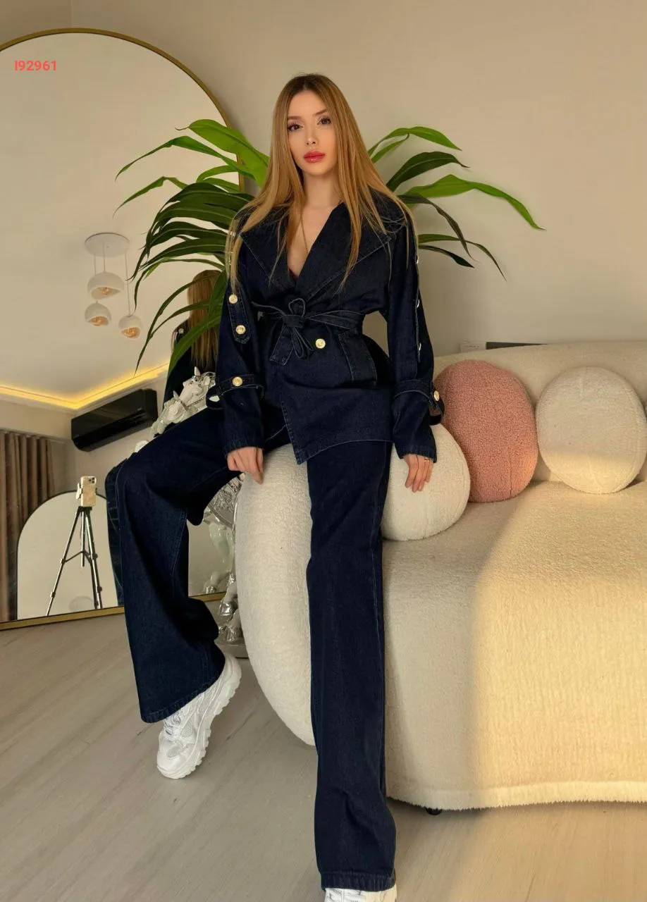 طقم جينز أزرق داكن أكمام بأزرار وحزام على الخصر وجيب