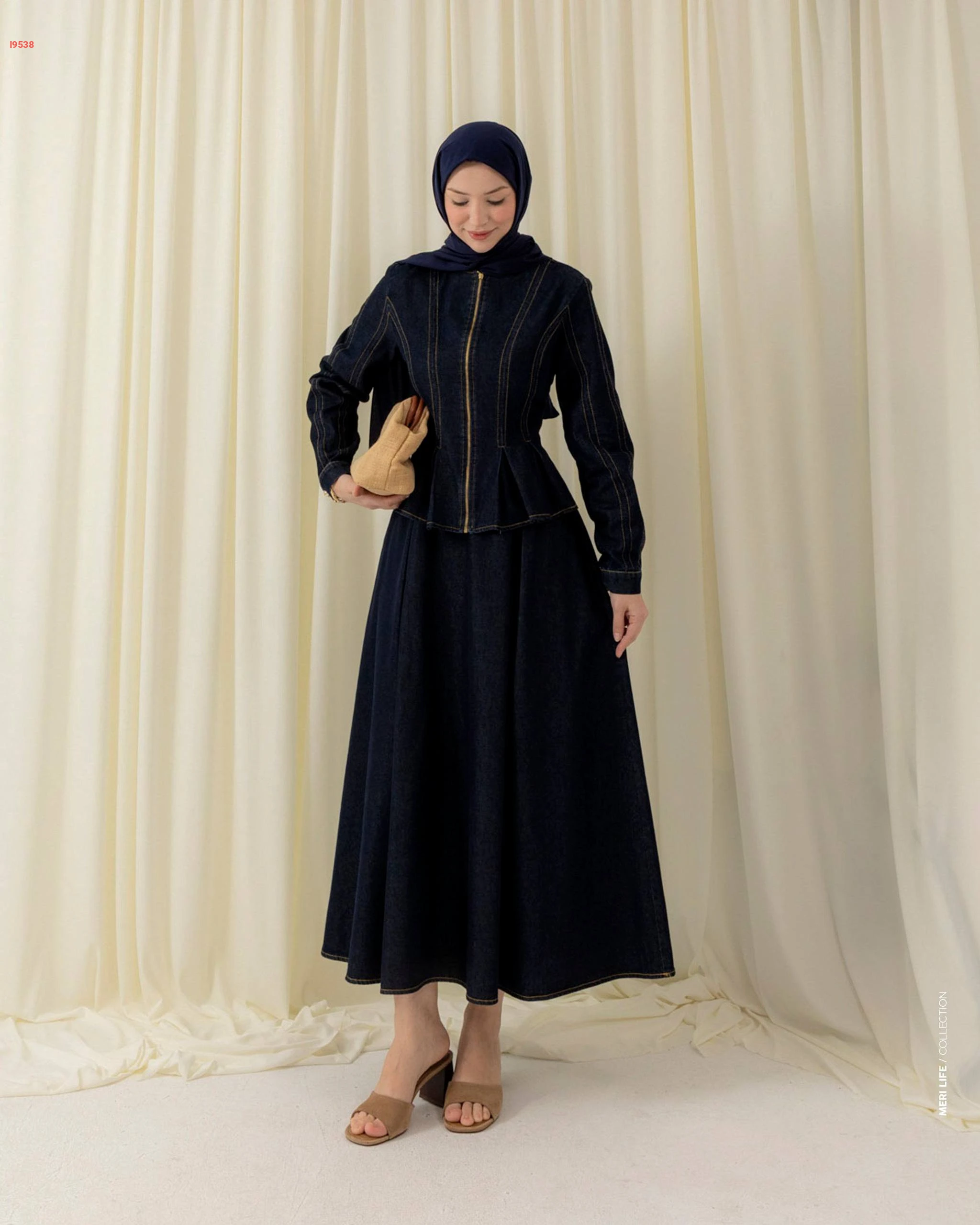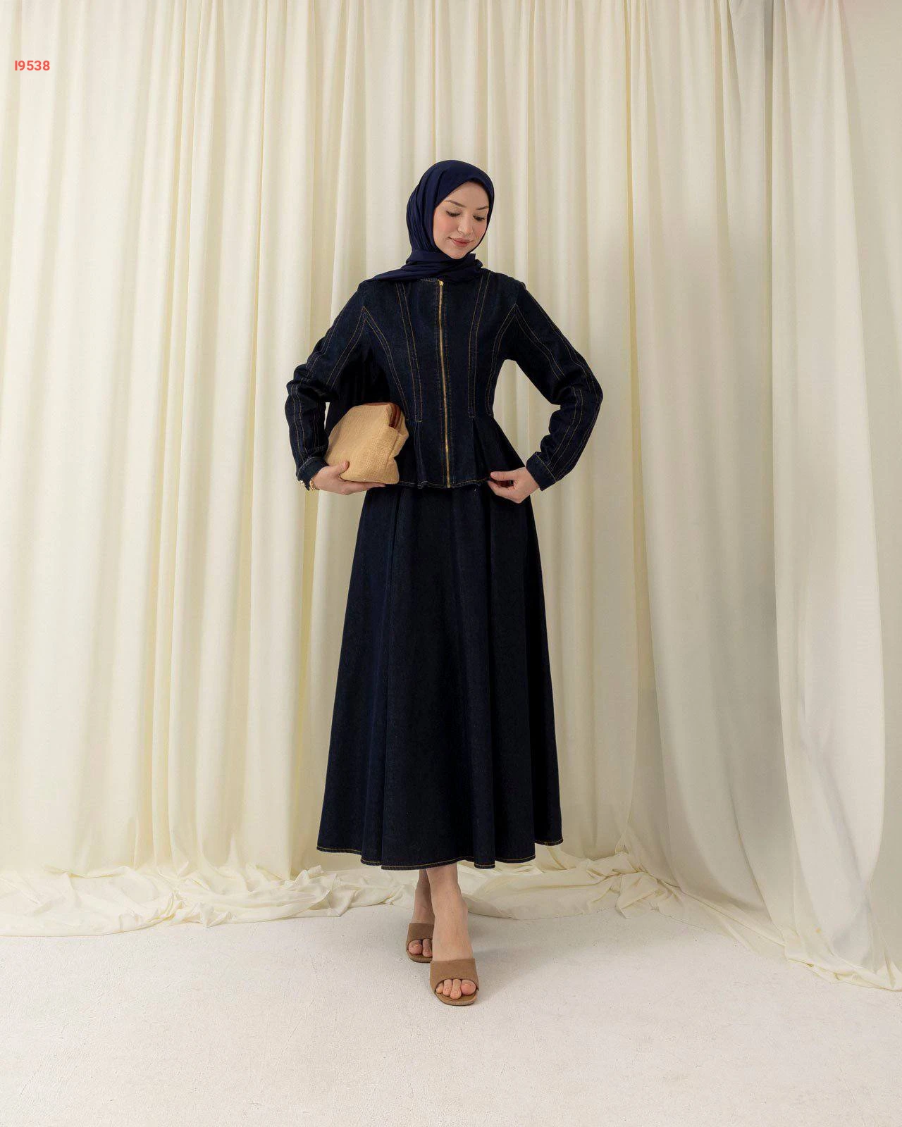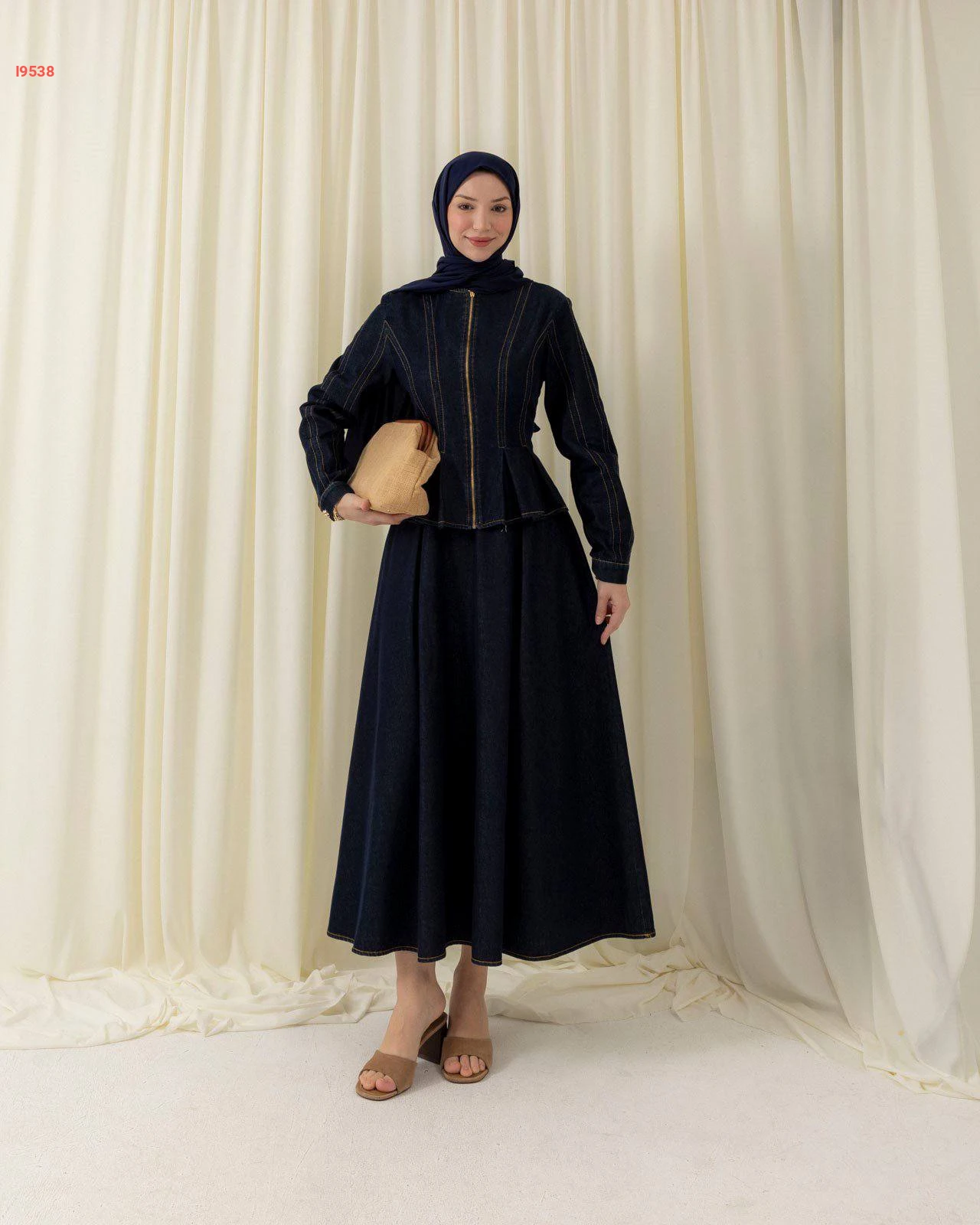 طقم جينز داكن جاكيت قصير بسحاب ذهبي وتنورة واسعة طويلة