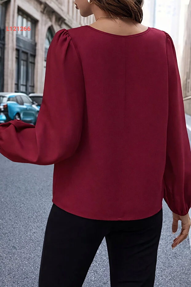 بلوزة كريب بولو بياقة عميقة وأكمام منتفخة باللون bordo