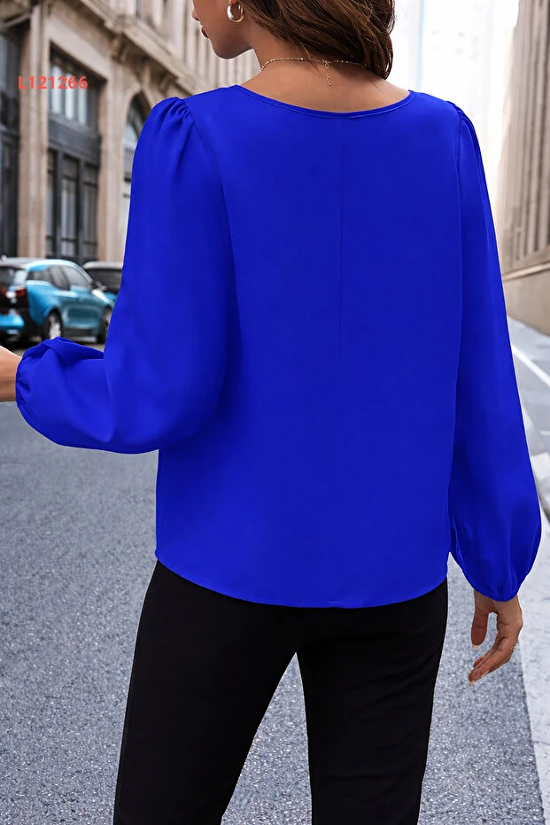 بلوزة كريب باللون الساكس مع ياقة مكشوفة وأكمام بالون
