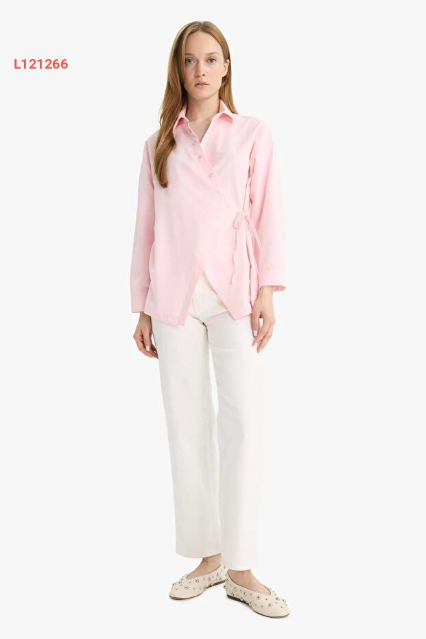 قميص تونيك طويل الأكمام برباط أمامي من ديفاكتو بخامة بوبلين