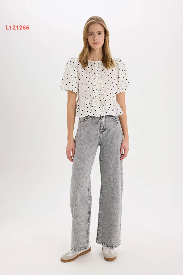 استمتعي بأناقتك مع بلوزة Defacto ذات الياقة المستديرة والمزين بنقوش البولكا دوت! تصميمها العملي مع الرباط الأمامي يجعلها مثالية لتنسيق مريح وعصري، بينما تضفي خامة البوبلين الخفيفة لمسة من الراحة في أيام الصيف. ارتديها مع جينز أو تنورة وتمتعي بإطلالة أنثوية جذابة!