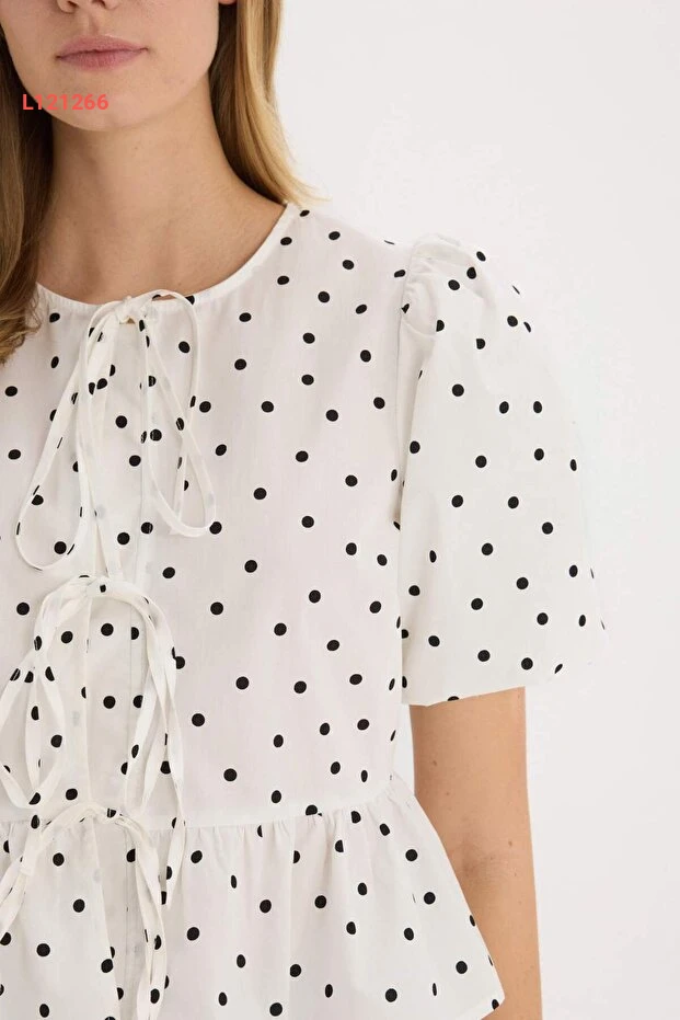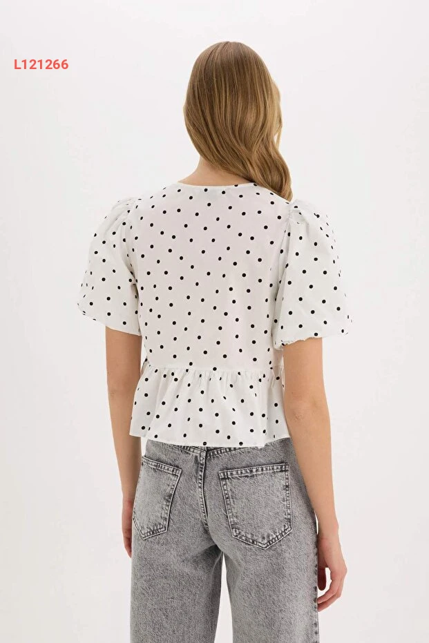 بلوزة قصيرة الأكمام بنقشة بولكا دوت مع ياقة دائرية وقصة مربوطة من ديفكتو