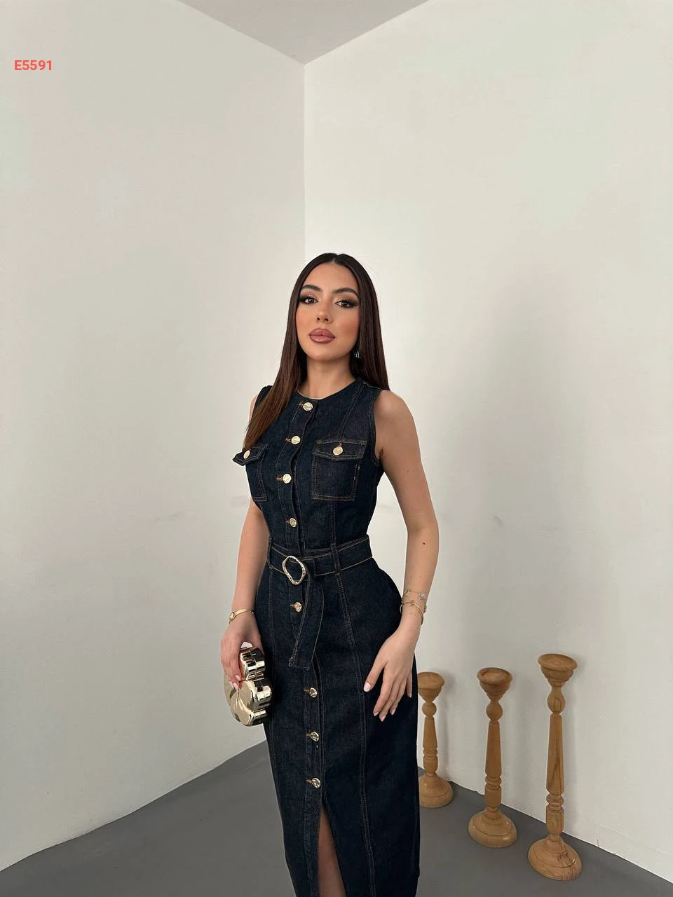فستان جينز حفر بأزرار وزنار