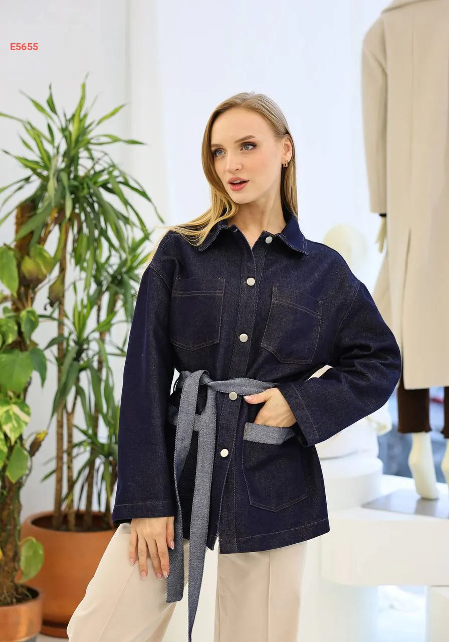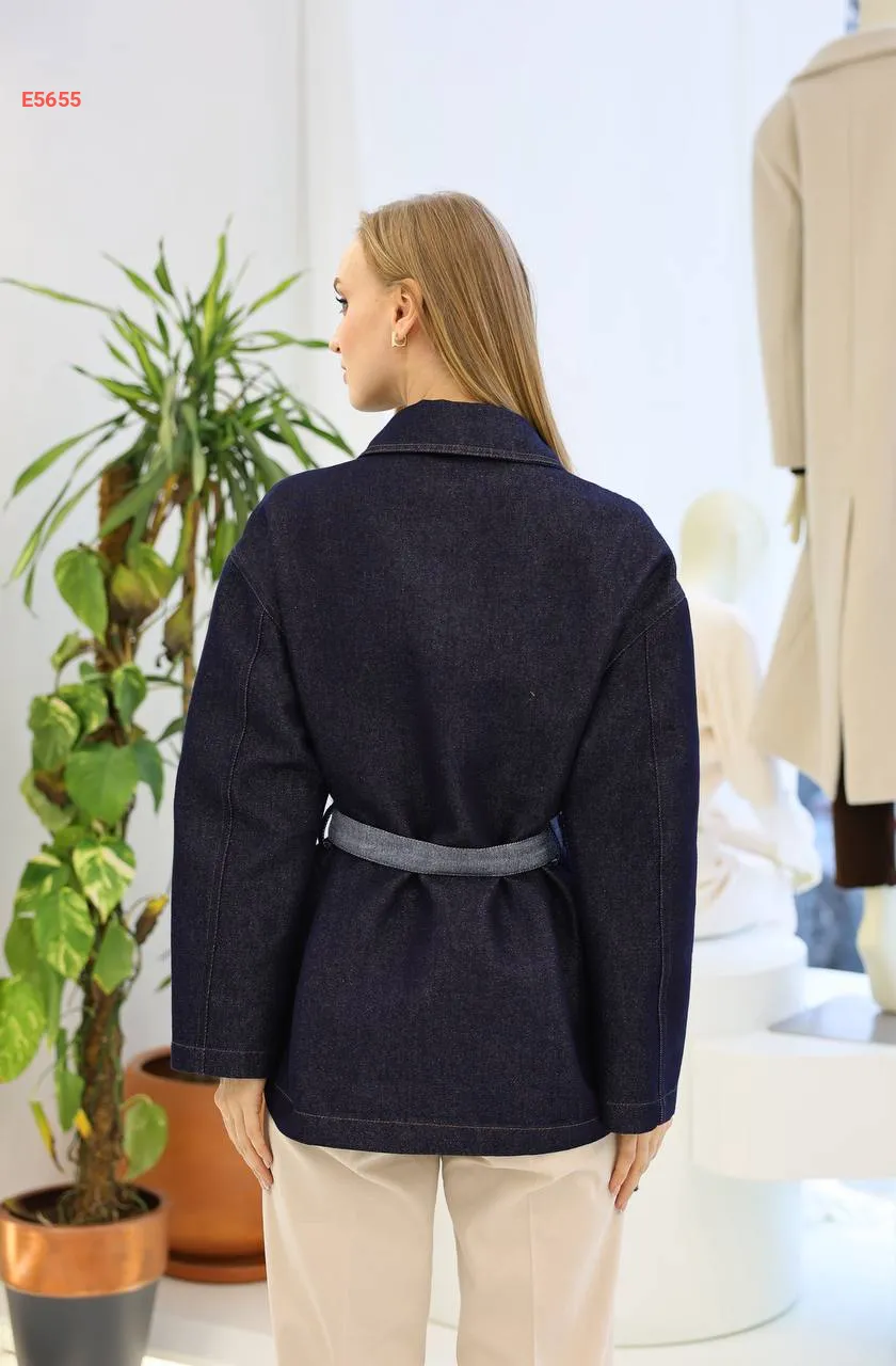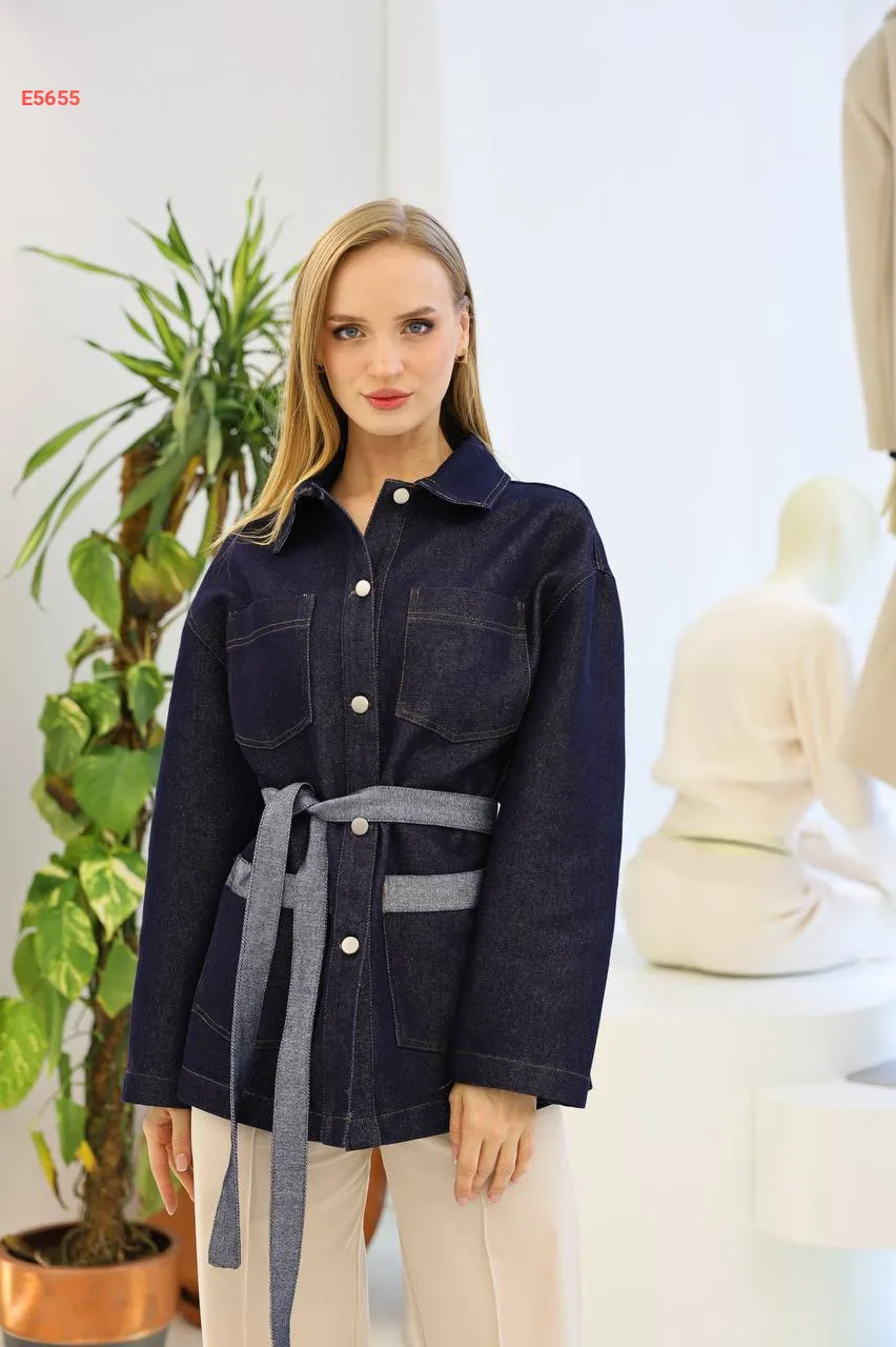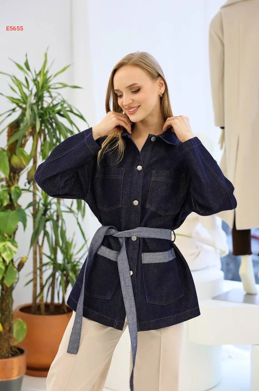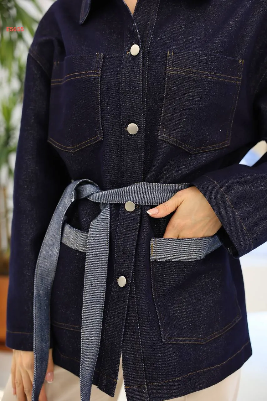 جاكيت جينز يغطي الورك مع زنار وجيب مزدوج