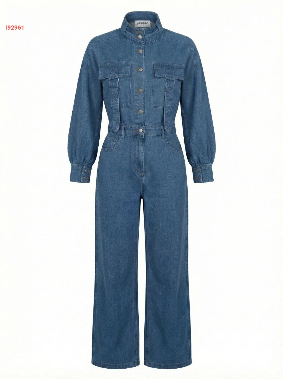 أفرول جينز بأزرار مع جيب بياقة مرتفعة