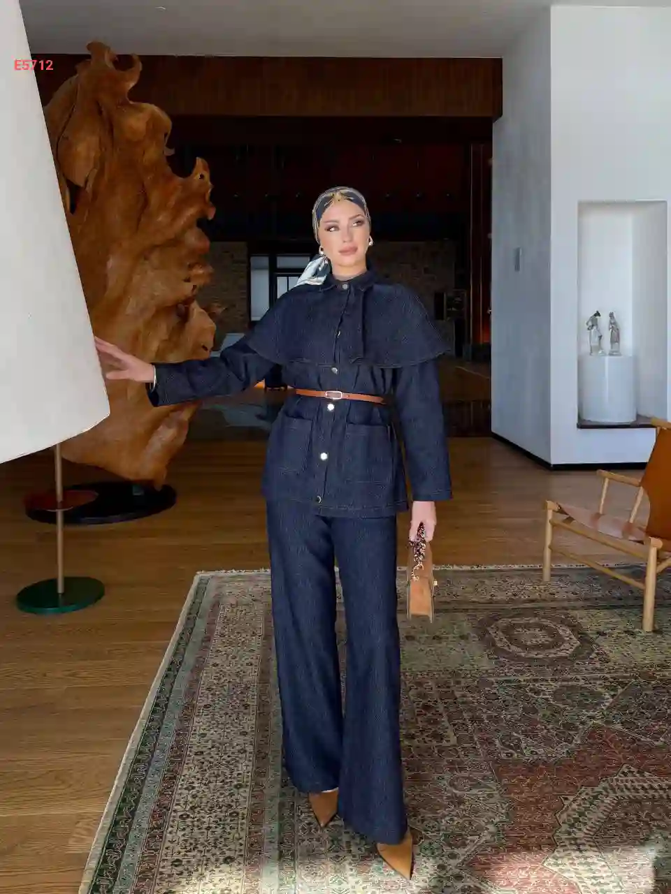 طقم جينز كبس ،جاكيت تريكو من الأمام بأكمام صوف