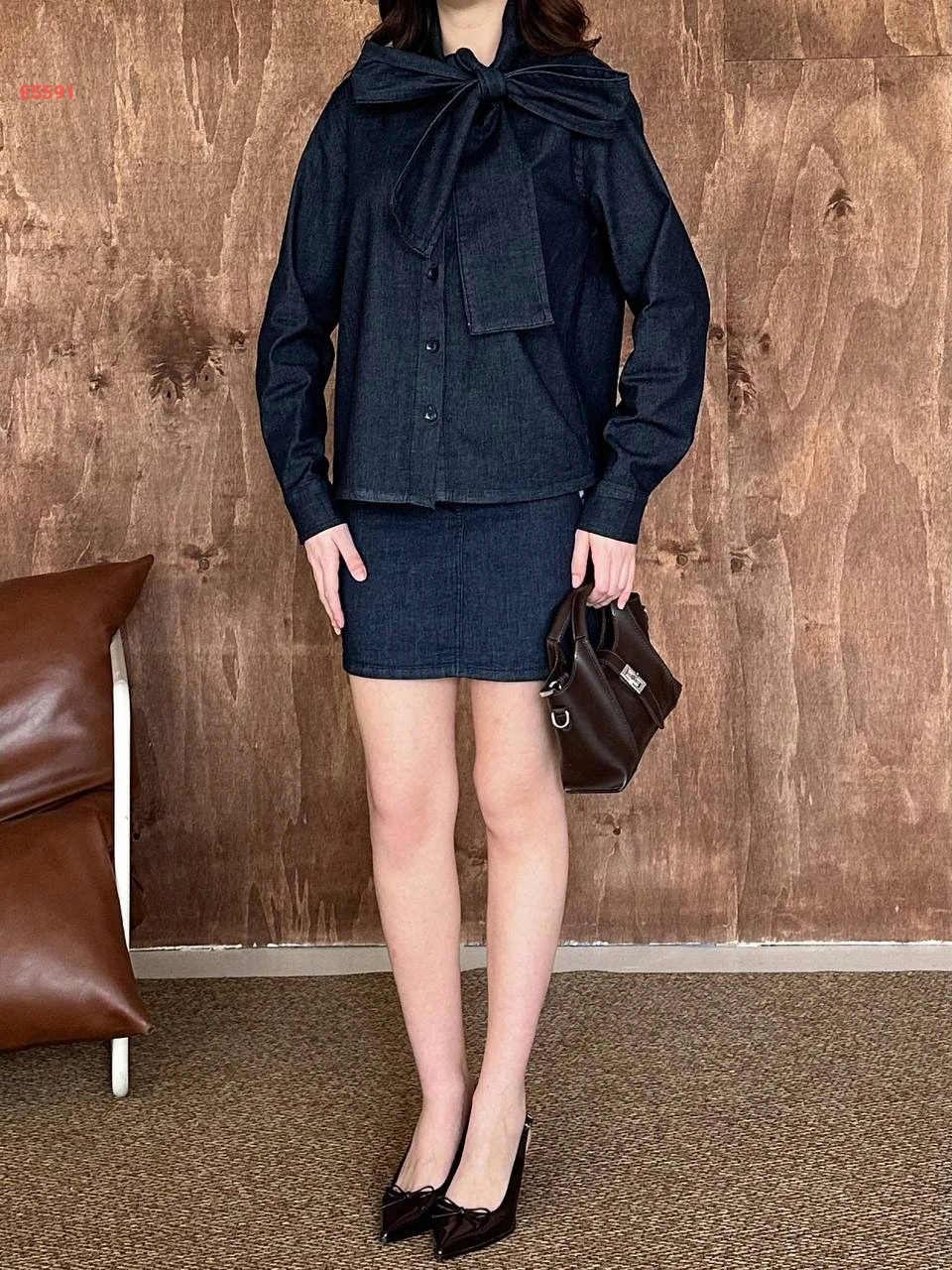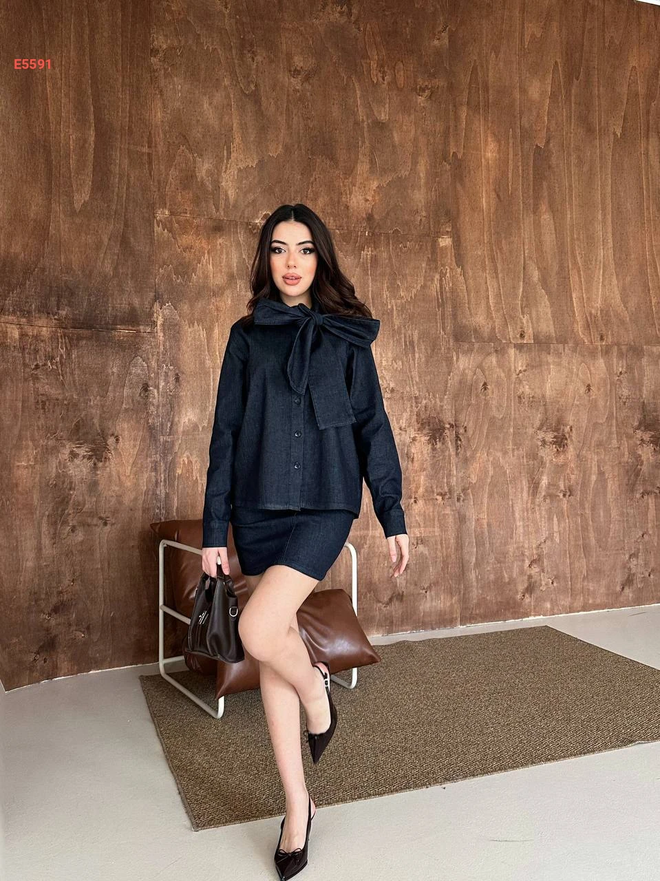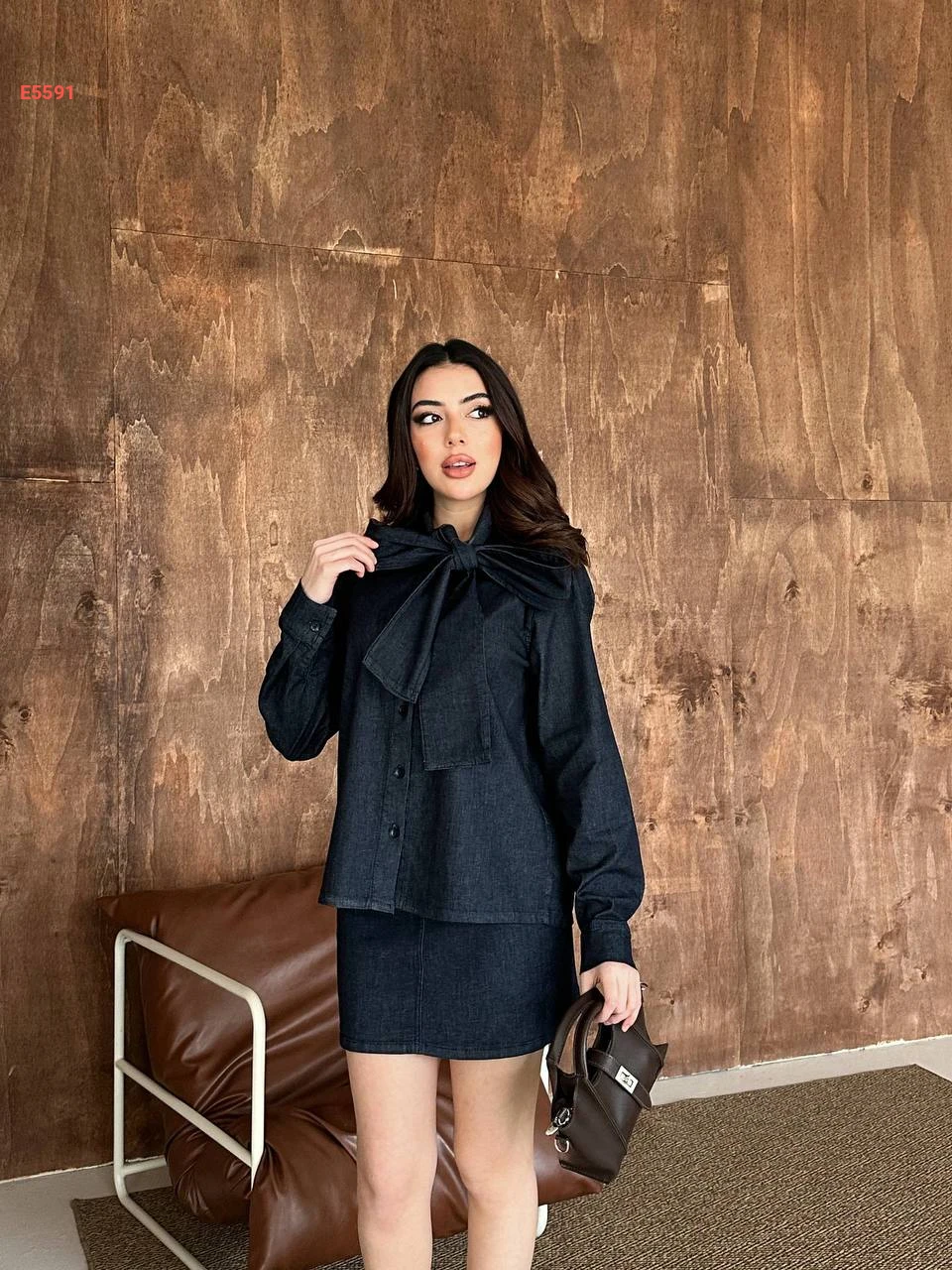 طقم تنورة جينز وقميص بربطة عنق