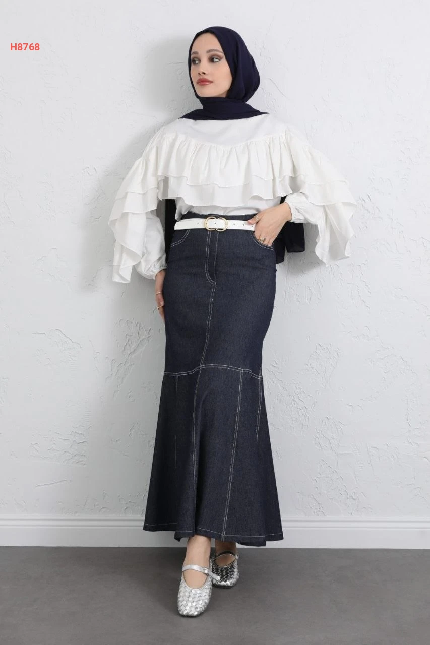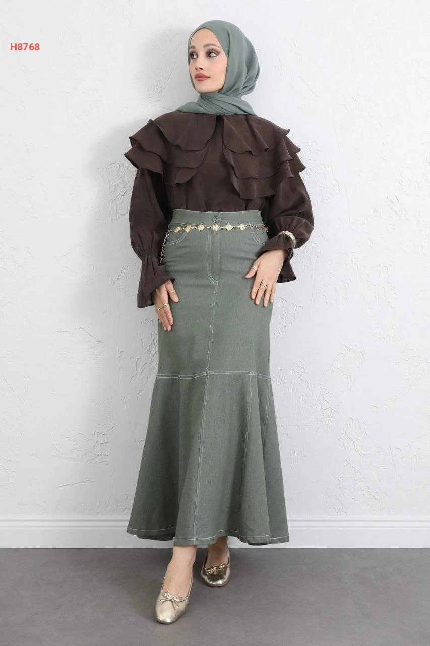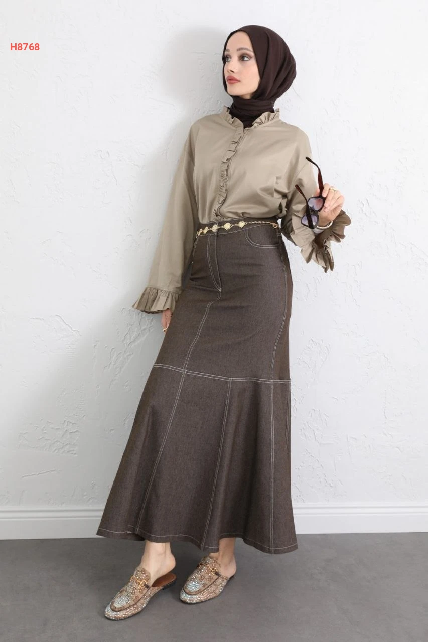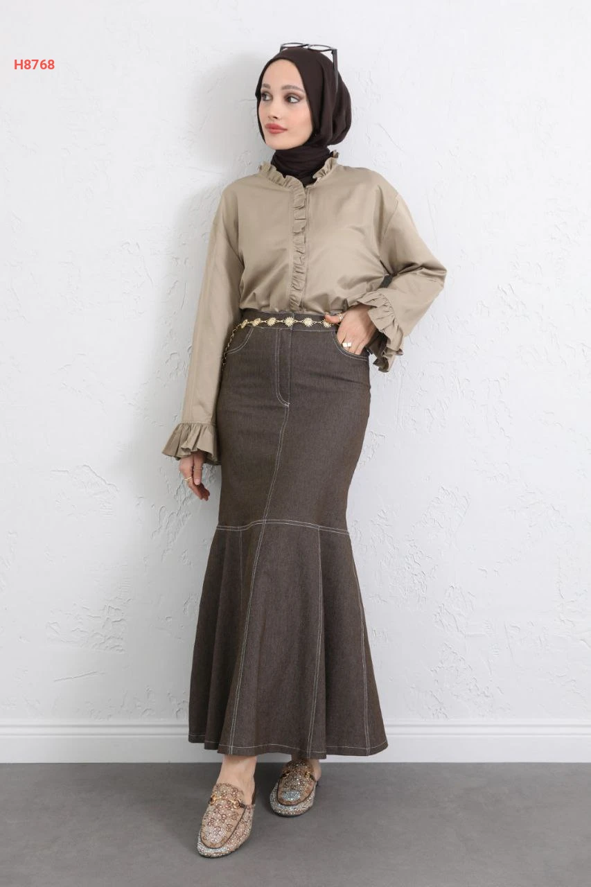 تنورة جينز سادة بيجب مع حزام سلاسل