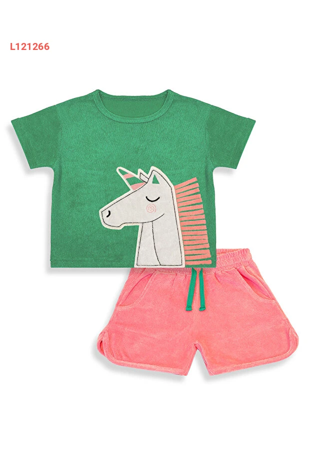 احضري لأميرتك الصغيرة راحتها وأناقتها مع طقم دينوكيدز المميز! مصنوع من قماش المنشفة الناعم، يتضمن هذا الطقم الجميل توب قصير وشورت مزخرف برمز اليونيكورن، مما يجعله الخيار المثالي لأيام الصيف المشمسة. تصميمه المريح يضمن حركة مرنة، ليتمتع الأطفال باللعب والمرح بكل حرية!