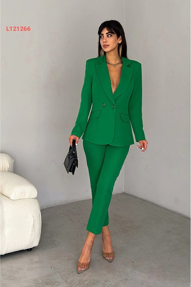 بدلة عصرية باللون الأخضر مع سترة كروفاتس وبنطلون جينز كاروت
