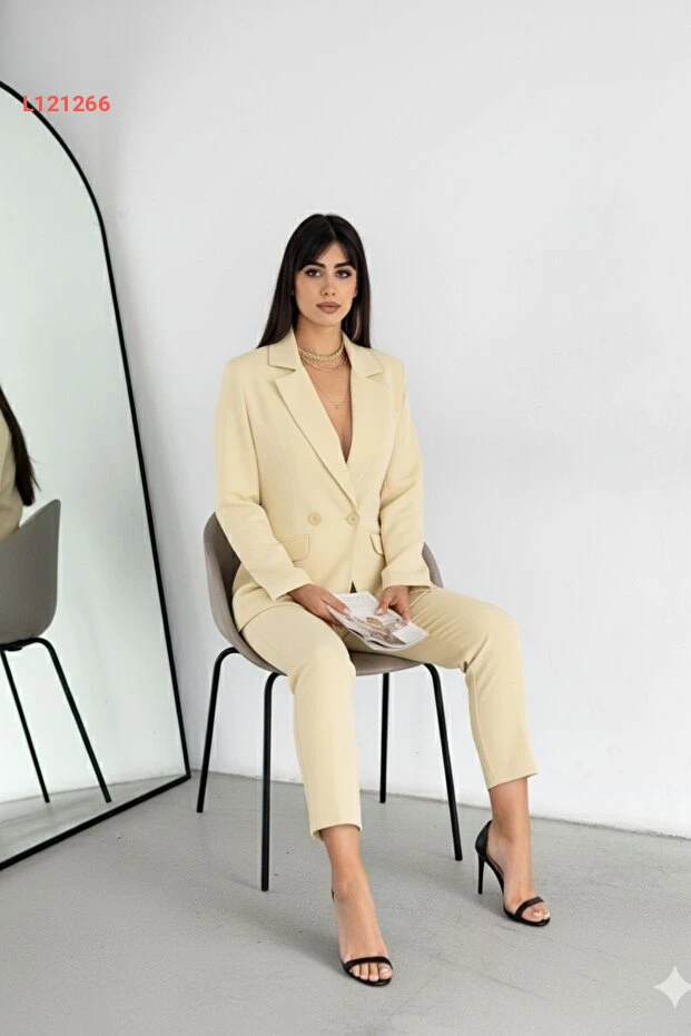 تألقي بأناقتك مع طقم البدلة المكون من سترة كروزيه بلون أصفر فاتح وسروال حاف. التصميم العصري والقصّة المناسبة لكل المناسبات تجعله الخيار المثالي لجميع إطلالاتك، بينما يوفر القماش الفاخر راحة لا تضاهى. اجذبي الأنظار بإطلالة تجمع بين الأنوثة والاحترافية بكل سهولة.