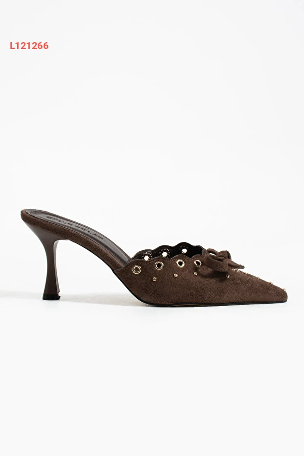 diclepolat Kadın Kahverengi Süet Sivri Burun İnce Topuklu Terlik Fiyonklu Metal Detaylı Selsey