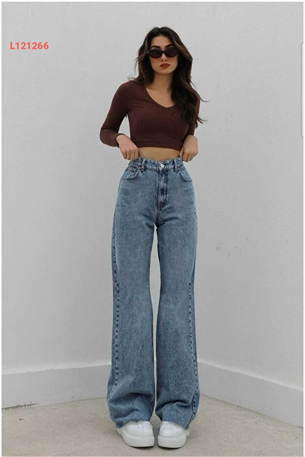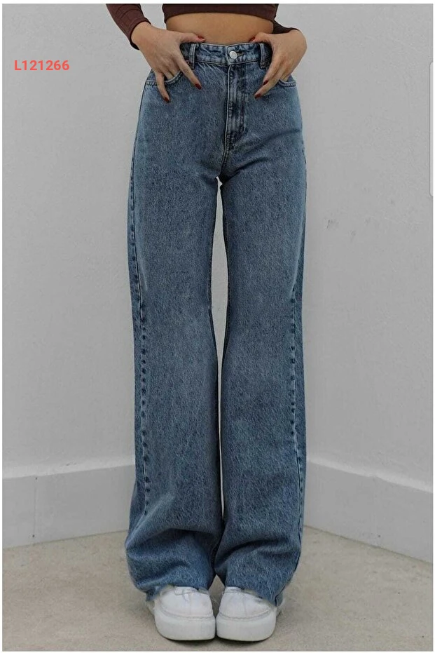 بنطلون جينز فائق الارتفاع للنساء بساق واسعة ومرونة عالية - لون كار كار أزرق