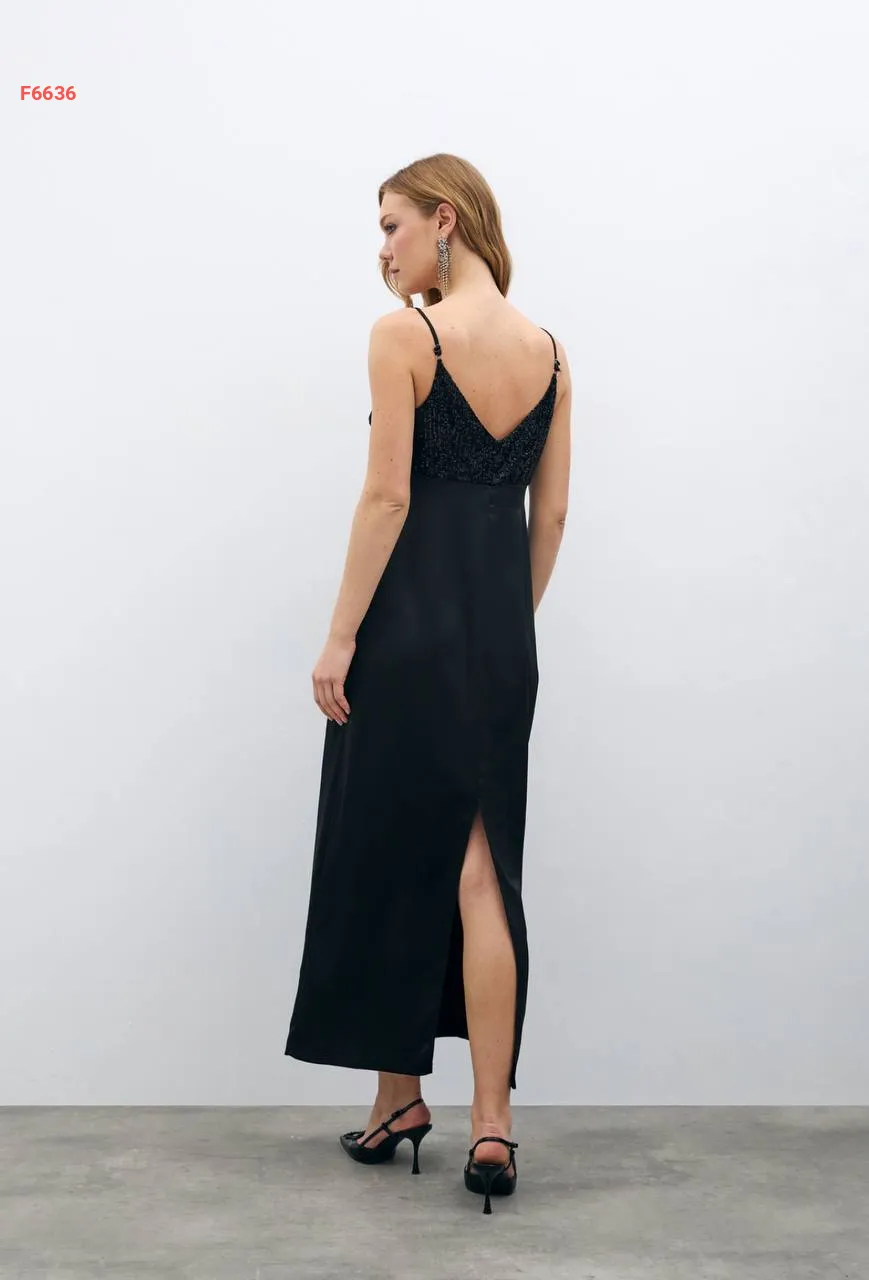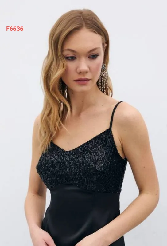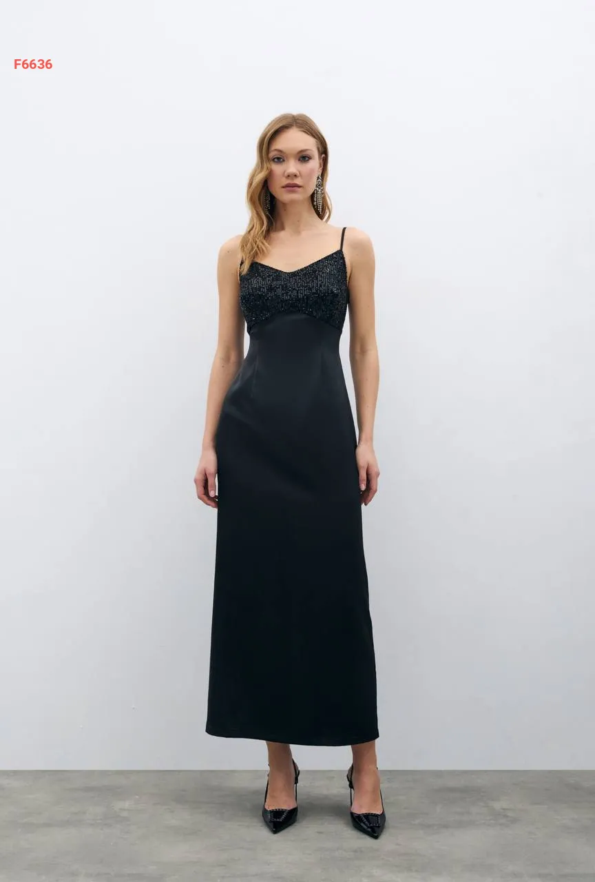 فستان أسود مطرز بالترتر بحمالات رفيعة