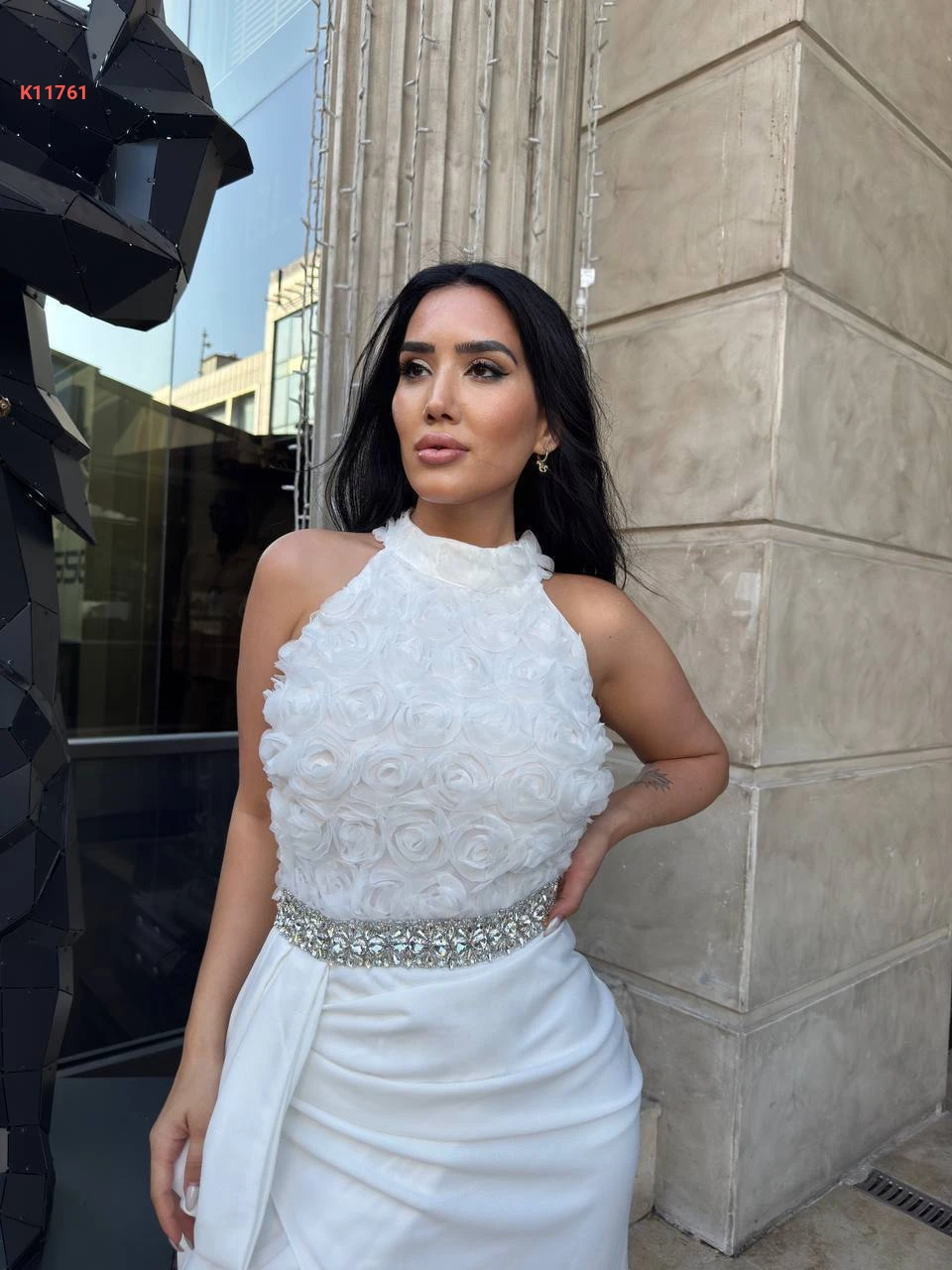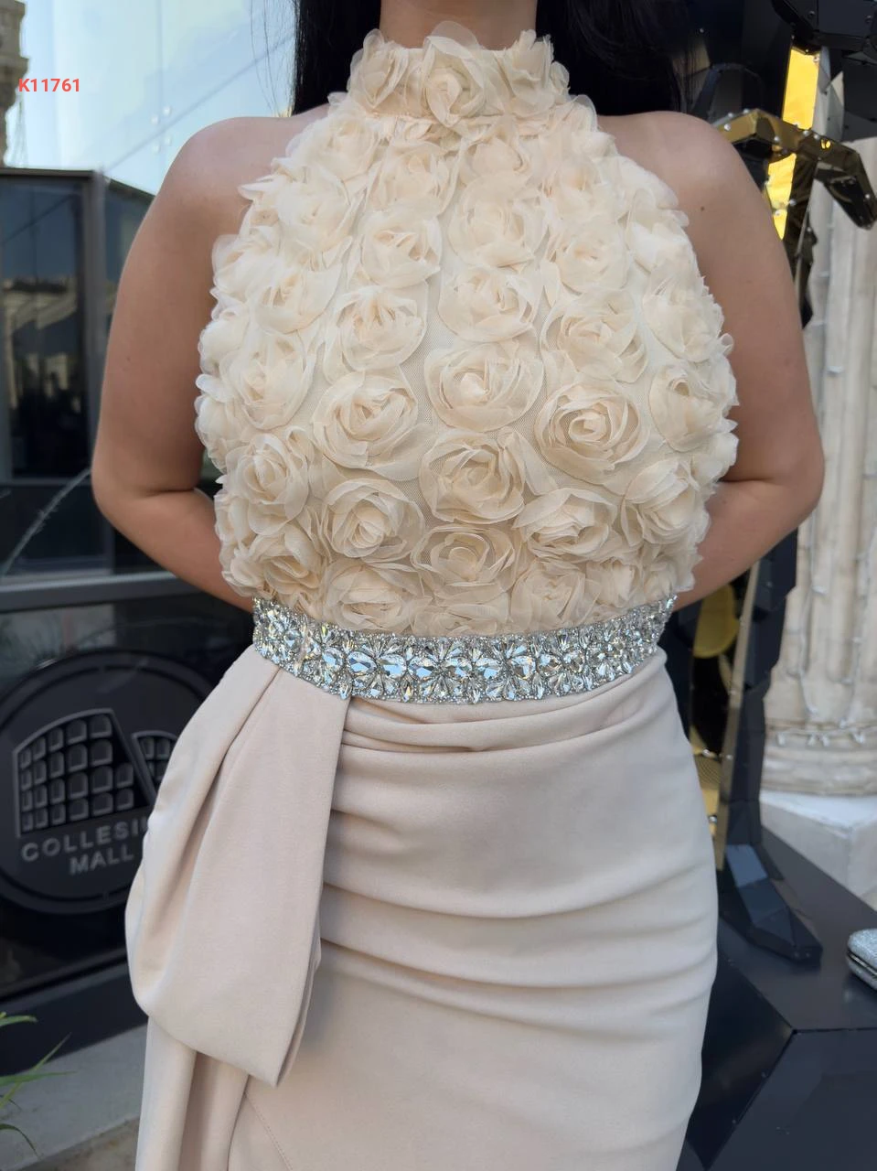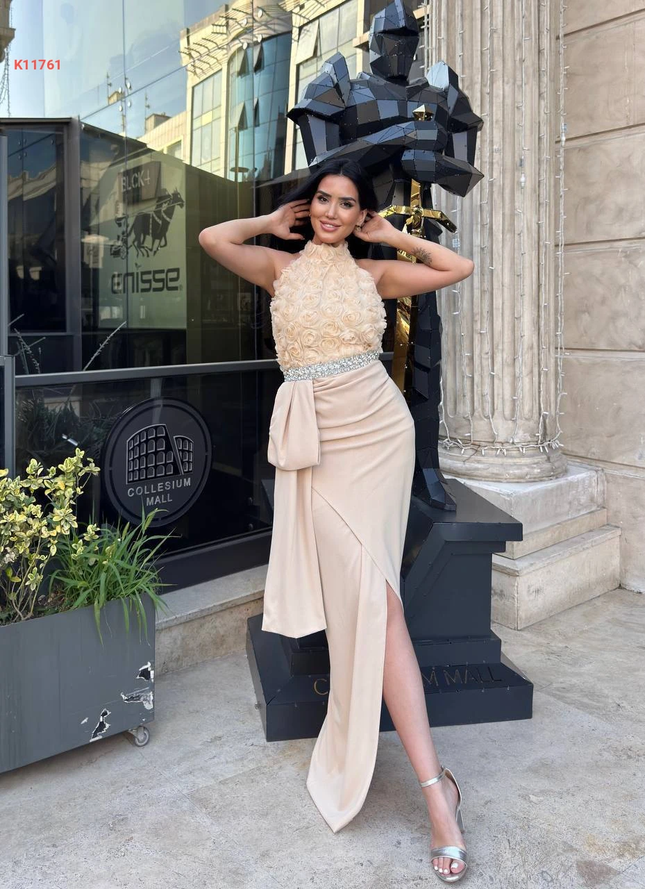 فستان مزين ورد مع أحجار كريستال