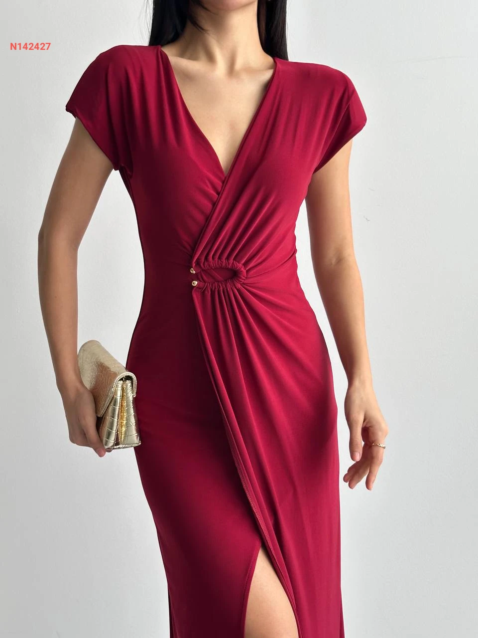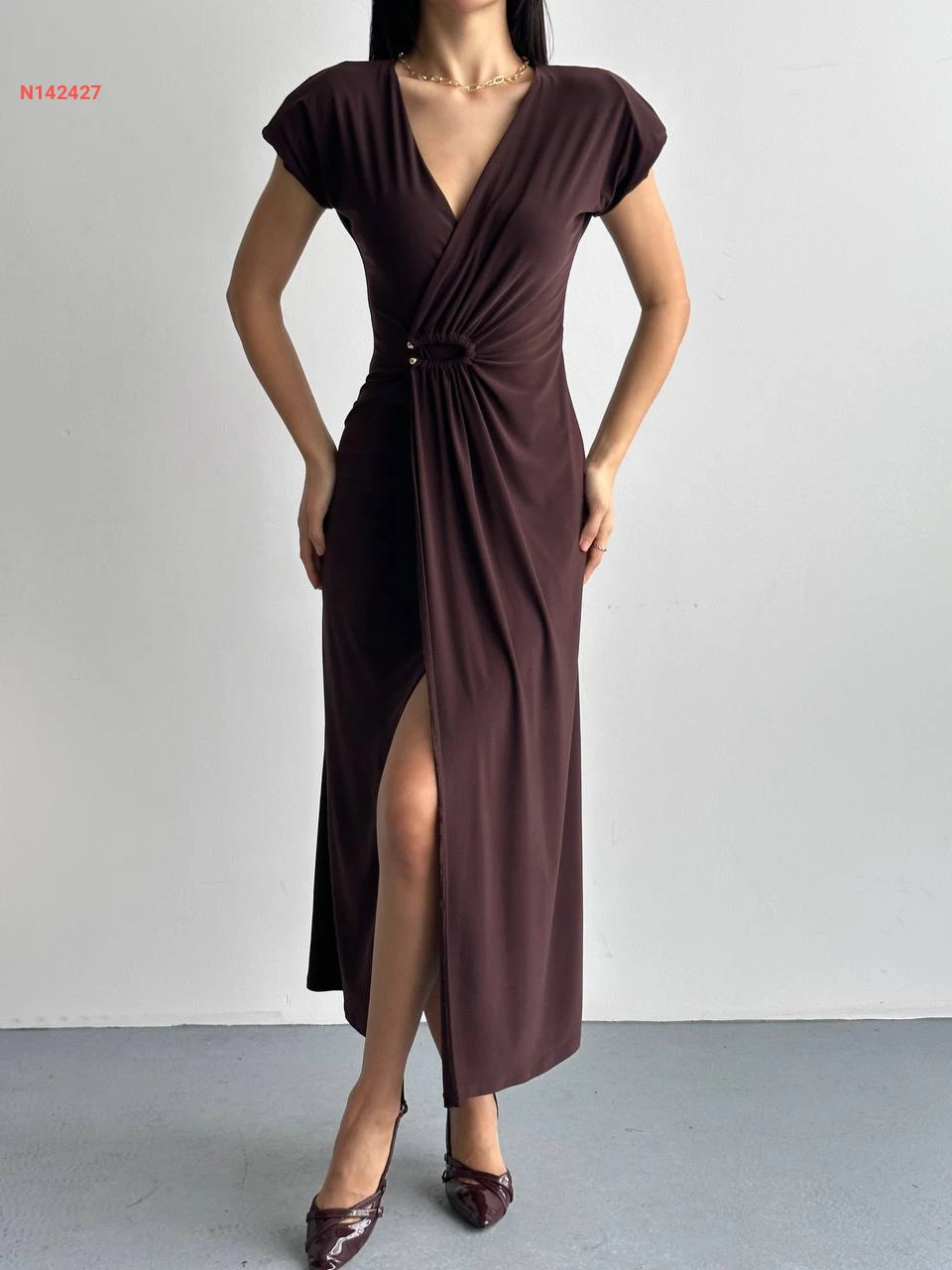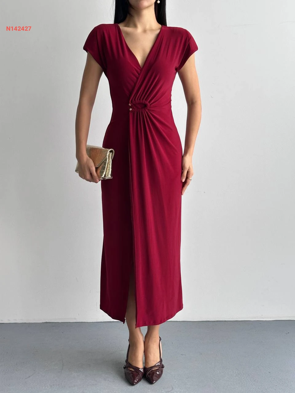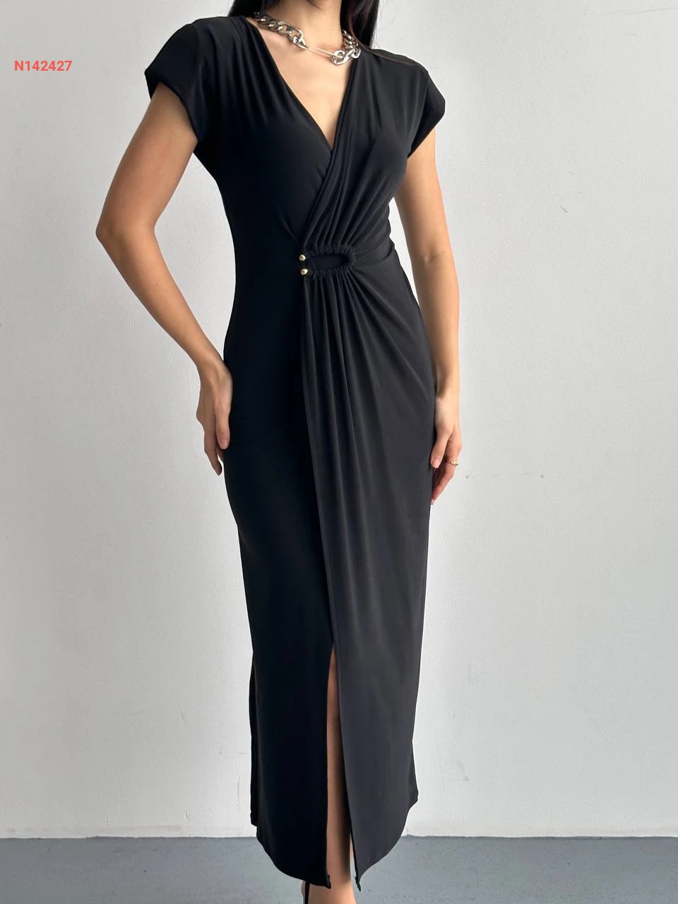 فستان مجمع بإبزيم بفتحة أمامية