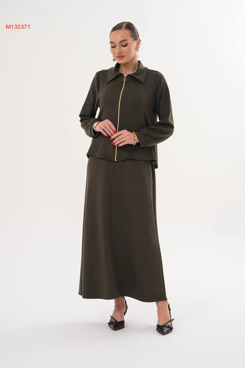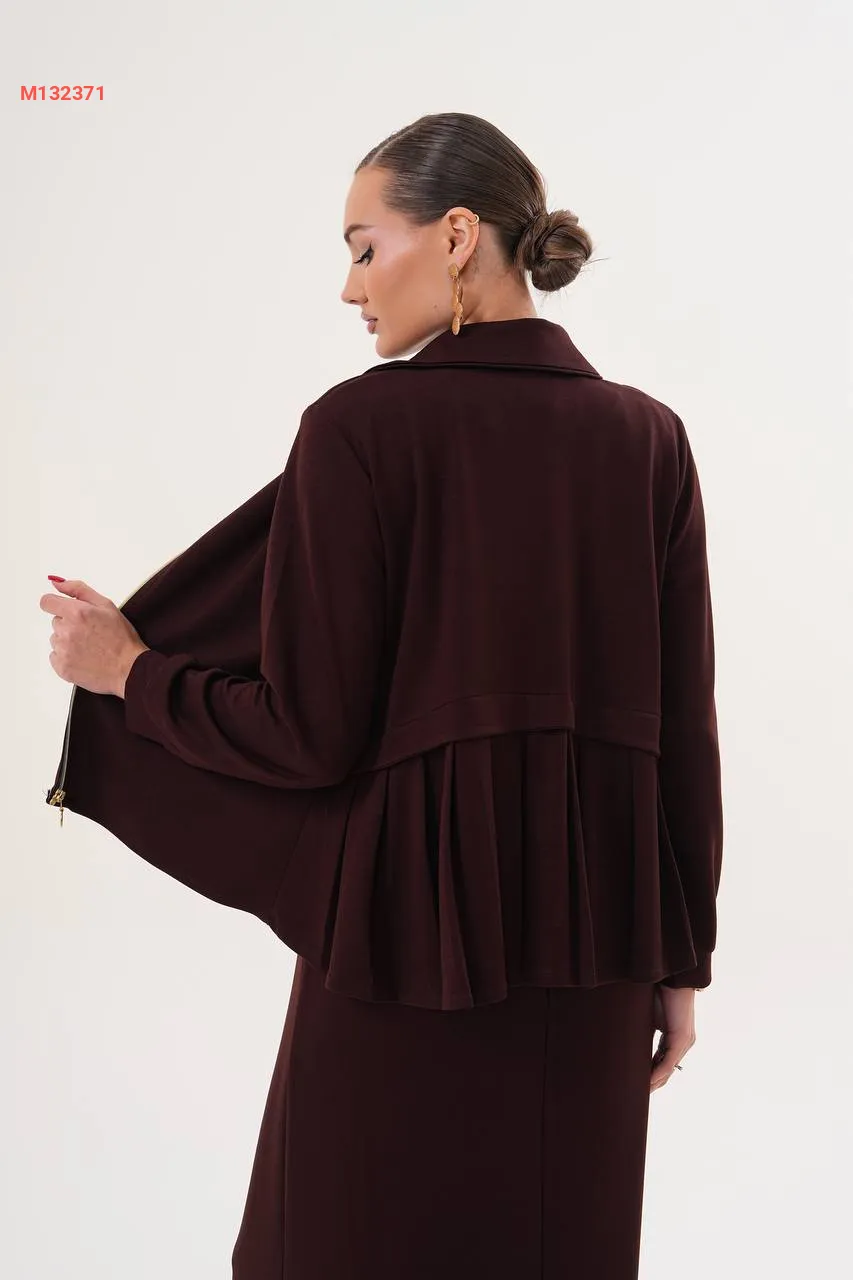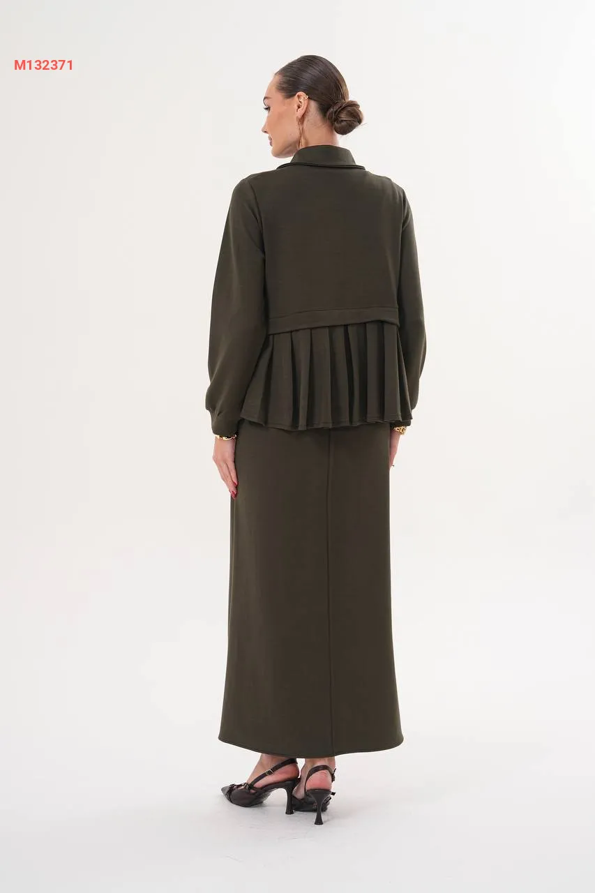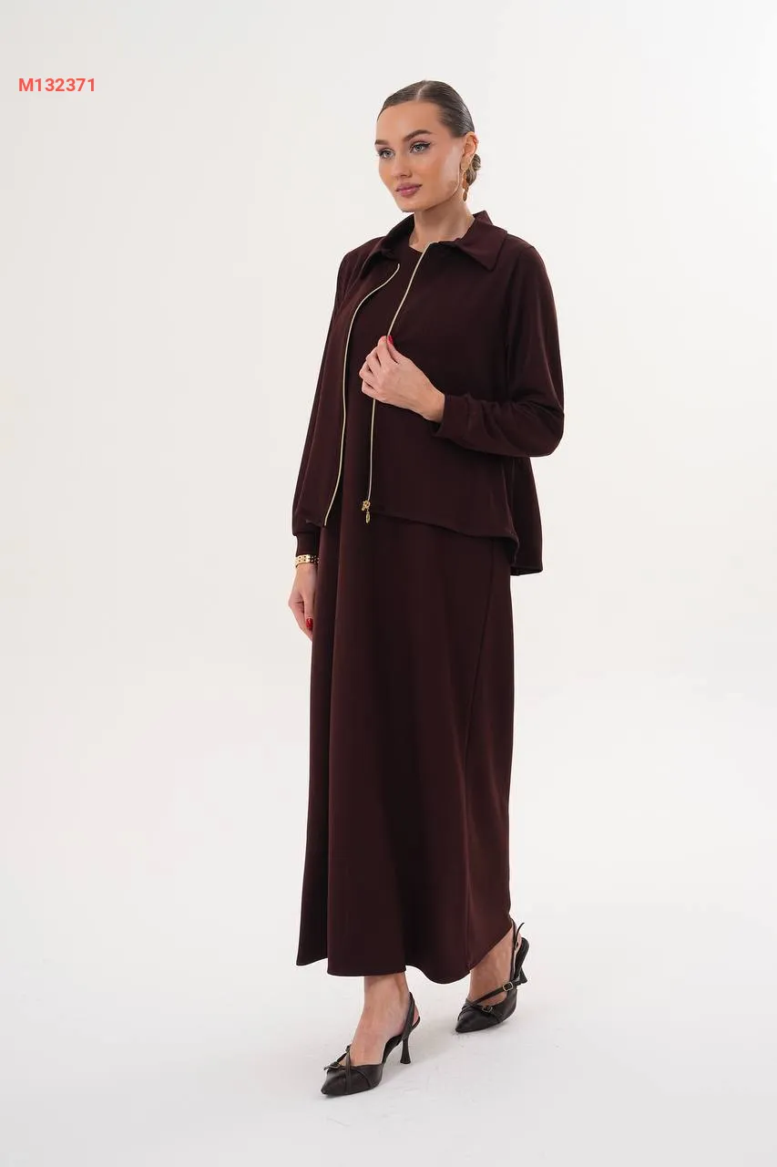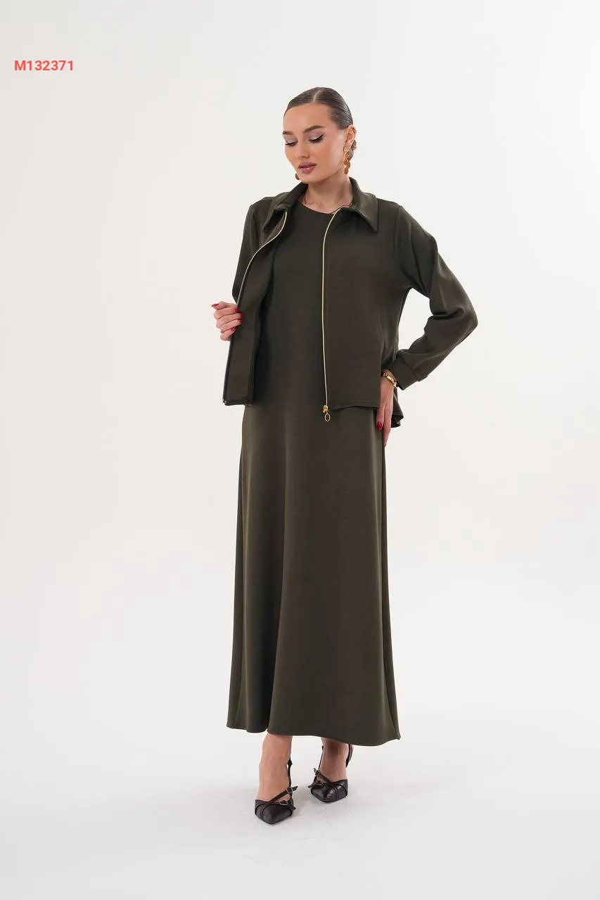 طقم فستان سادة قطعتين جاكيت بسحاب مع موديل كسرات أسفل الظهر