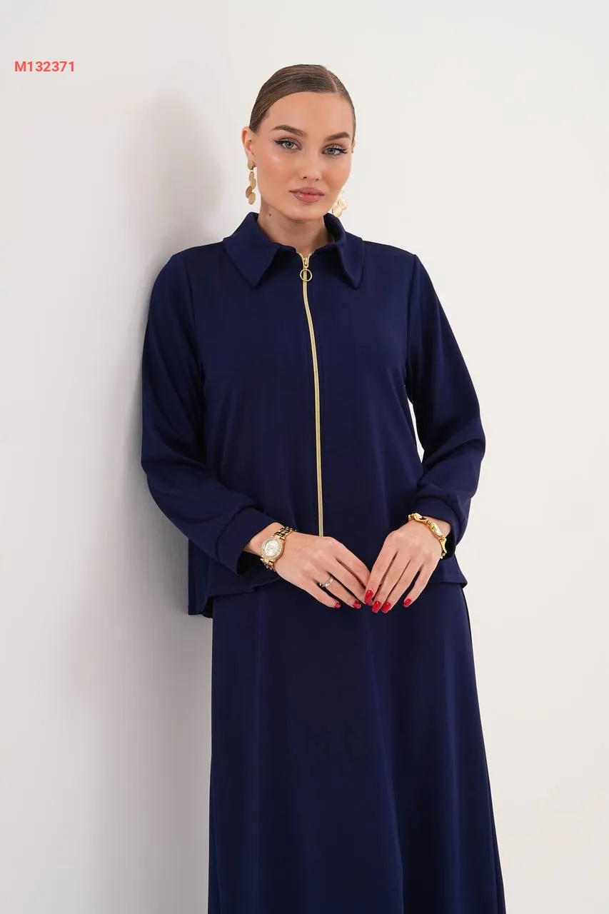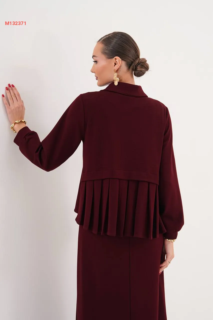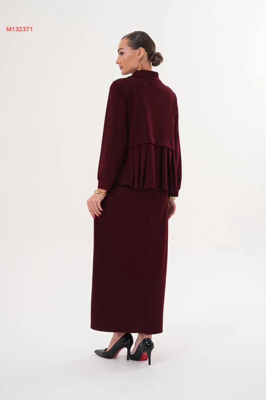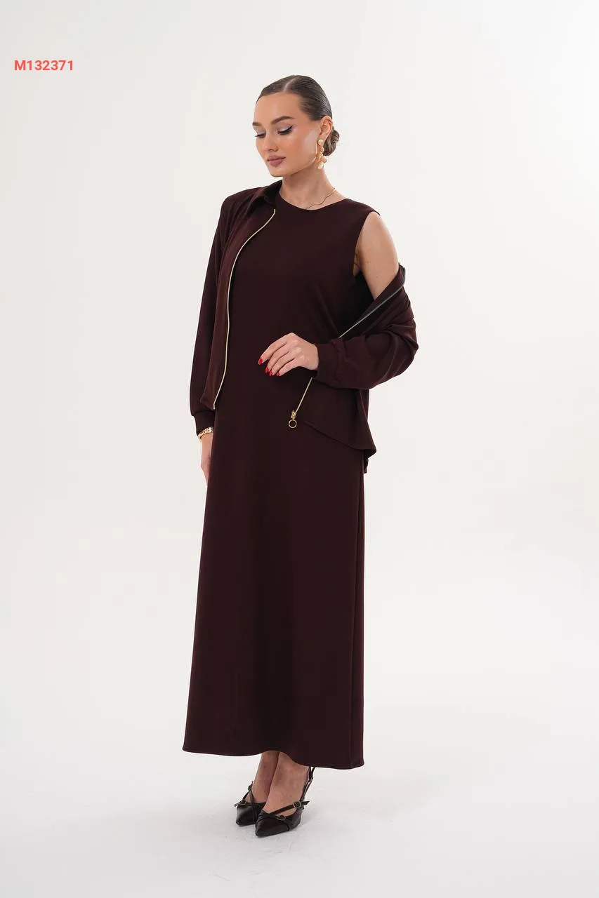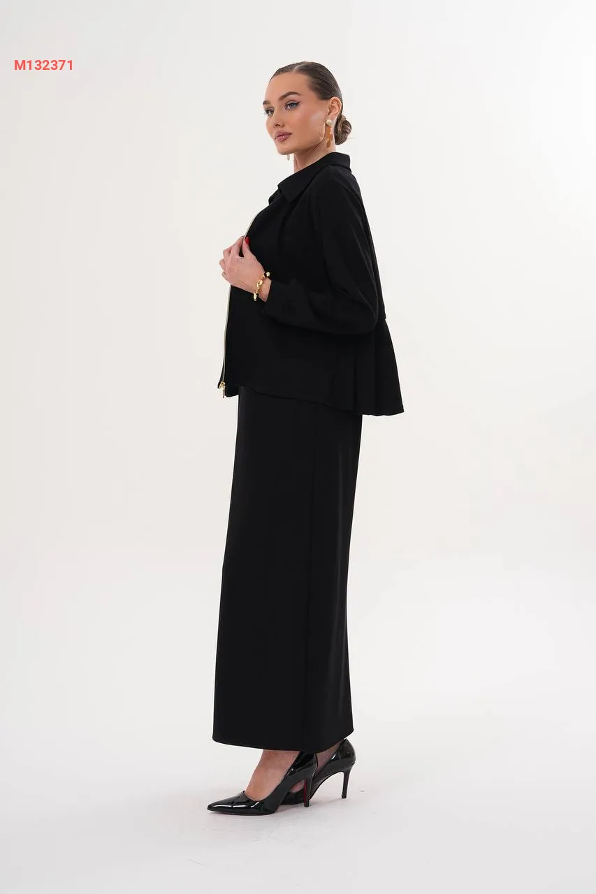 طقم فستان سادة قطعتين جاكيت بسحاب مع موديل كسرات أسفل الظهر