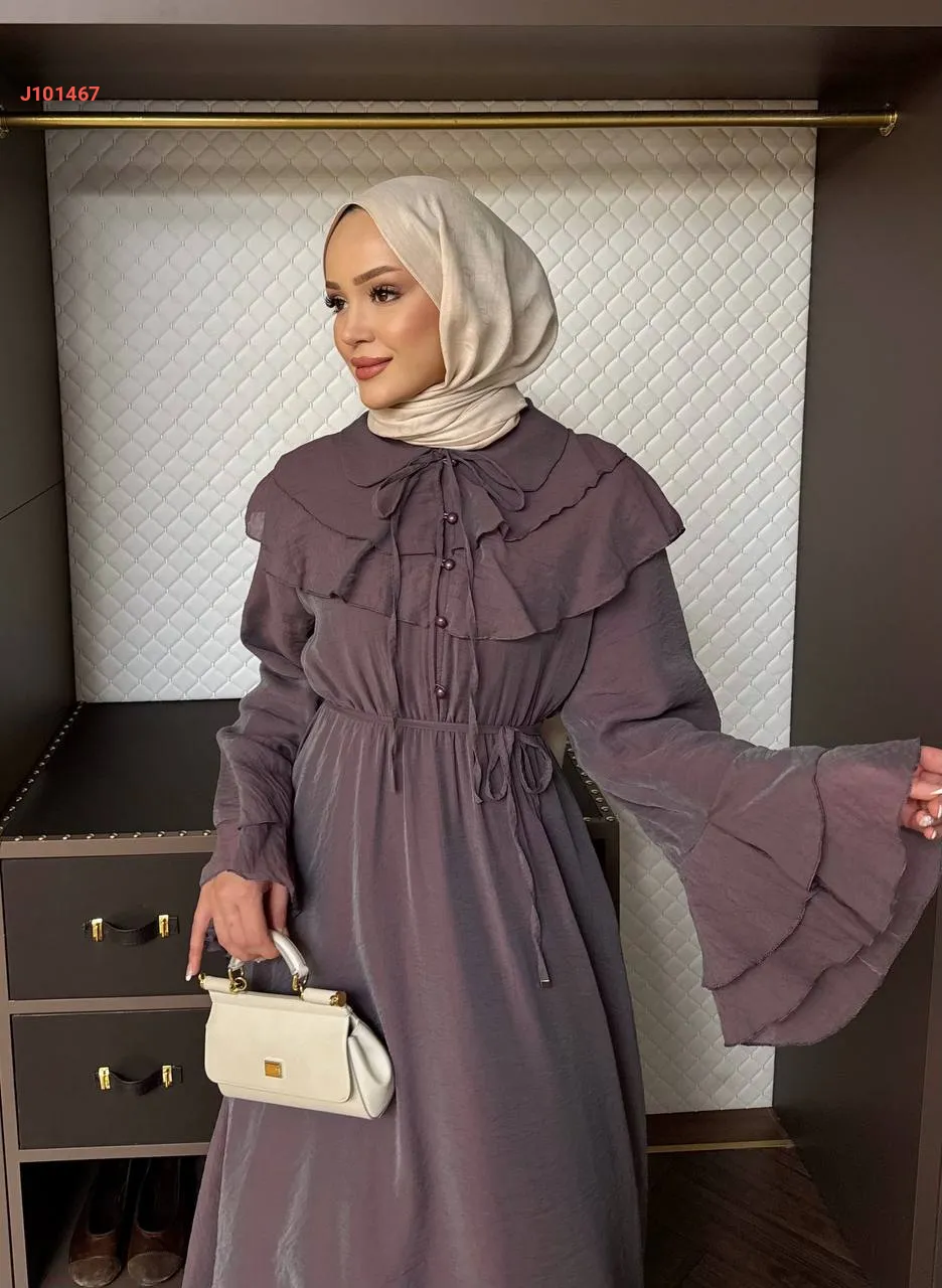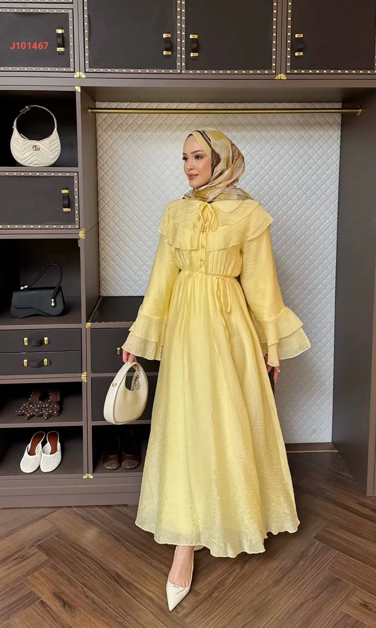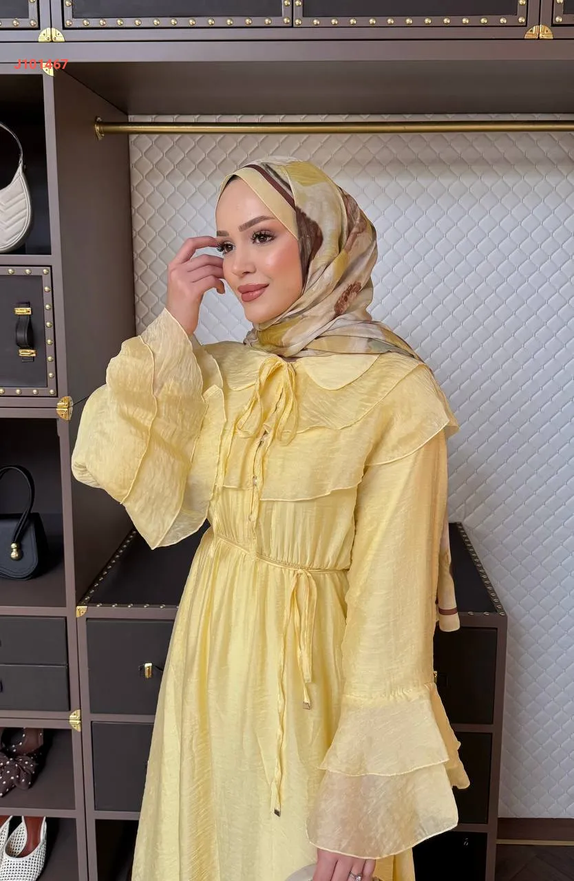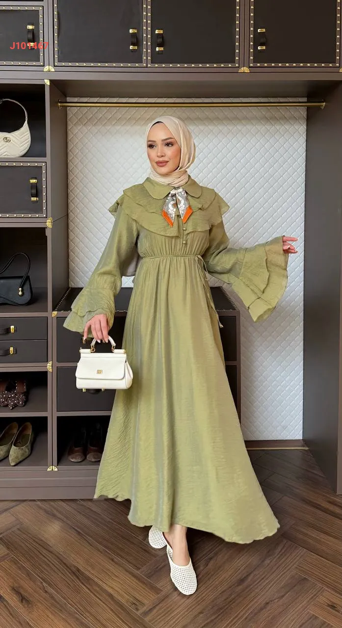 فستان بأزرار ، مع أكمام وياقة طبقات ، وزمة عند الخصر