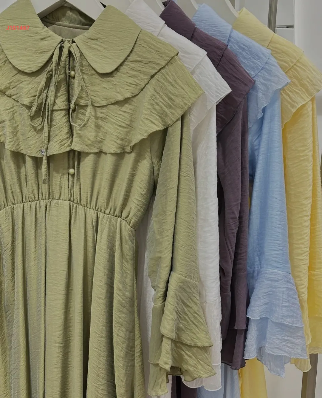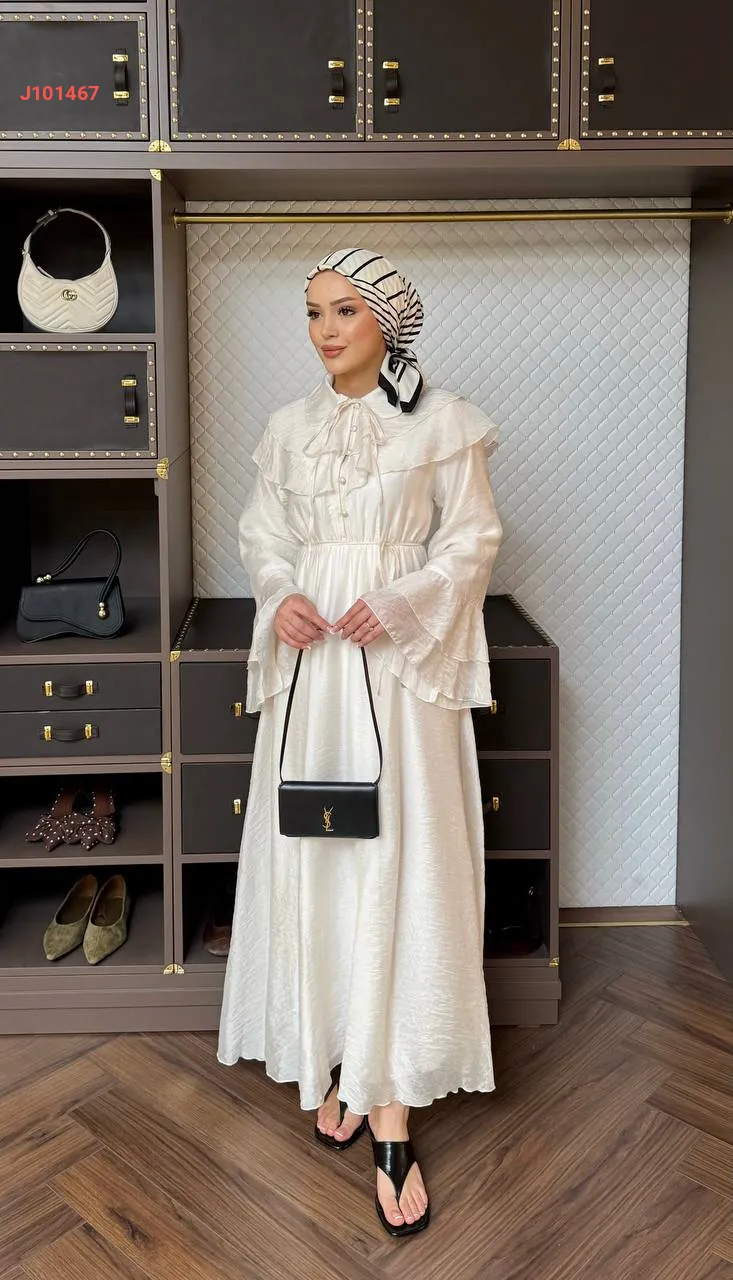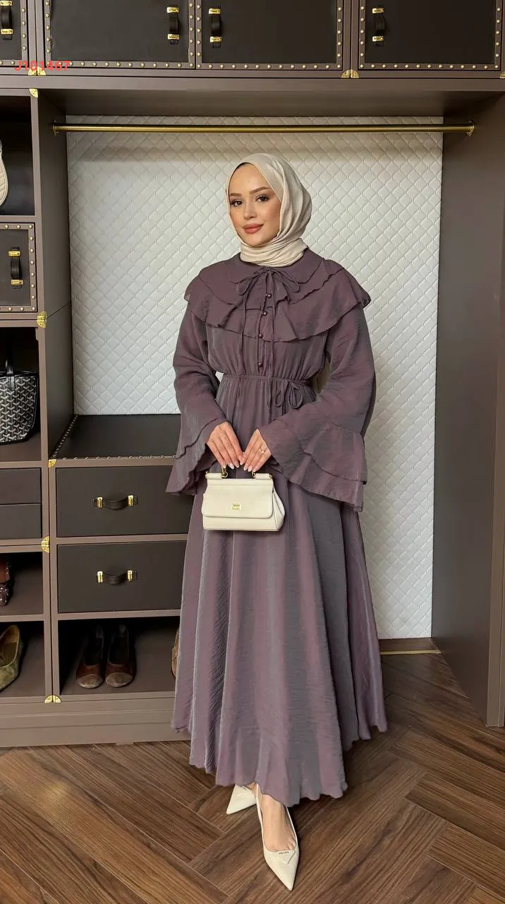 فستان بأزرار ، مع أكمام وياقة طبقات ، وزمة عند الخصر