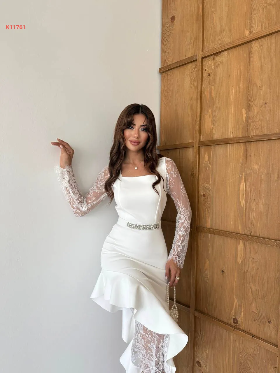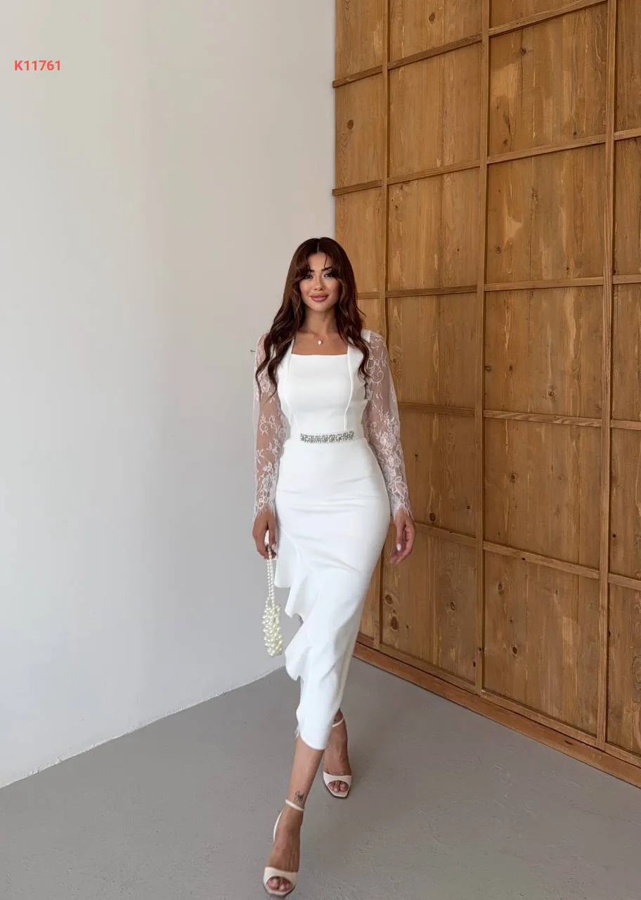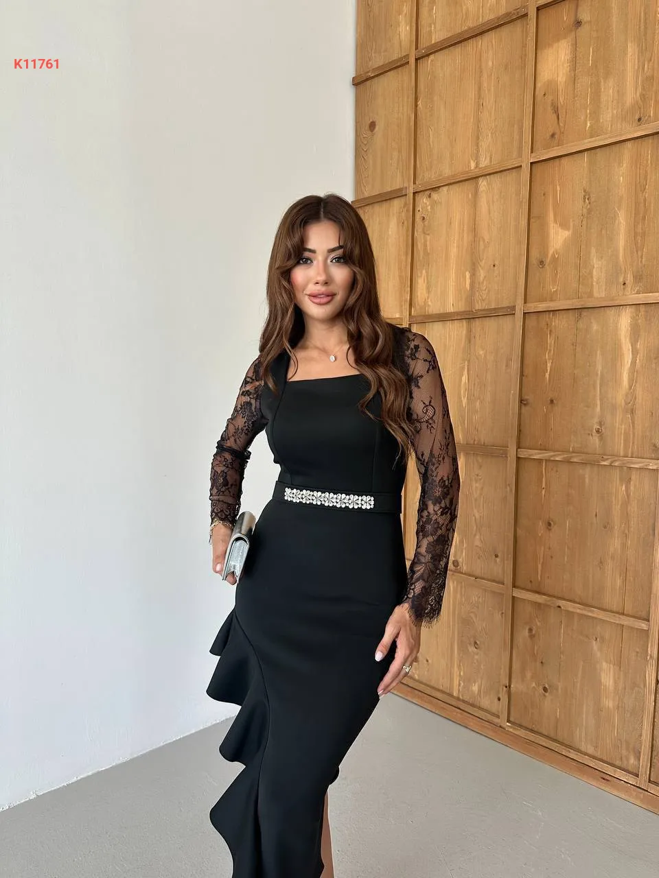 فستان بأكمام شيفون وأحجار ستراس عالخصر