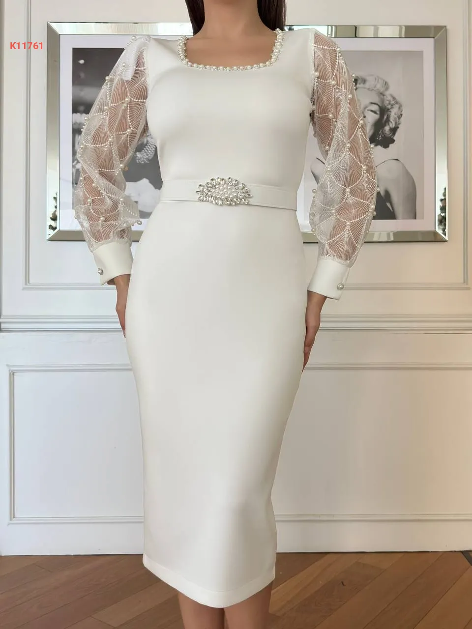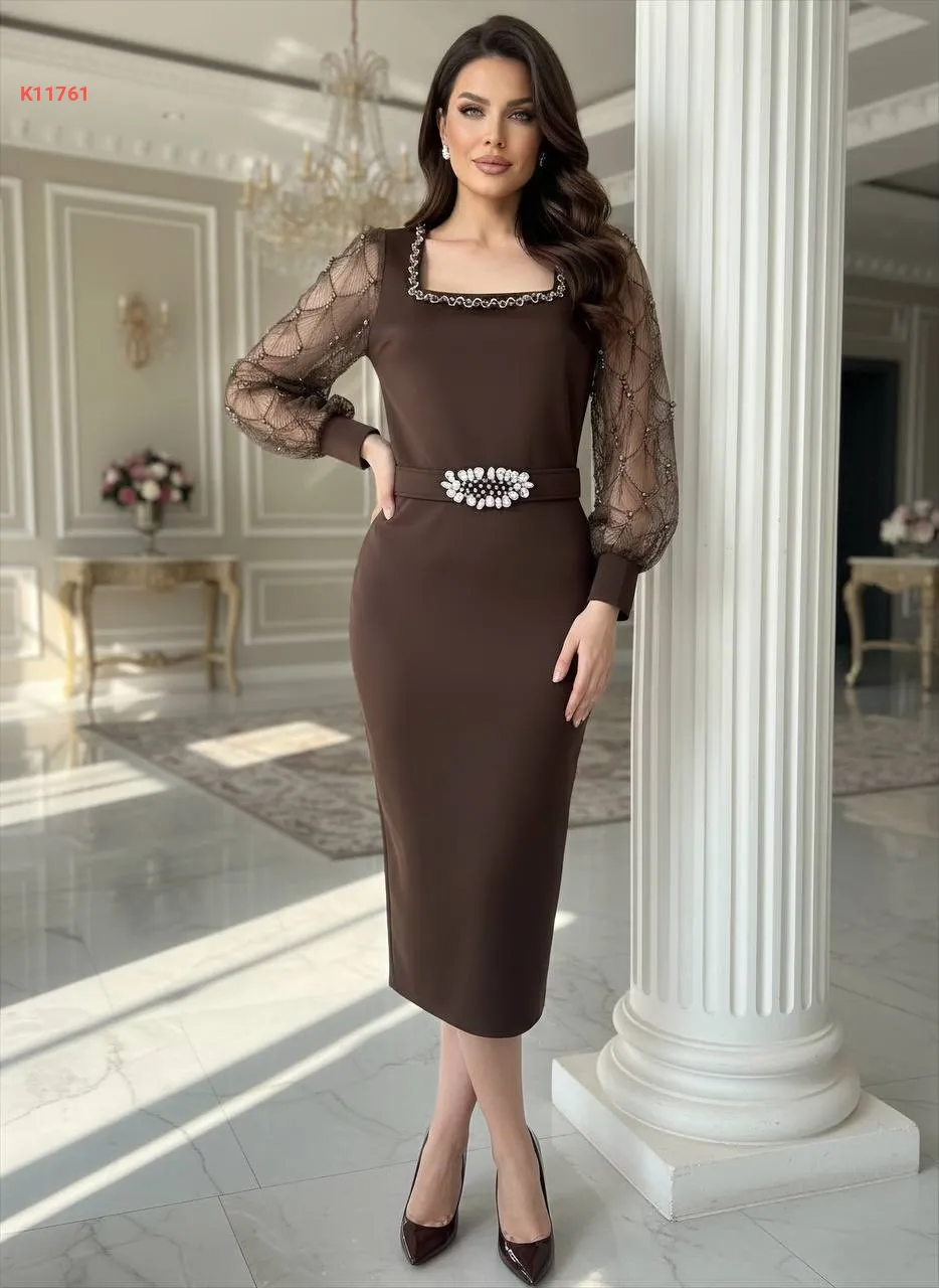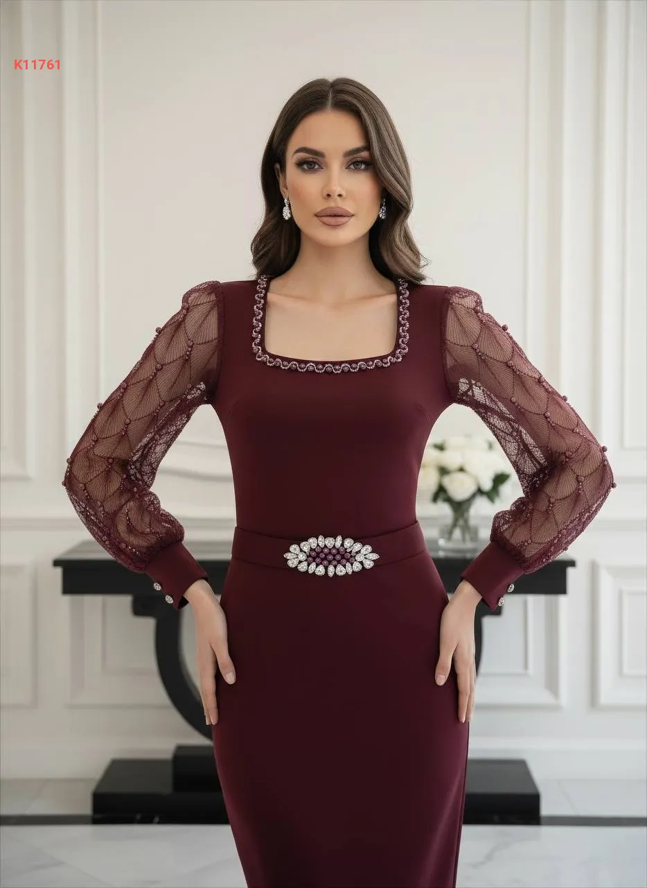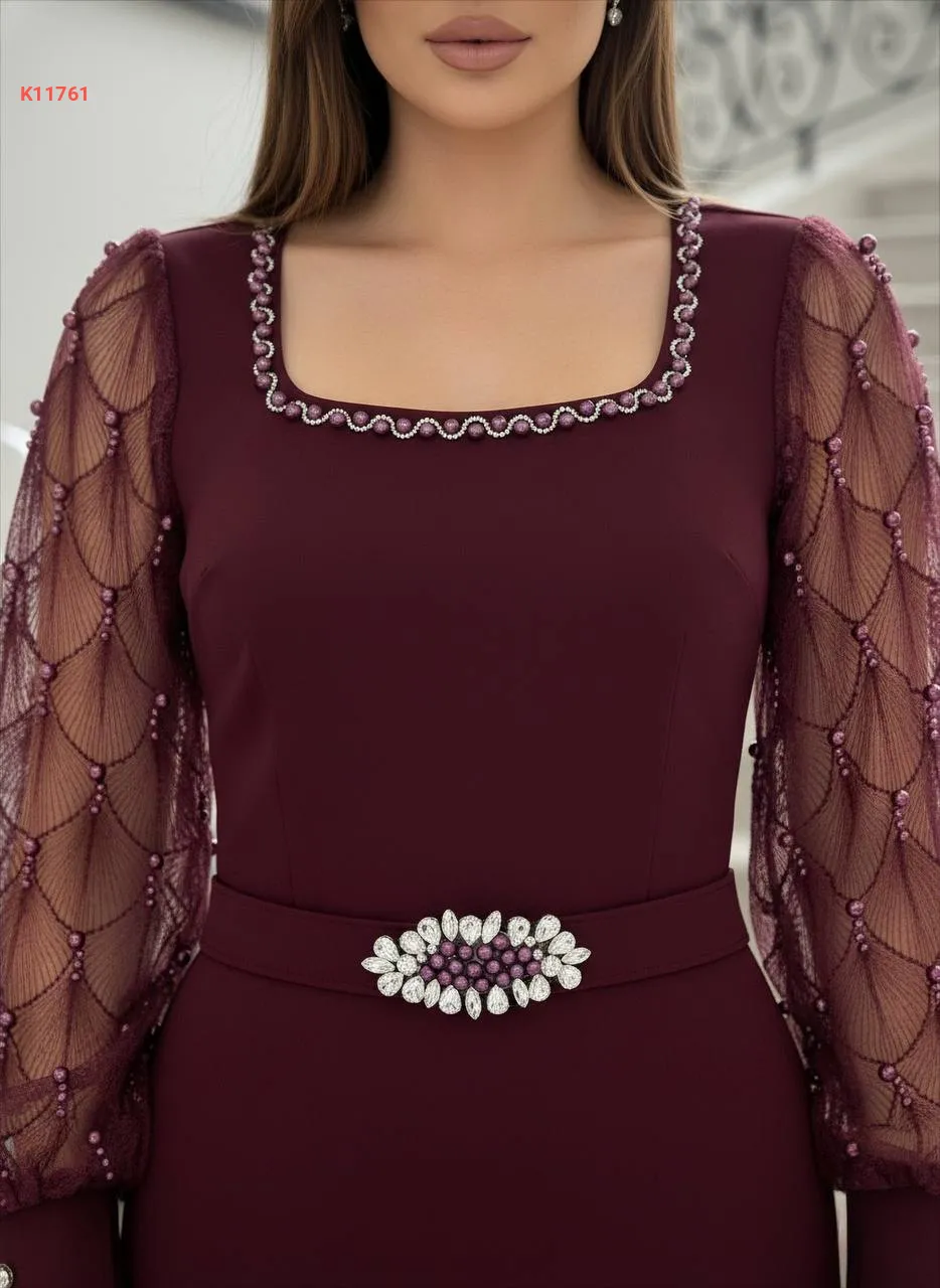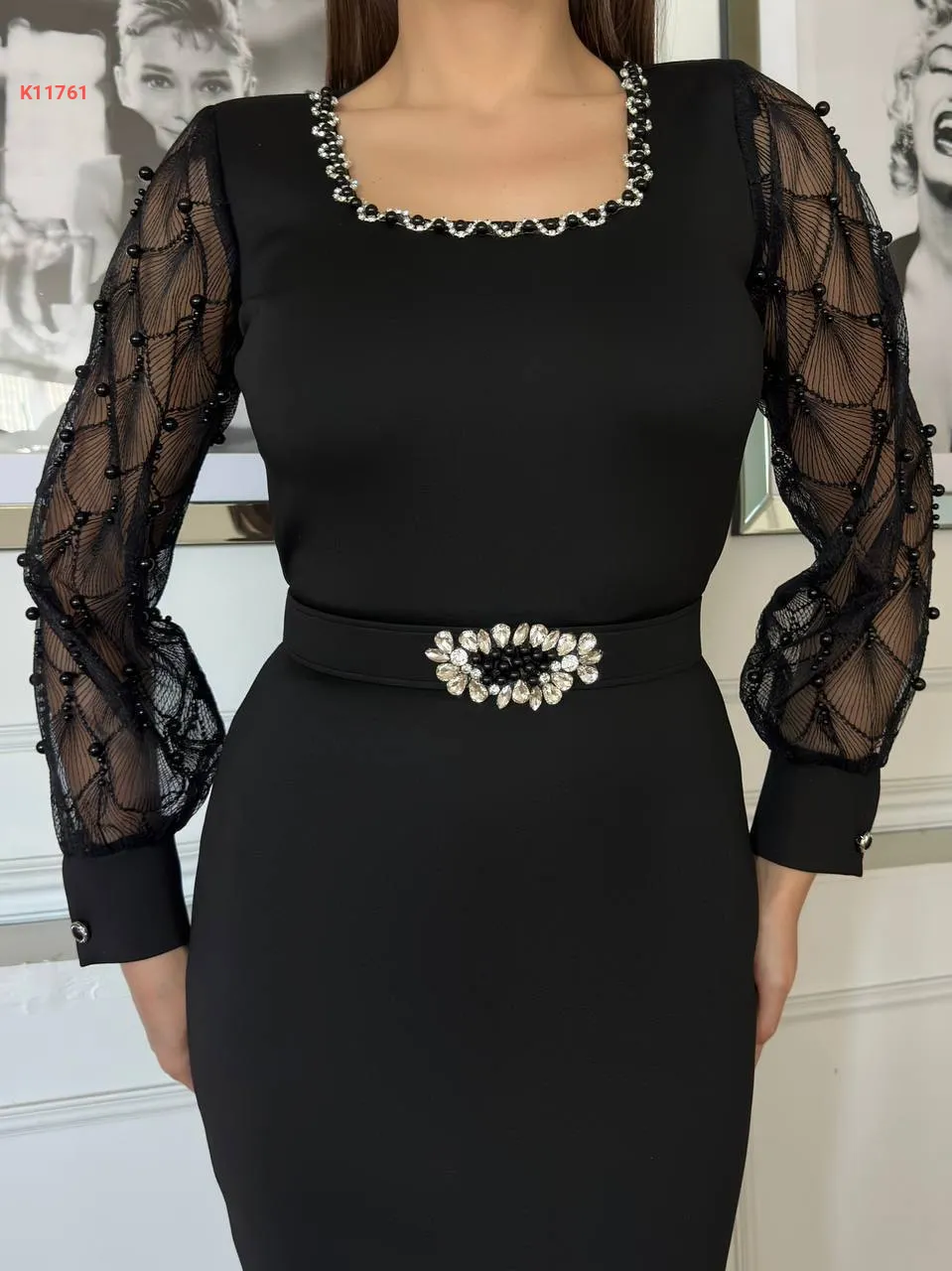 فستان بأكمام شفافة مطرزة لولو وحزام