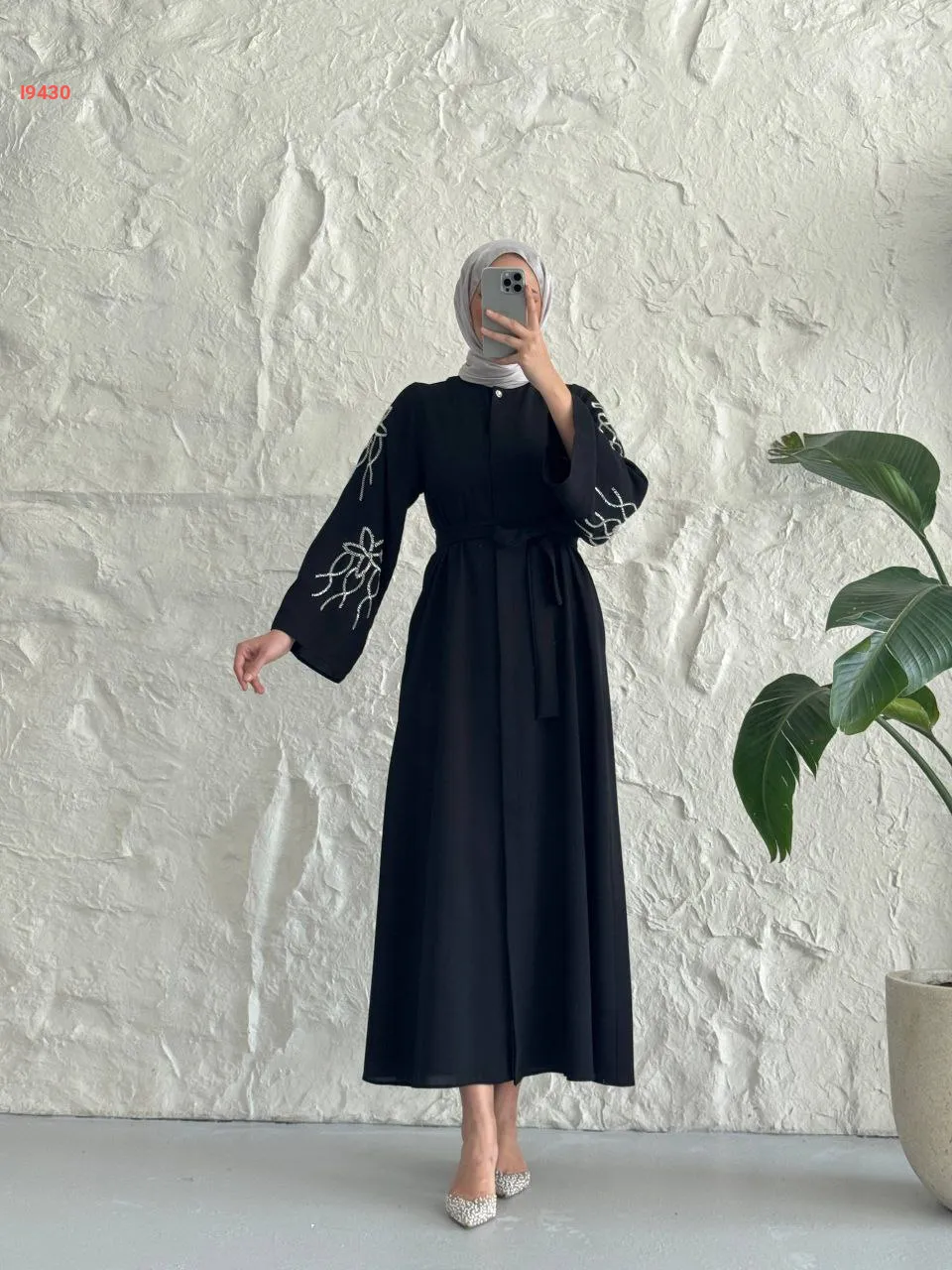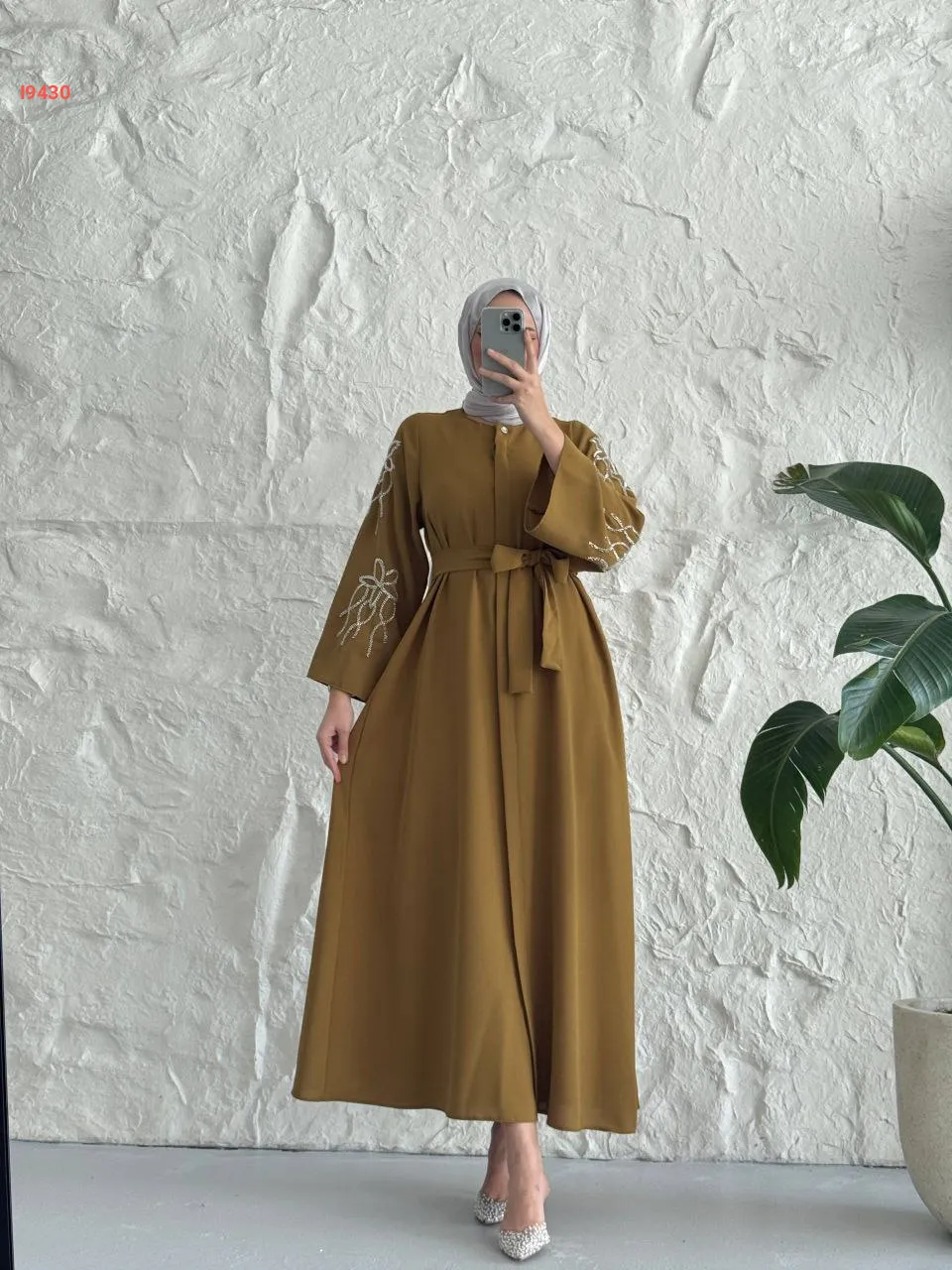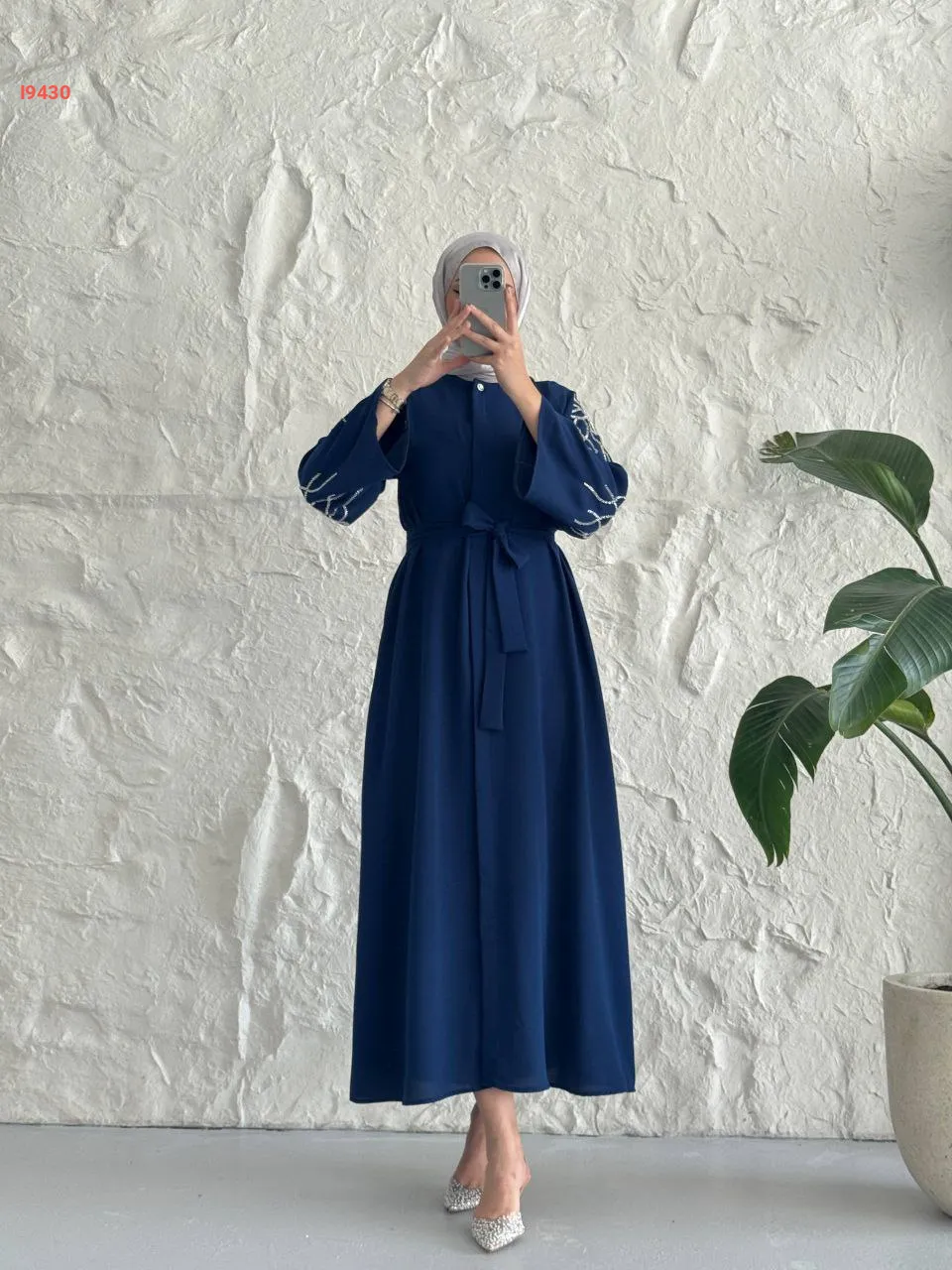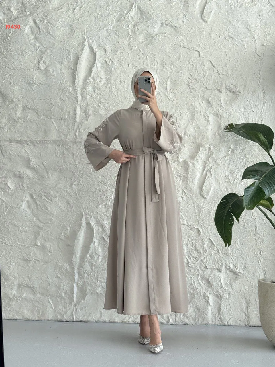 فستان سادة بأزرار مخفية وأكمام مطرزة مع حزام
