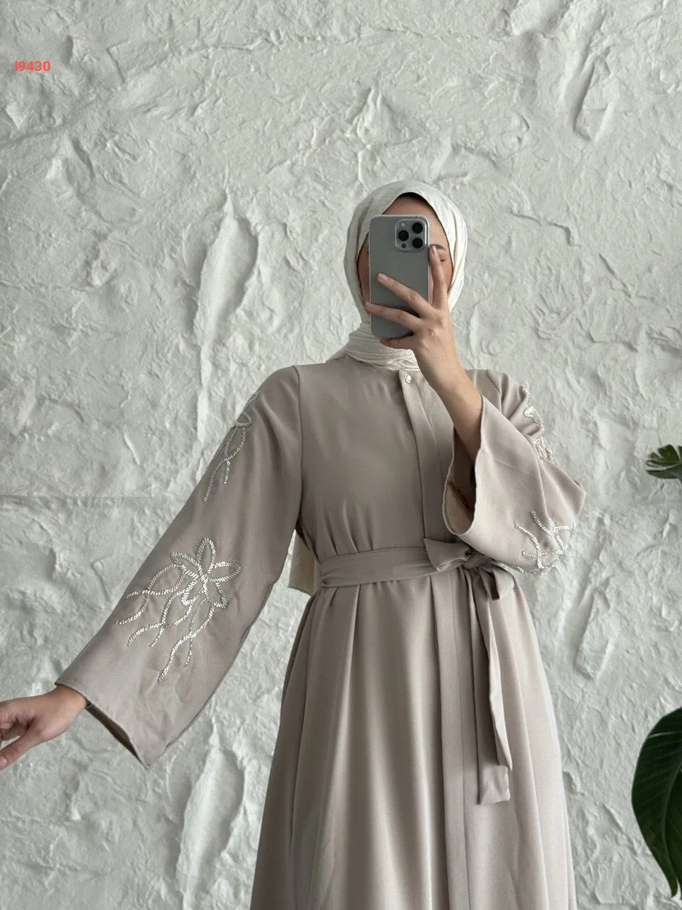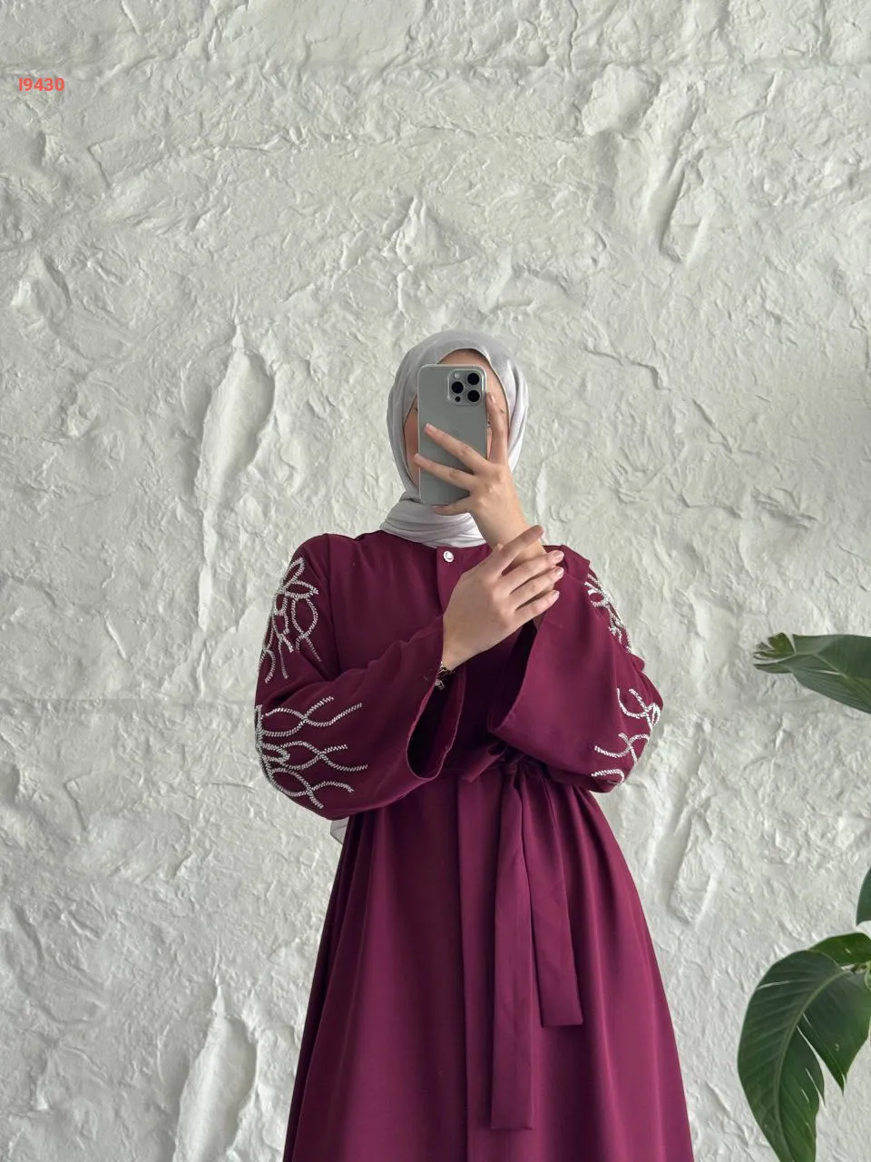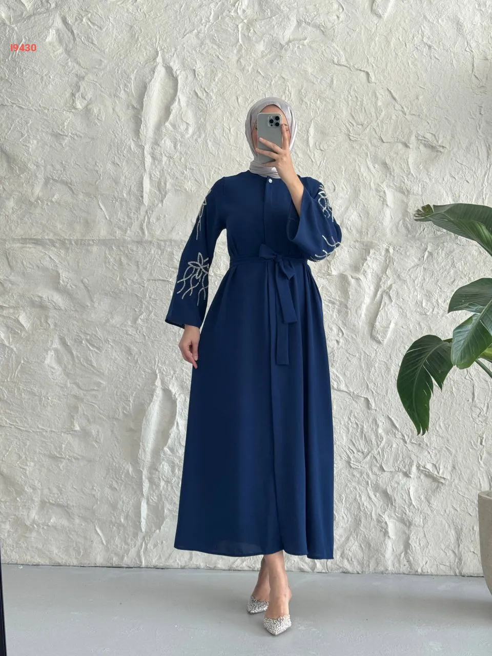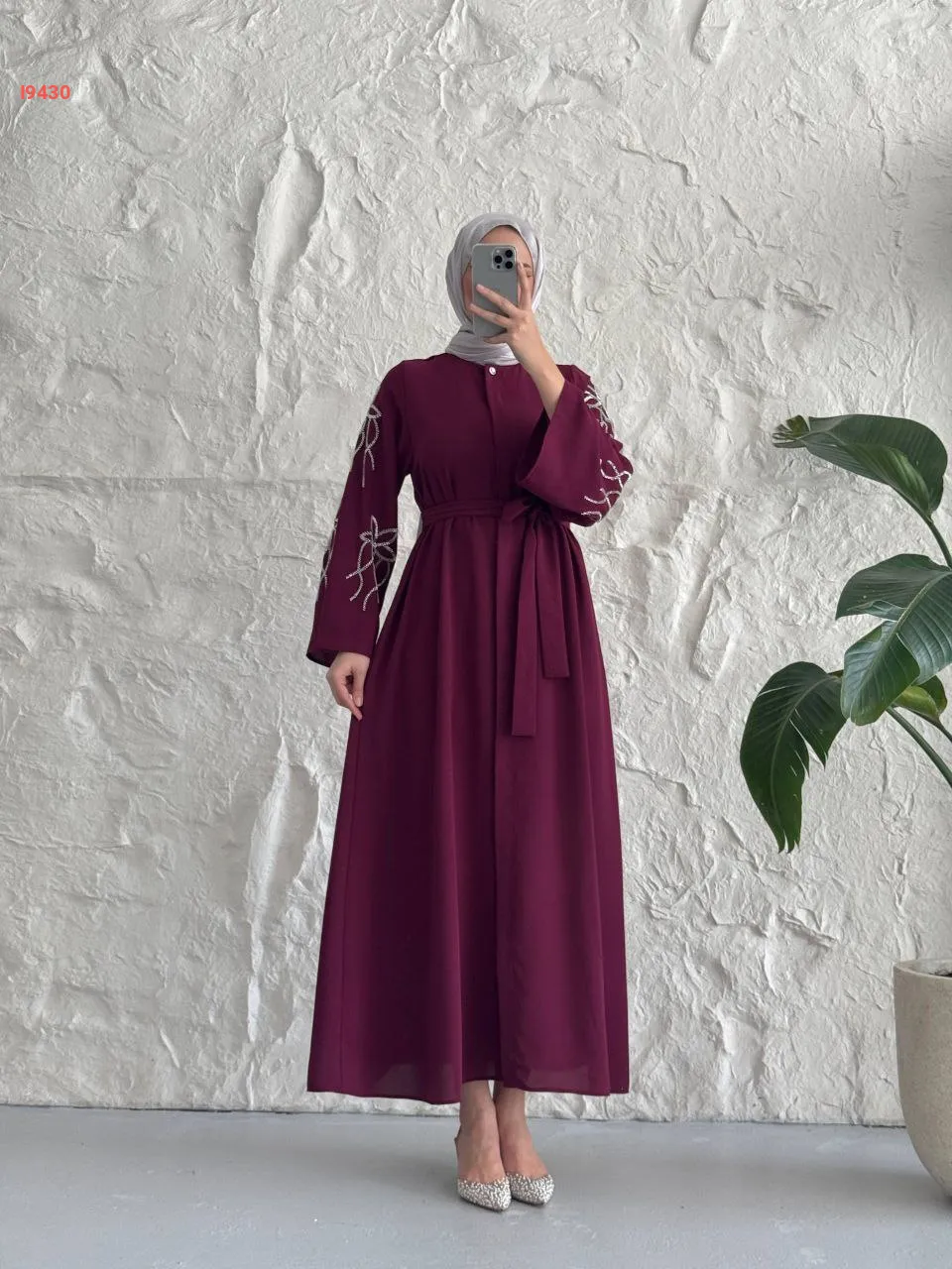 فستان سادة بأزرار مخفية وأكمام مطرزة مع حزام