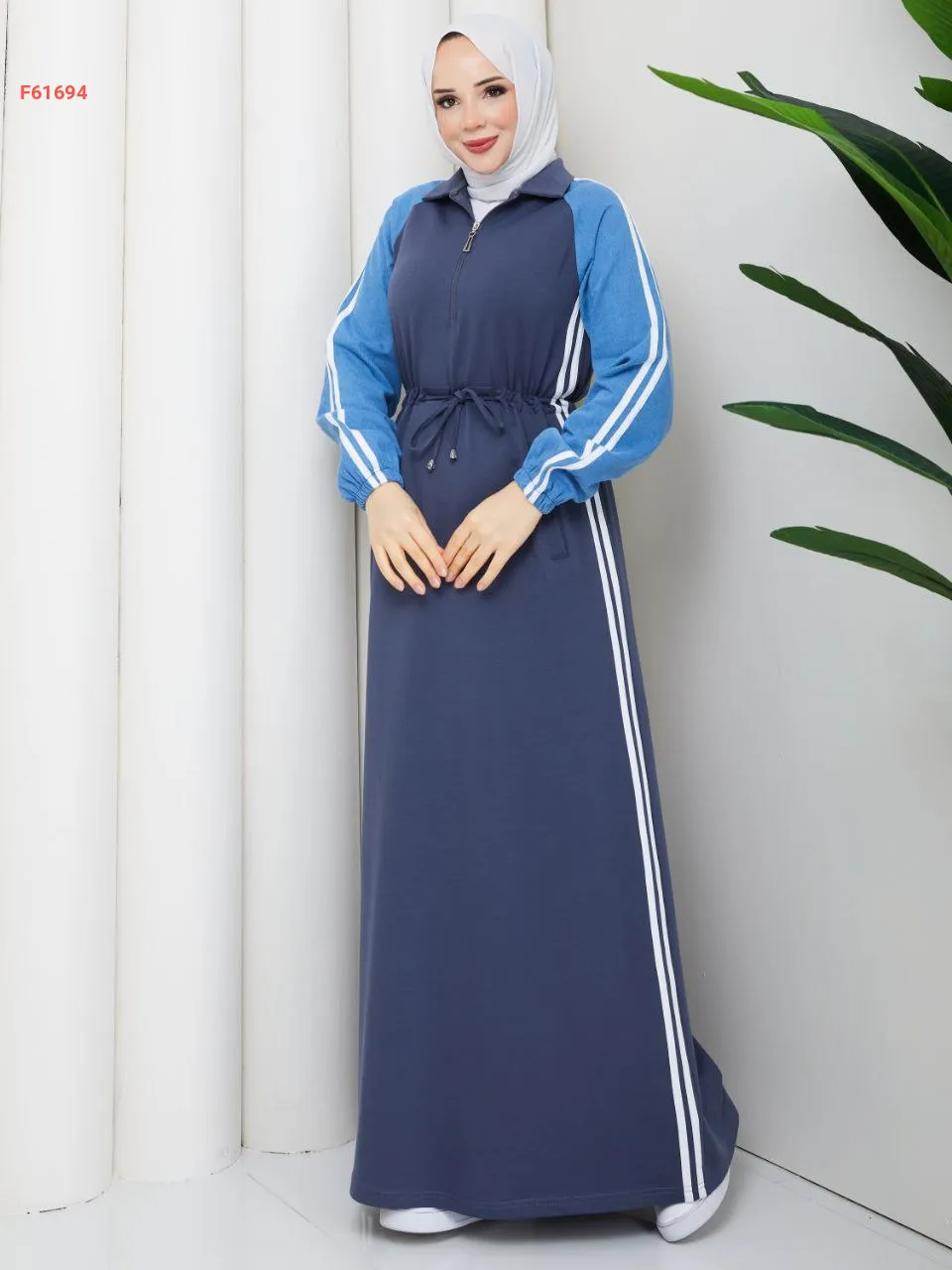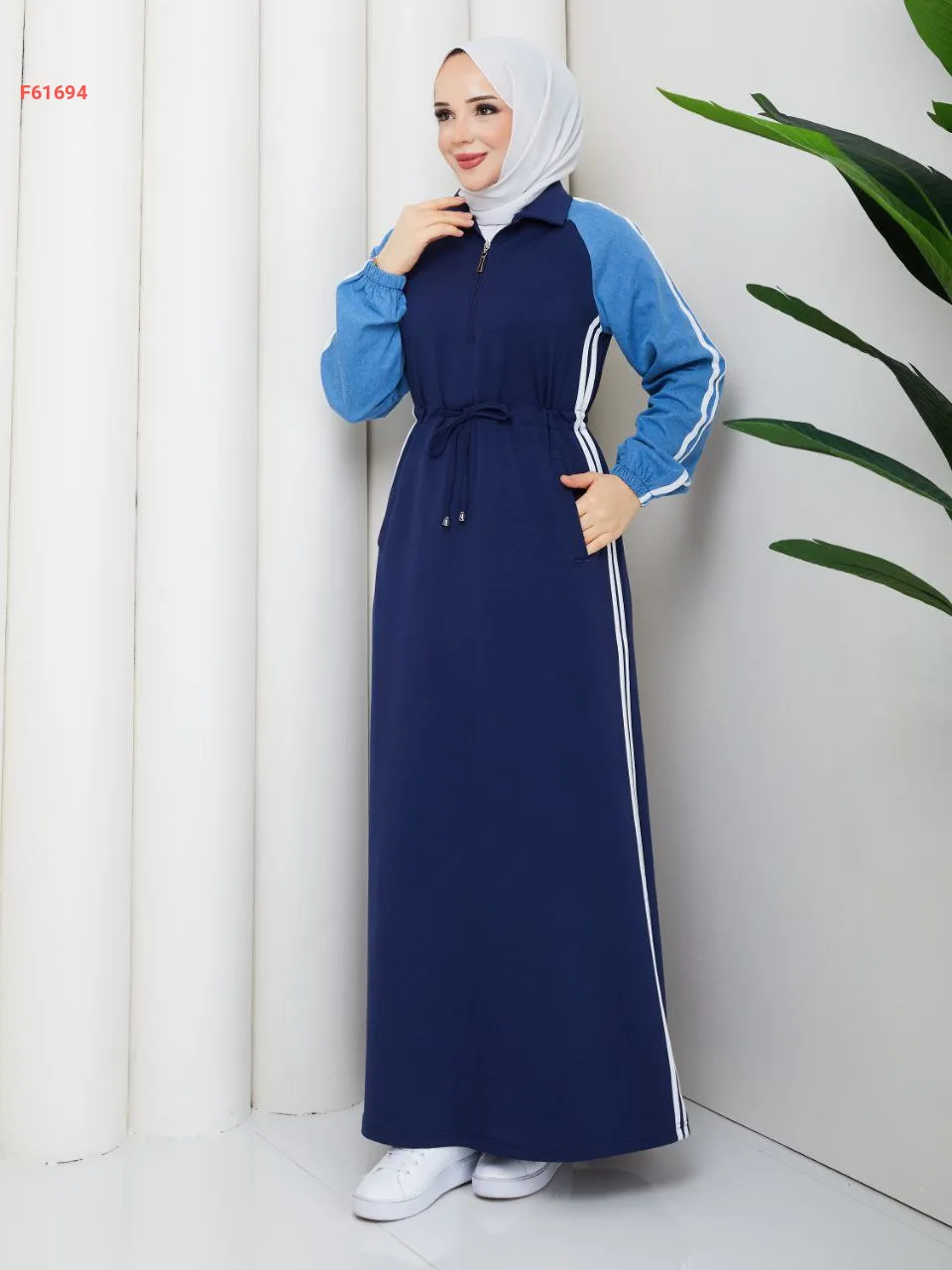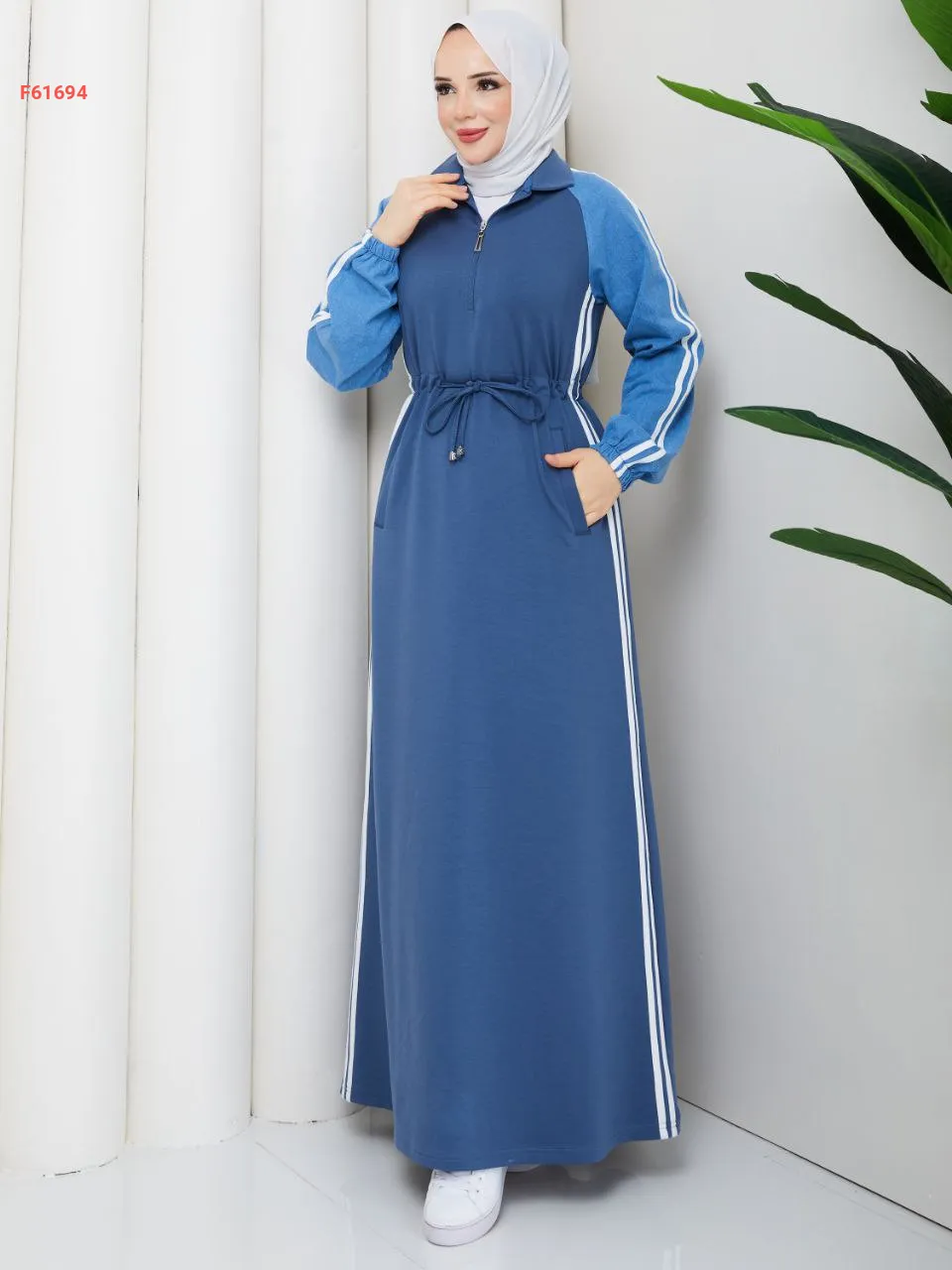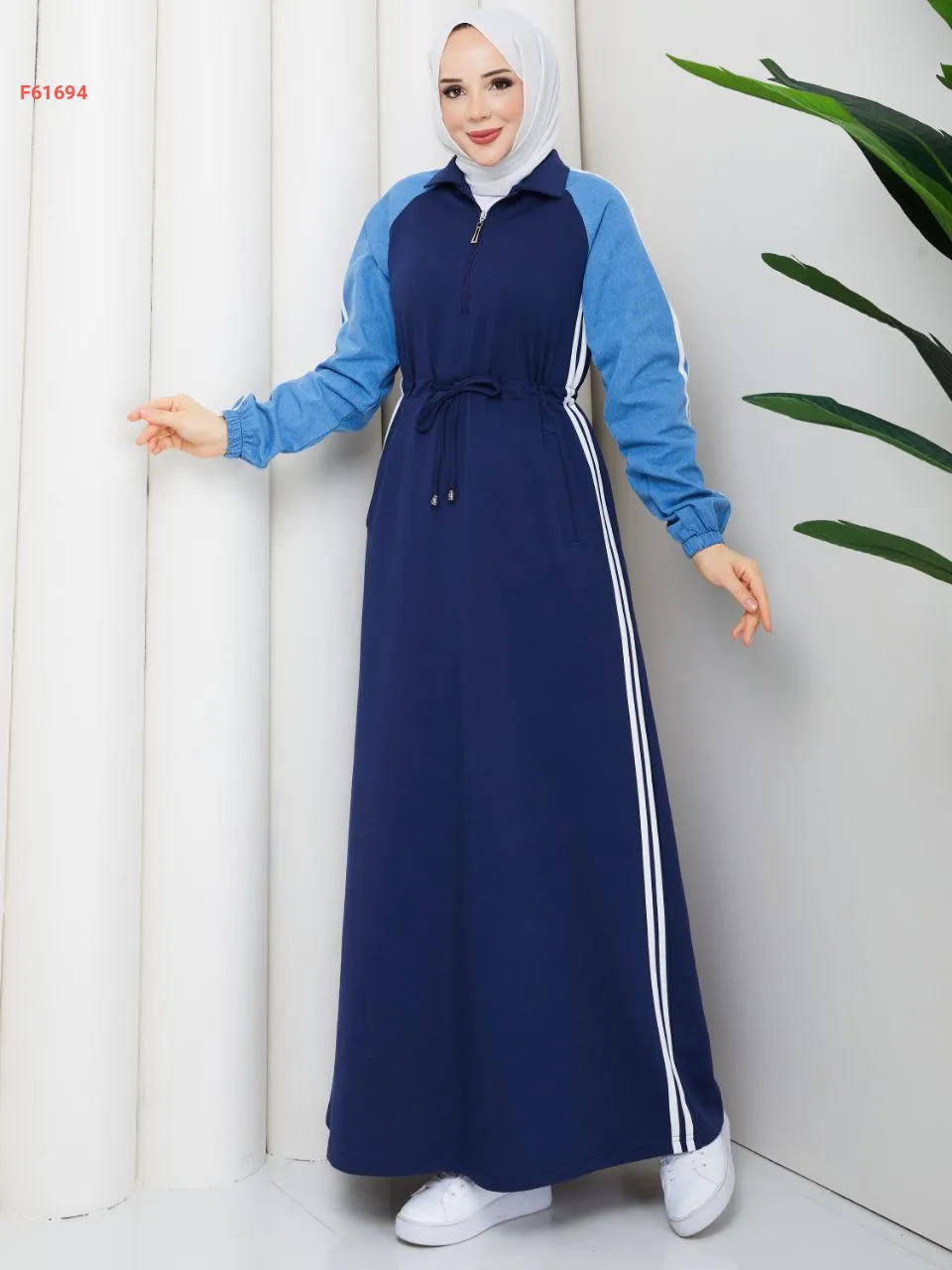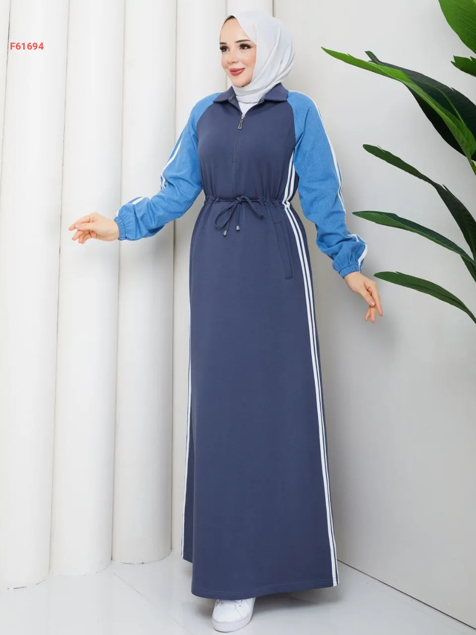 فستان سادة بأكمام جينز مخططة مع زمة خصر ، وباقة بسحاب