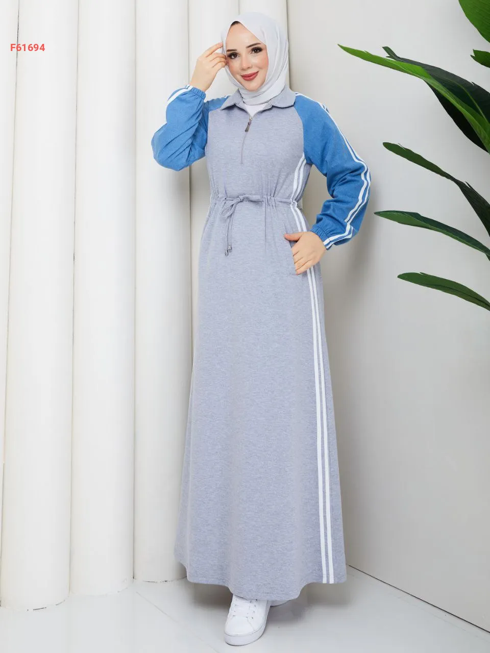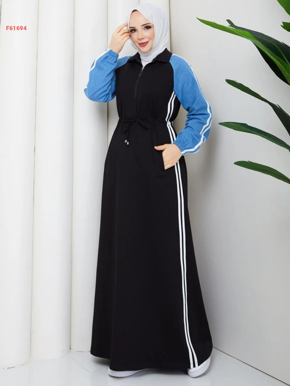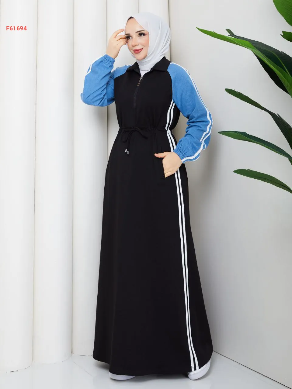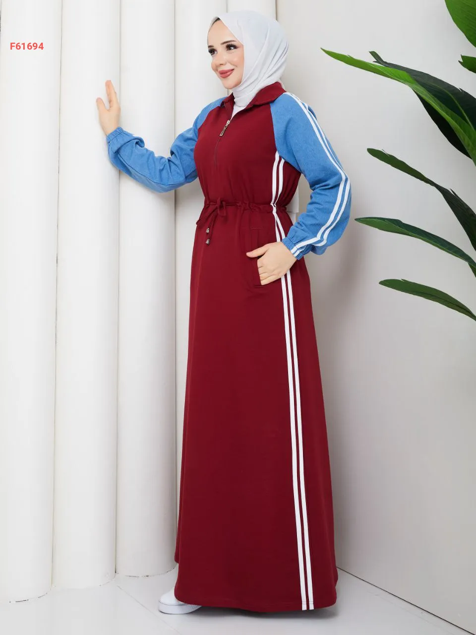 فستان سادة بأكمام جينز مخططة مع زمة خصر ، وباقة بسحاب