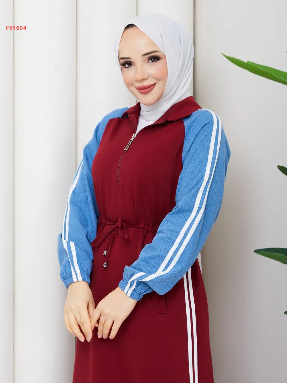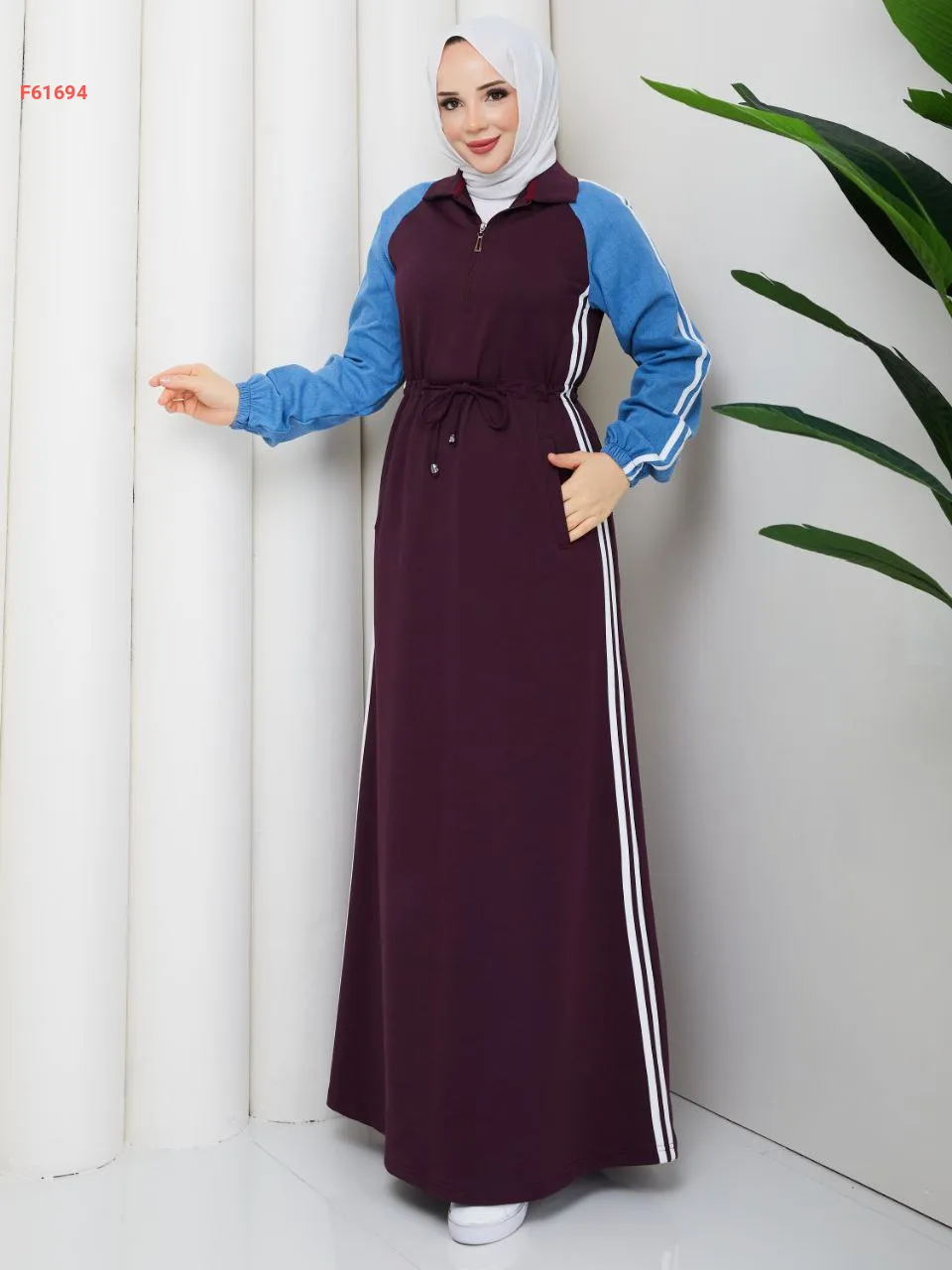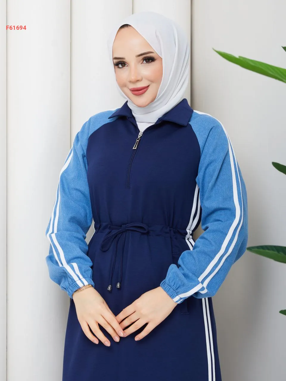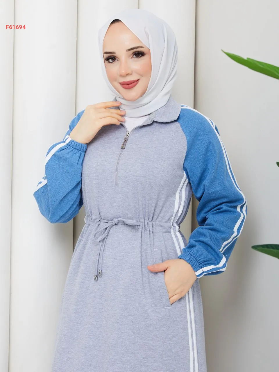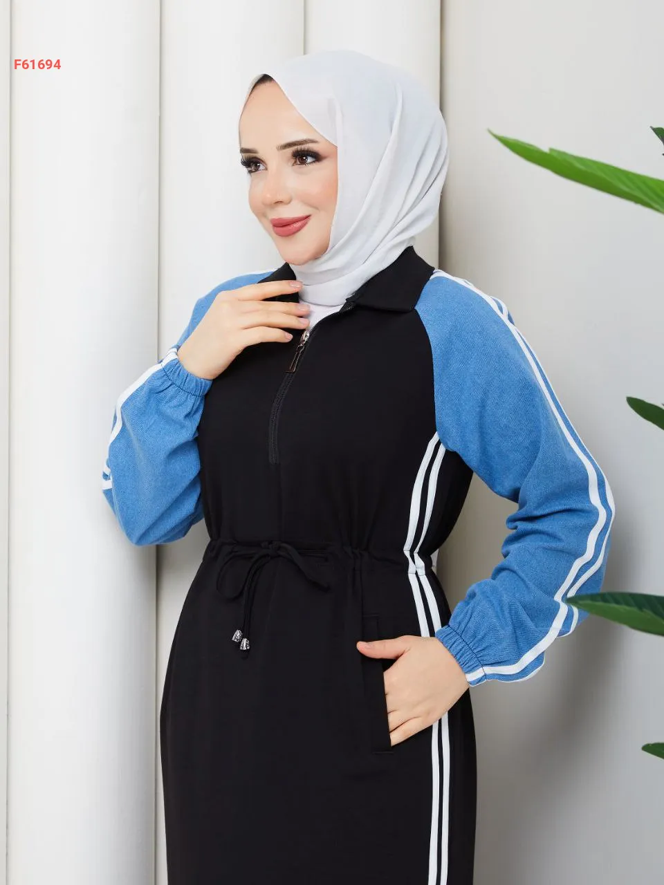 فستان سادة بأكمام جينز مخططة مع زمة خصر ، وباقة بسحاب